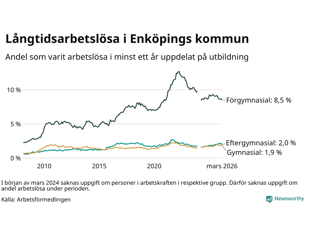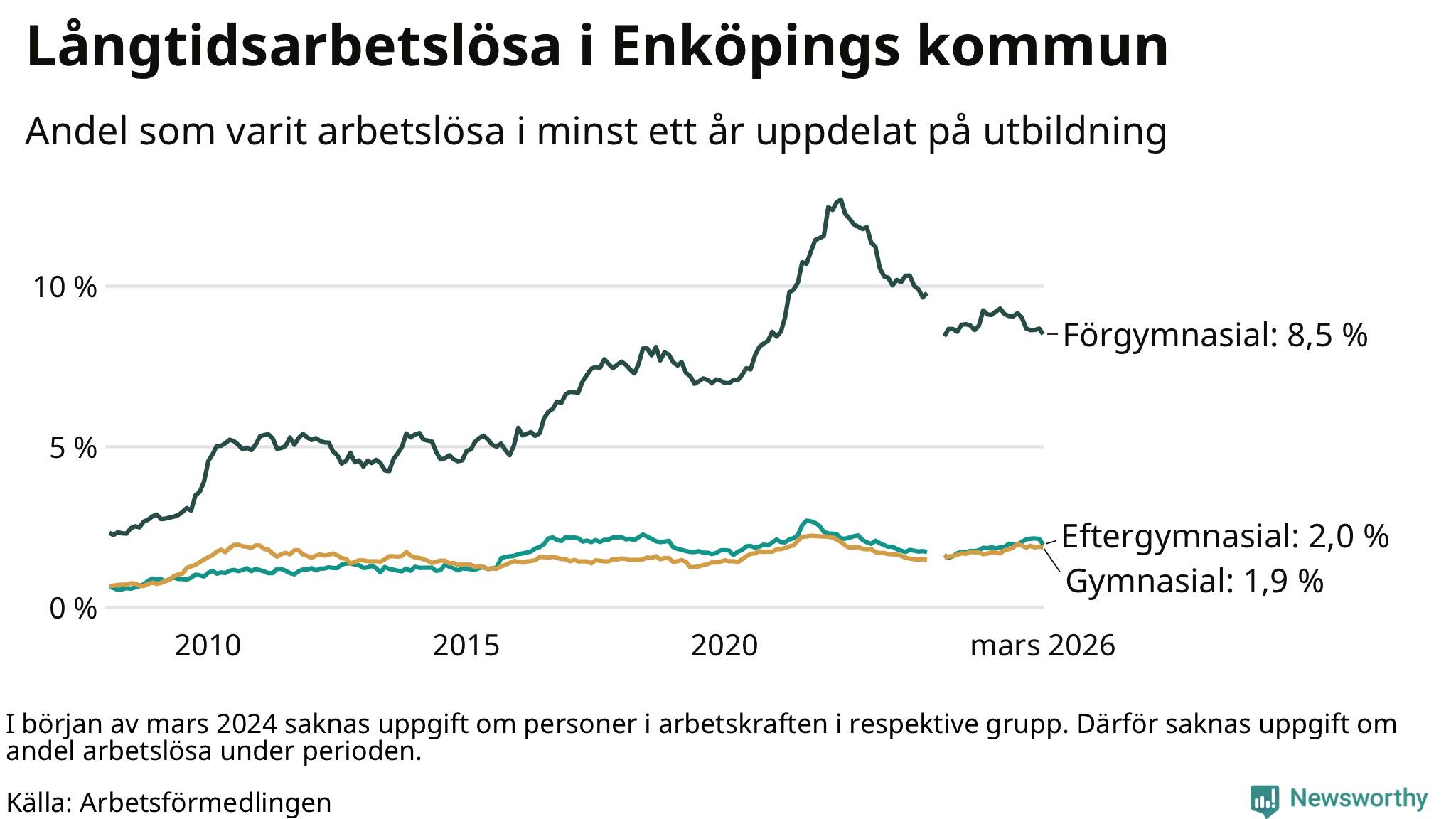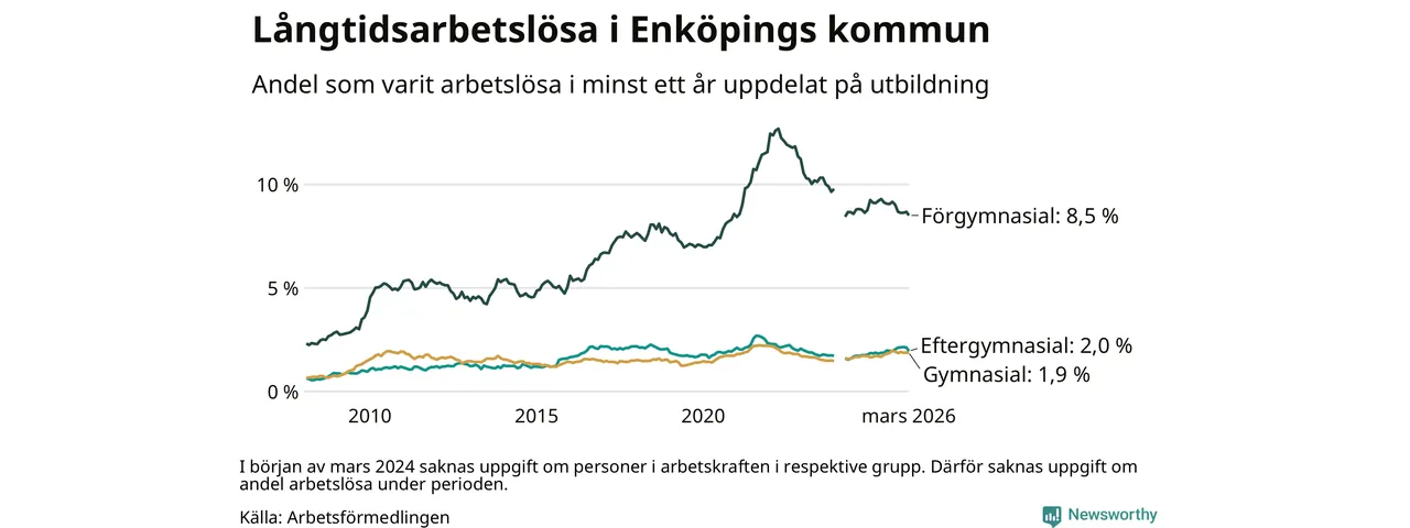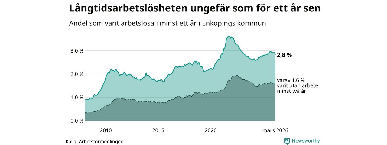 Andelen som varit utan arbete i minst ett år i Enköping var ungefär lika stor i mars jämfört med samma månad för ett år sedan. Det visar Arbetsfömedlingens senaste månadsstatistik.