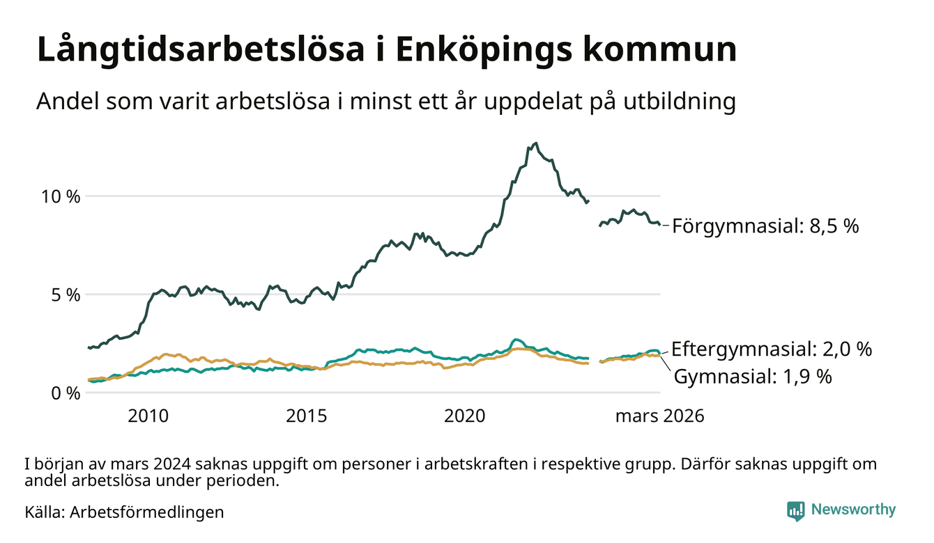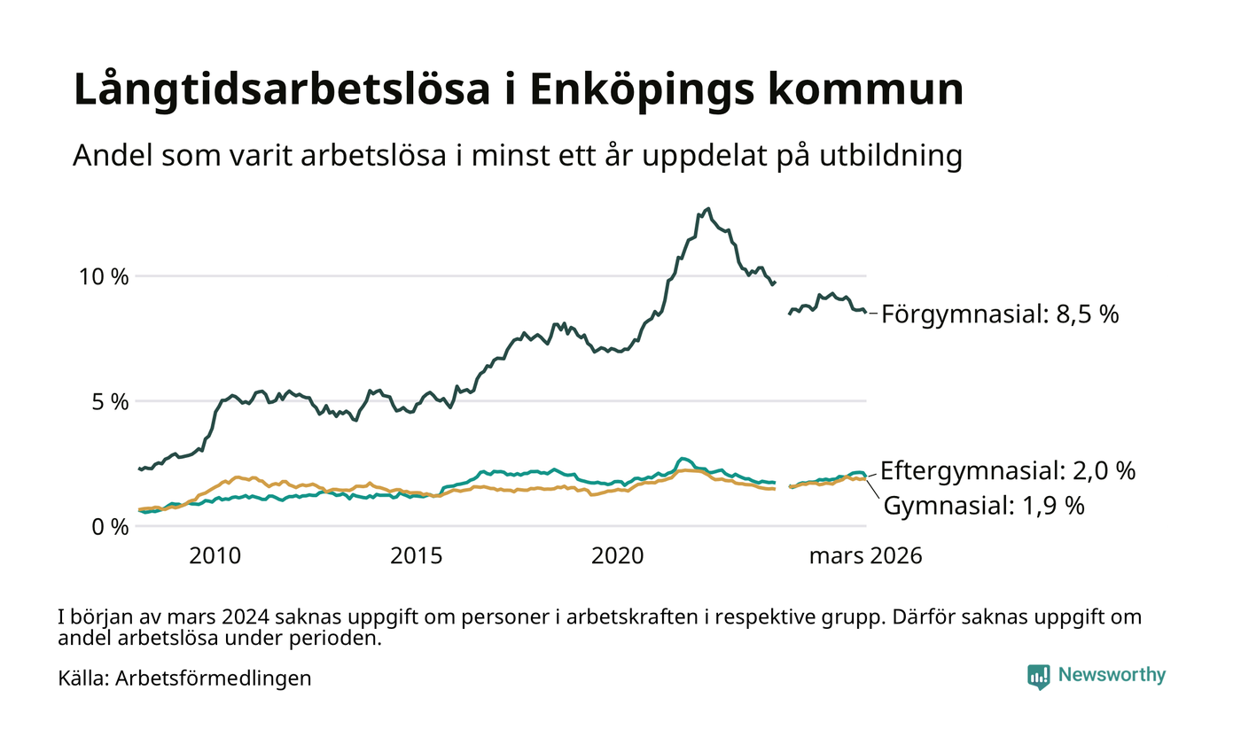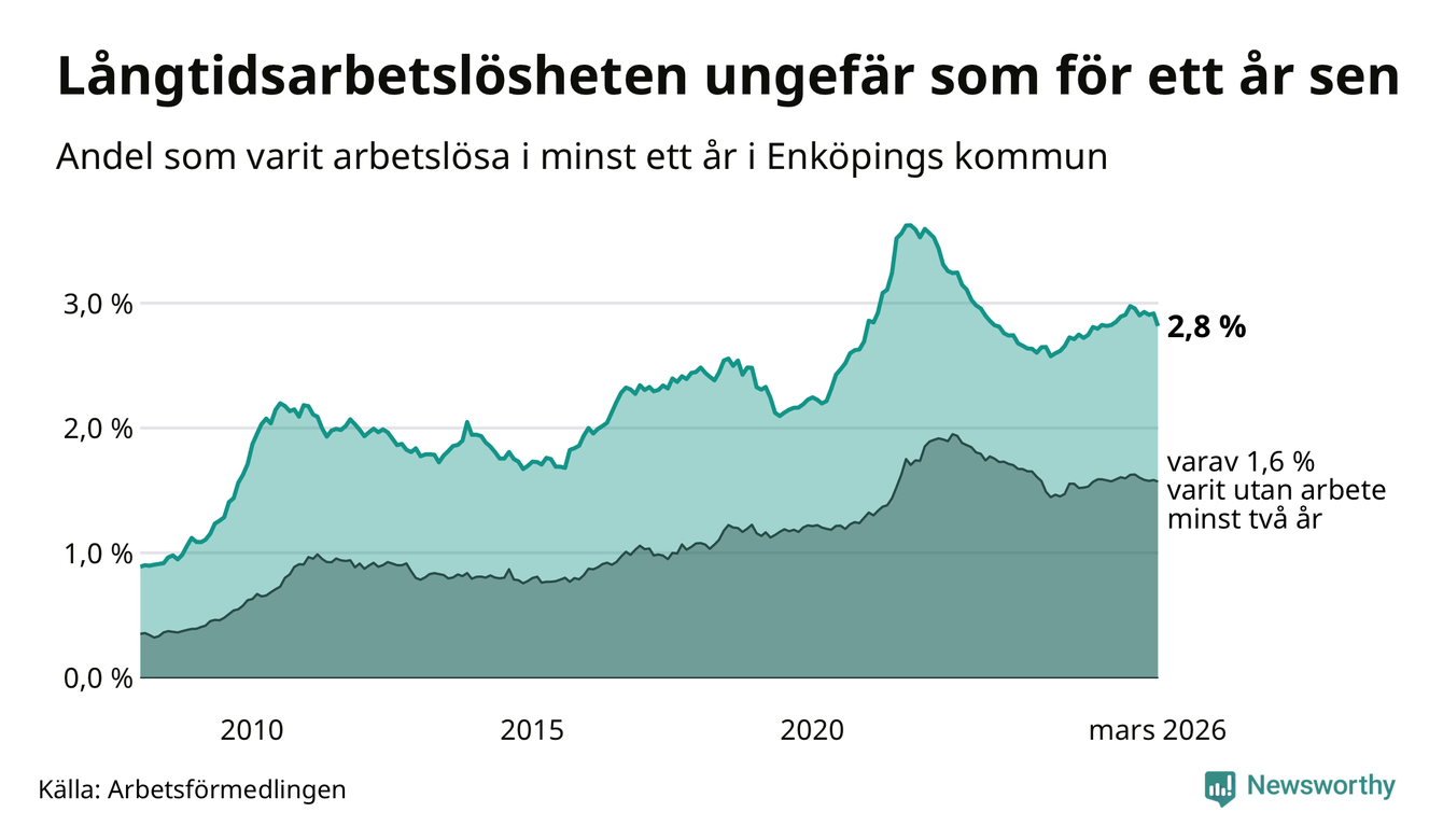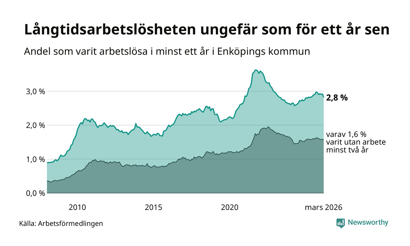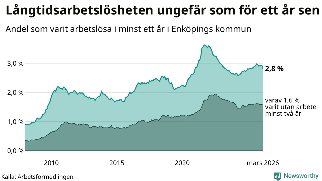 I mars hade 689 Enköpingsbor varit arbetslösa i minst ett år, vilket är 24 färre än månaden innan. 689 personer motsvarar 2,8 procent av arbetskraften i kommunen – andelen långtidsarbetslösa är ungefär på samma nivå som för ett år sedan.