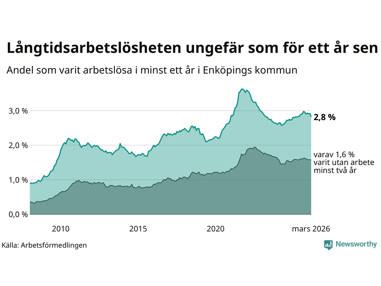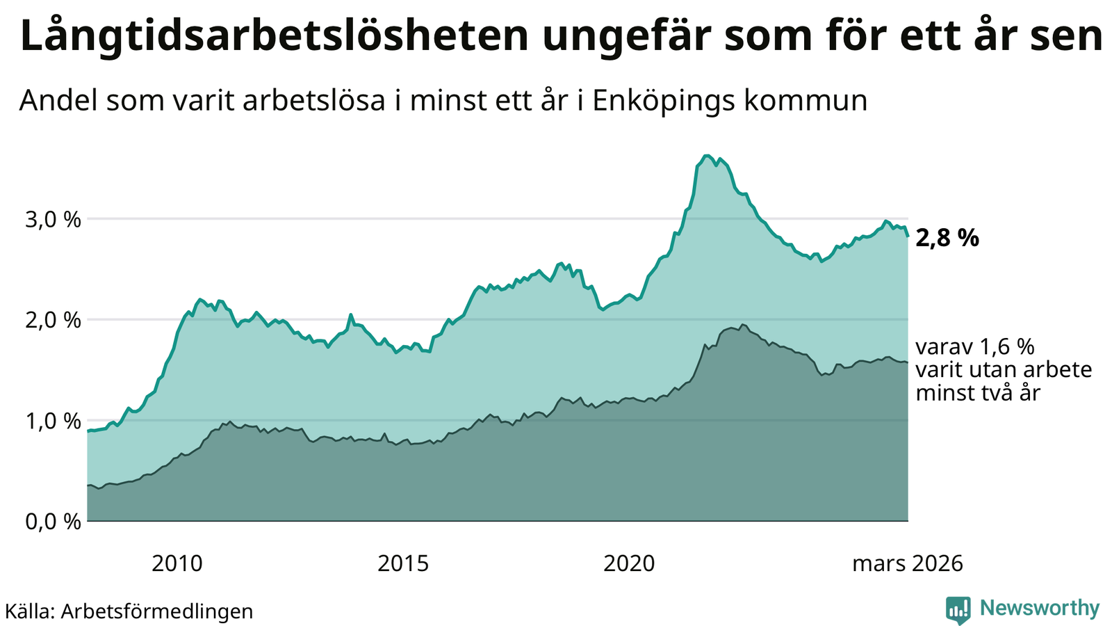 | Andel arbetslösa i minst två år | 1,6 % | 1,3 % | 1,6 % |