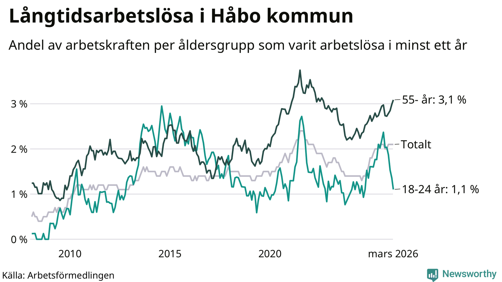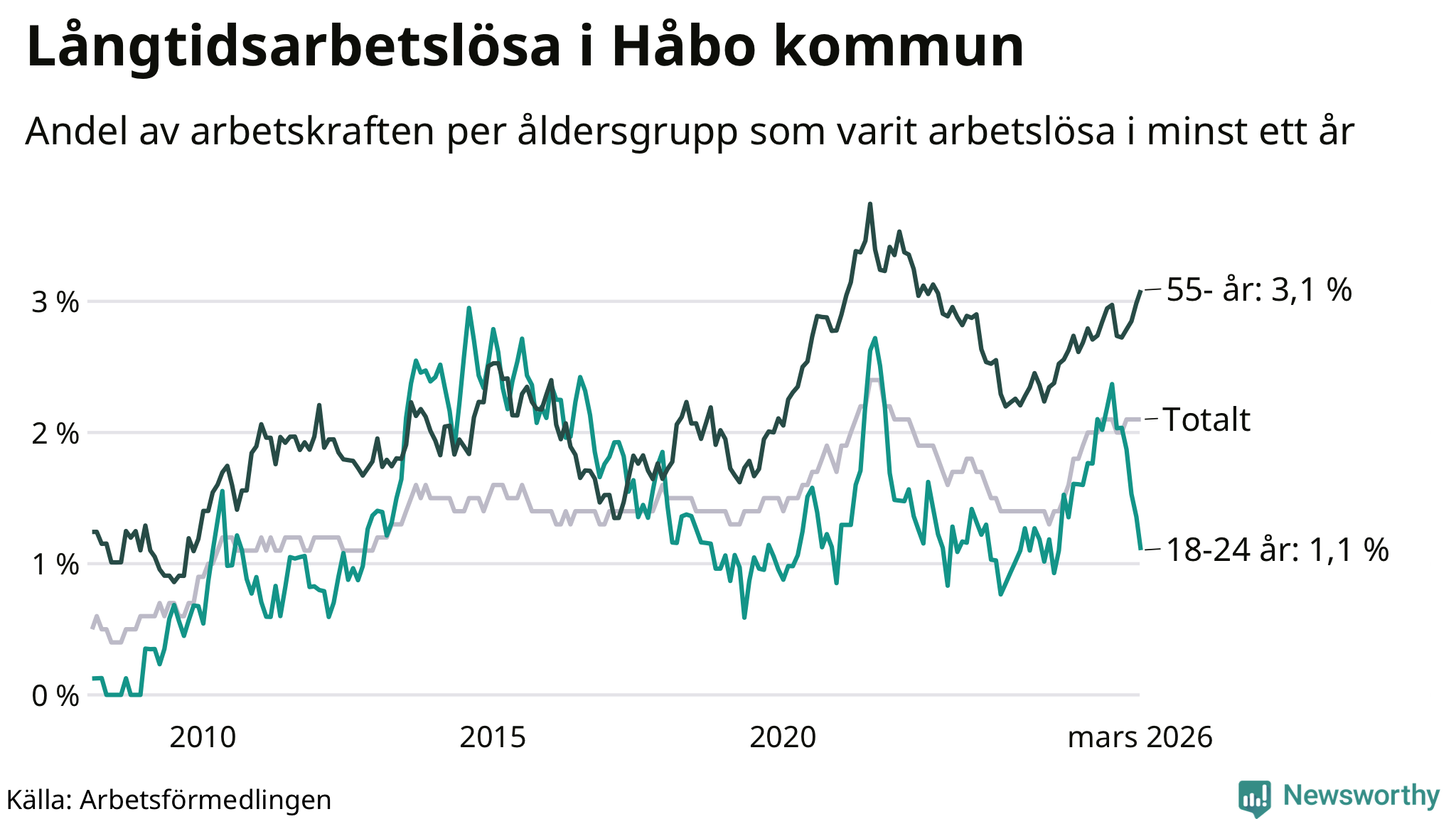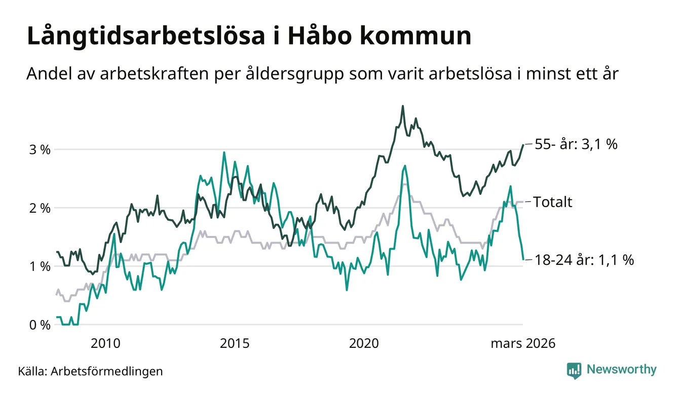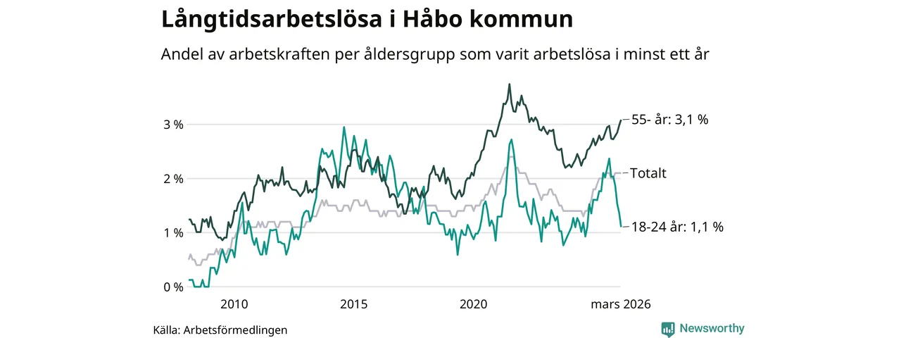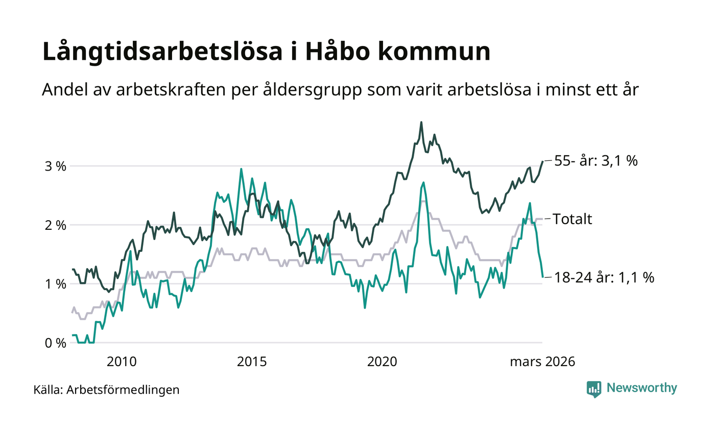 Av de 253 personerna som varit arbetslösa i mer än ett år i Håbo kommun är 84 personer mellan 55 och 661 år och 13 är mellan 18 och 24 år. För den äldre gruppen är andelen arbetslösa 3,1 procent medan den i den yngre gruppen är 1,1 procent. Även i riket som helhet är långtidsarbetslösheten högre i gruppen äldre.