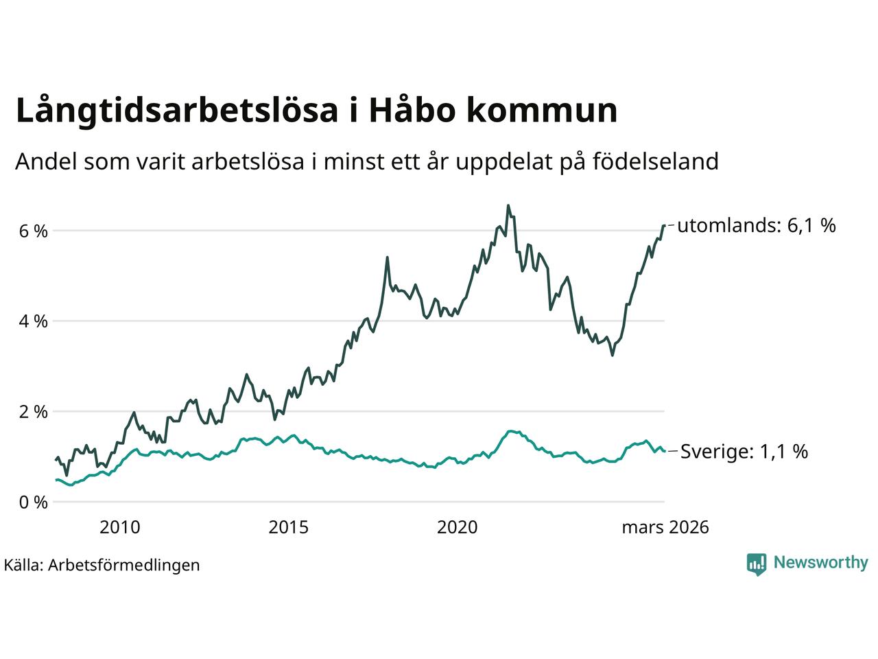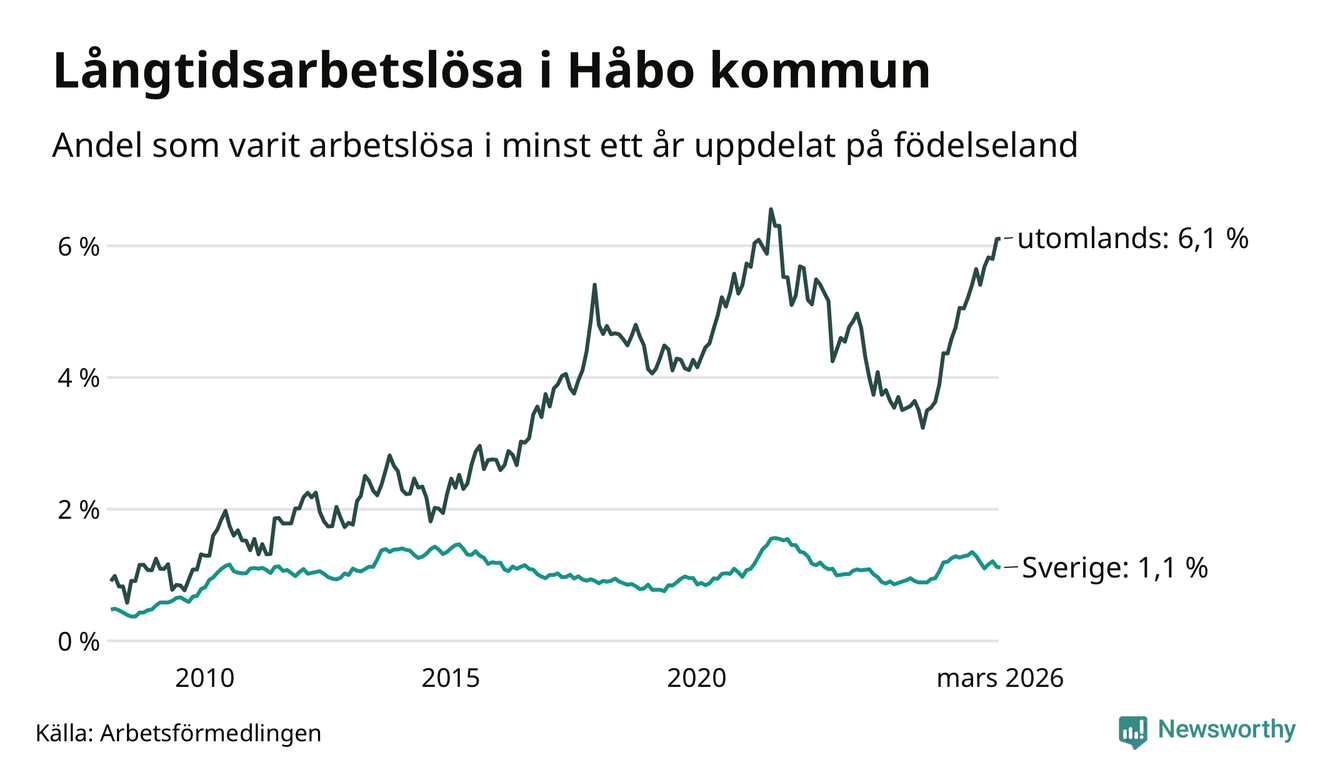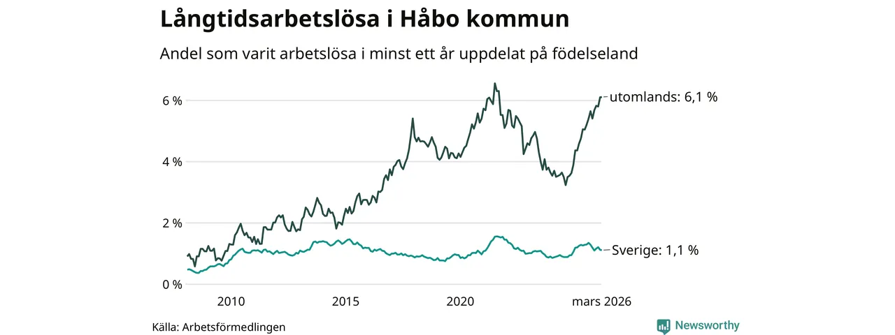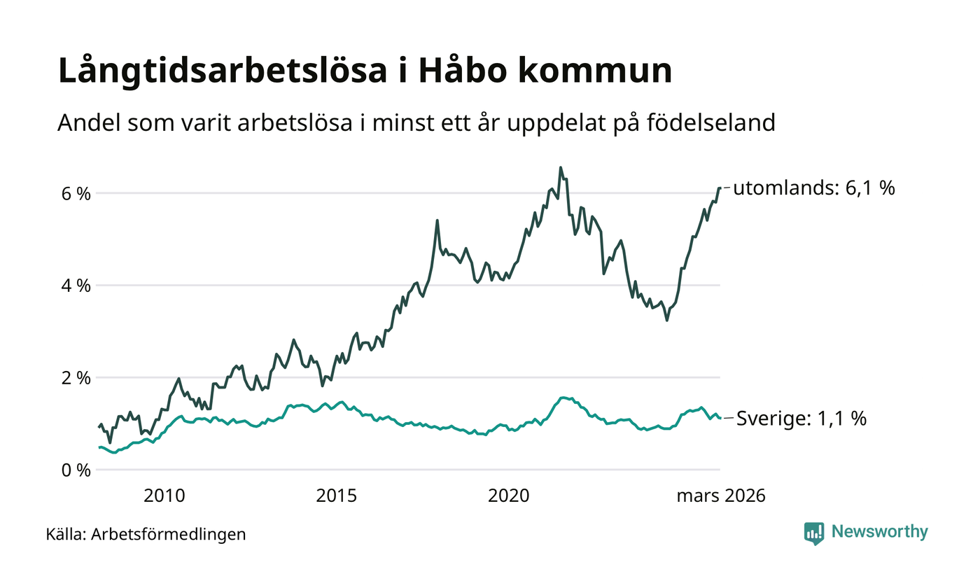 107 av de långtidsarbetslösa i Håbo är födda i Sverige, medan 146 är födda utomlands. Det innebär att långtidsarbetslösheten bland Sverigefödda är 1,1 procent, medan den är sex gånger så hög – 6,1 procent – bland födda utomlands. Även i riket som helhet är arbetslösheten högre bland utrikesfödda.