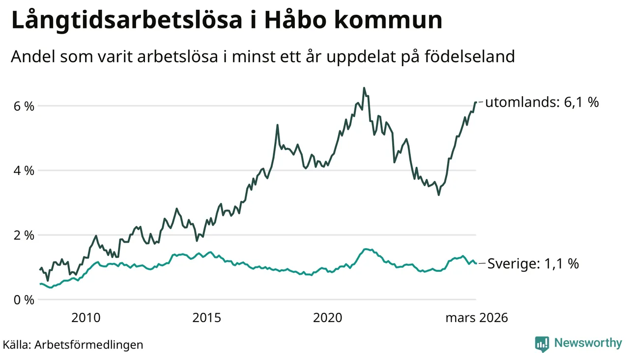 Andelen som varit utan arbete i minst ett år i Håbo var högre i mars jämfört med samma månad för ett år sedan. Det visar Arbetsfömedlingens senaste månadsstatistik.