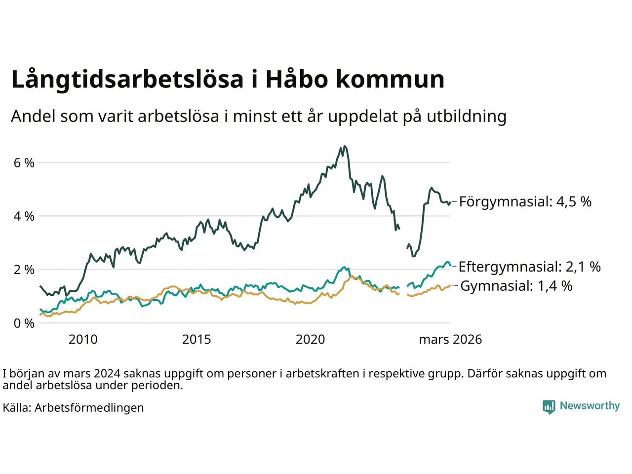 | Andel arbetslösa i minst två år | 1,0 % | 1,3 % | 1,6 % |