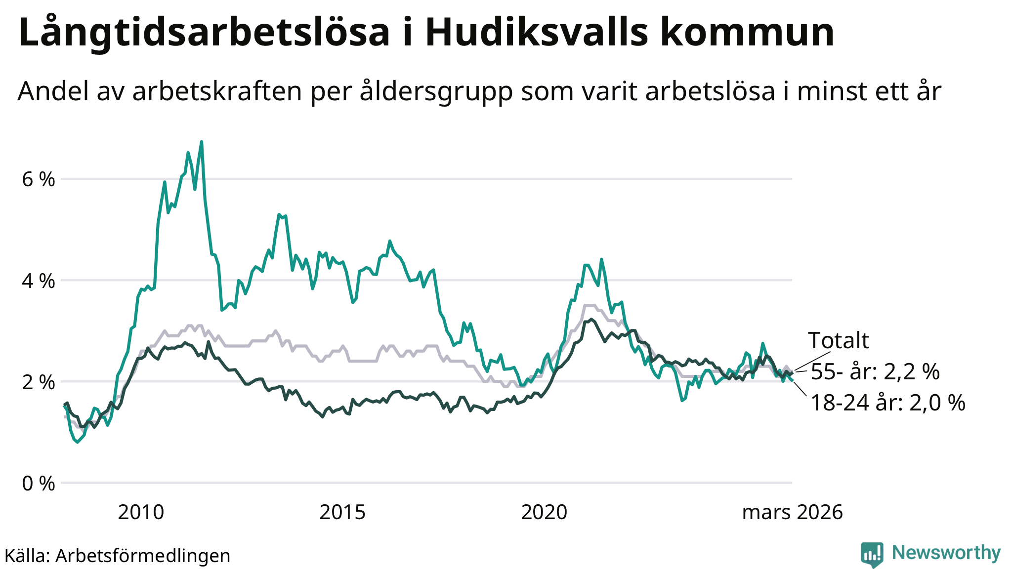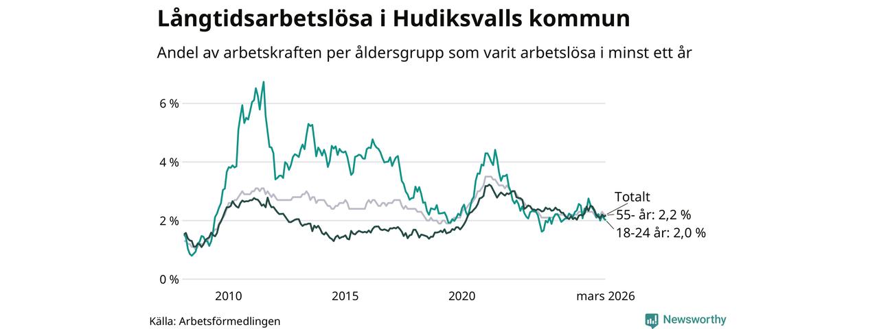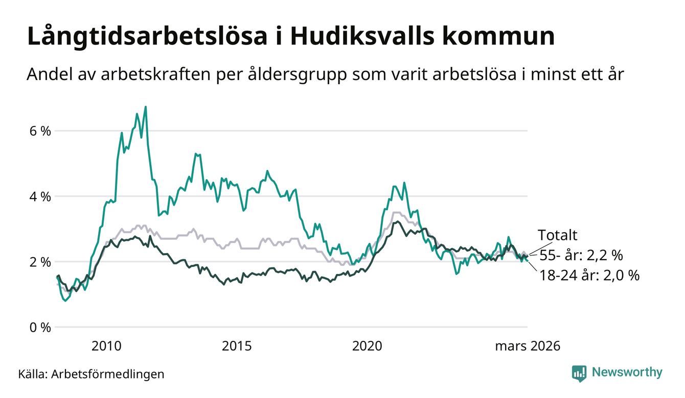 Av de 394 personerna som varit arbetslösa i mer än ett år i Hudiksvalls kommun är 93 personer mellan 55 och 661 år och 36 är mellan 18 och 24 år. För den äldre gruppen är andelen arbetslösa 2,2 procent medan den i den yngre gruppen är 2,0 procent. Även i riket som helhet är långtidsarbetslösheten högre i gruppen äldre.