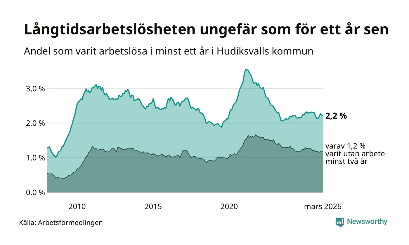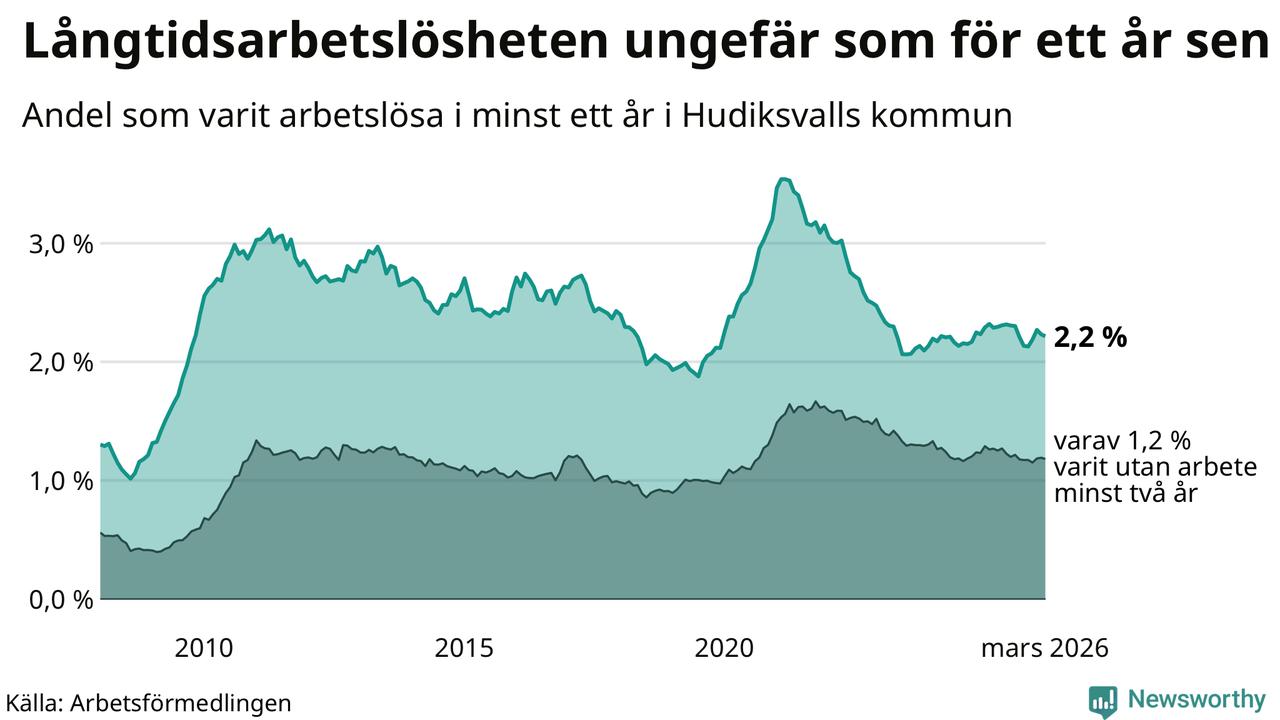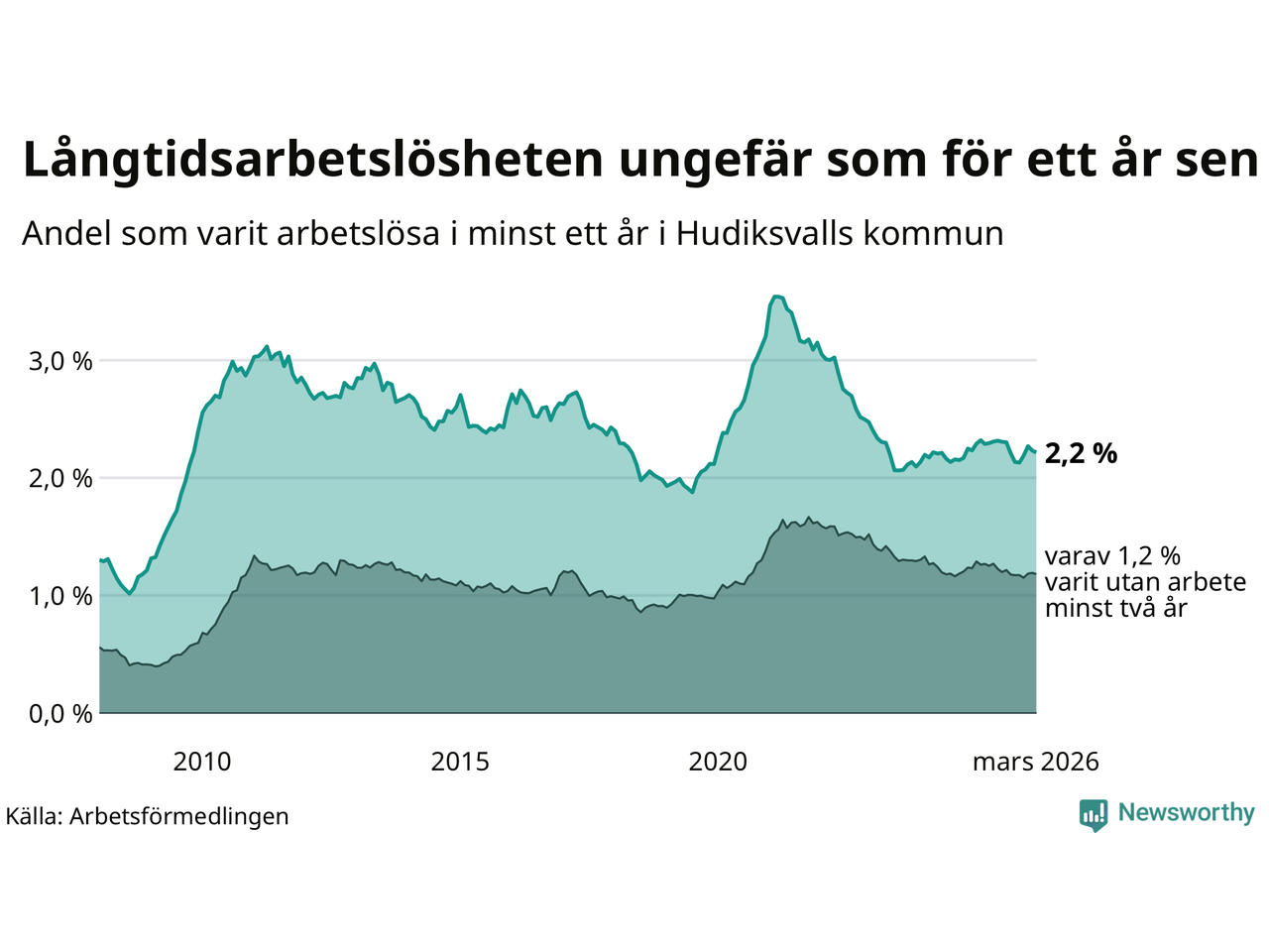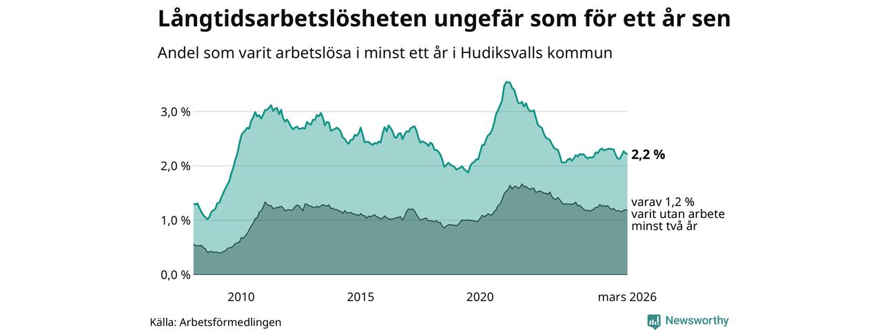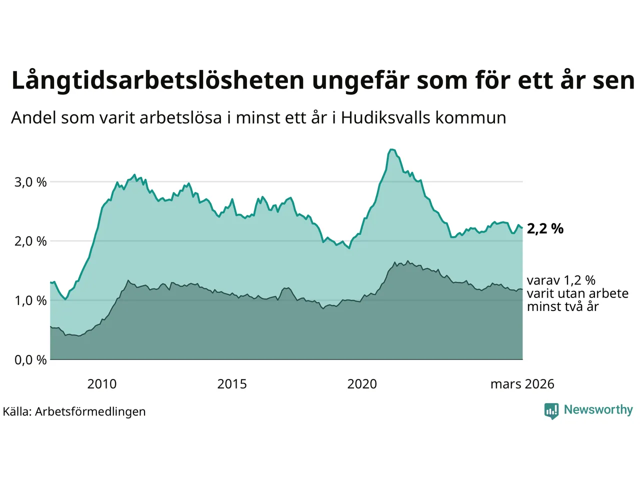 I mars hade 394 Hudiksvallsbor varit arbetslösa i minst ett år, vilket är tre färre än månaden innan. 394 personer motsvarar 2,2 procent av arbetskraften i kommunen – andelen långtidsarbetslösa är ungefär på samma nivå som för ett år sedan.