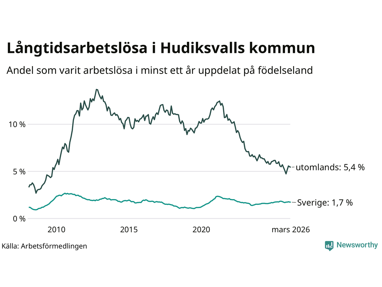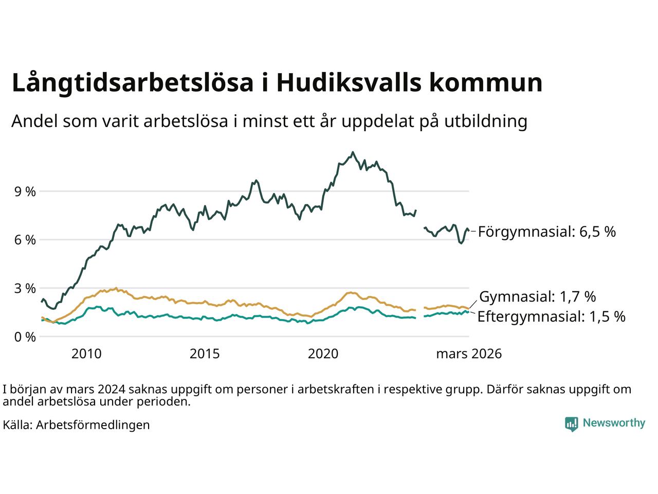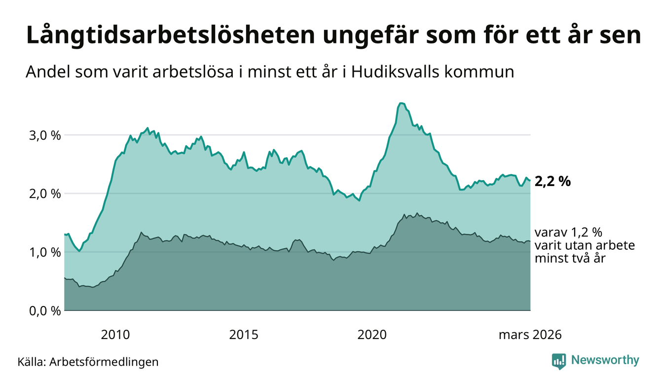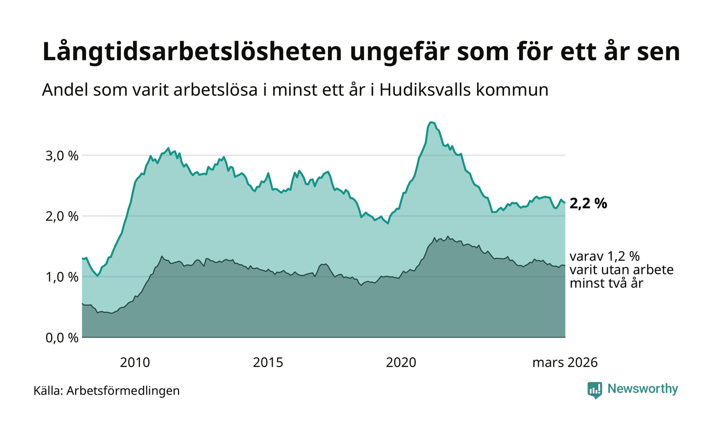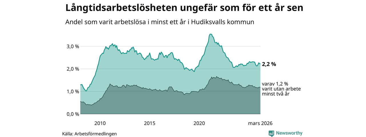 I mars hade 394 Hudiksvallsbor varit arbetslösa i minst ett år, vilket är tre färre än månaden innan. 394 personer motsvarar 2,2 procent av arbetskraften i kommunen – andelen långtidsarbetslösa är ungefär på samma nivå som för ett år sedan.