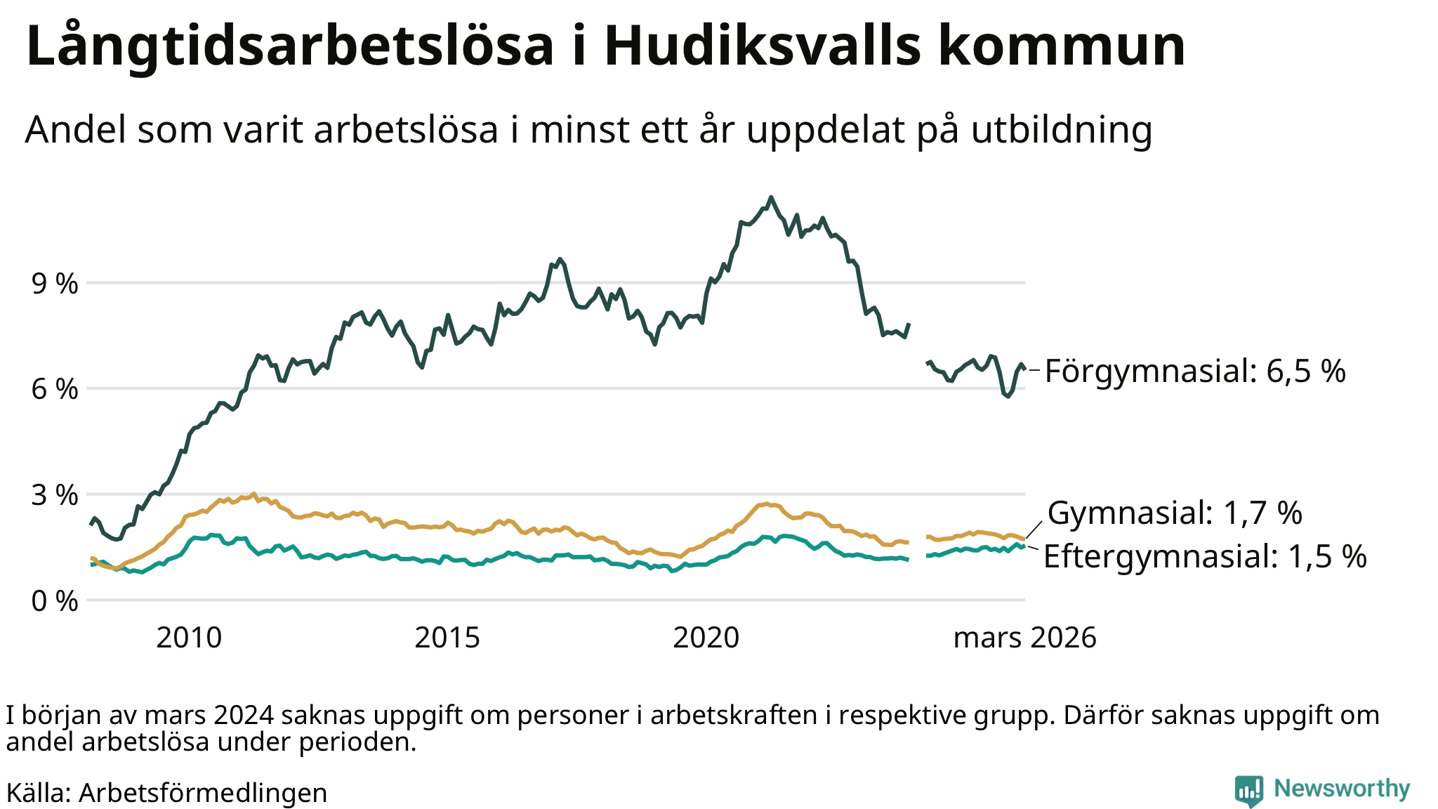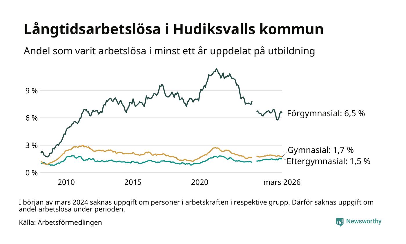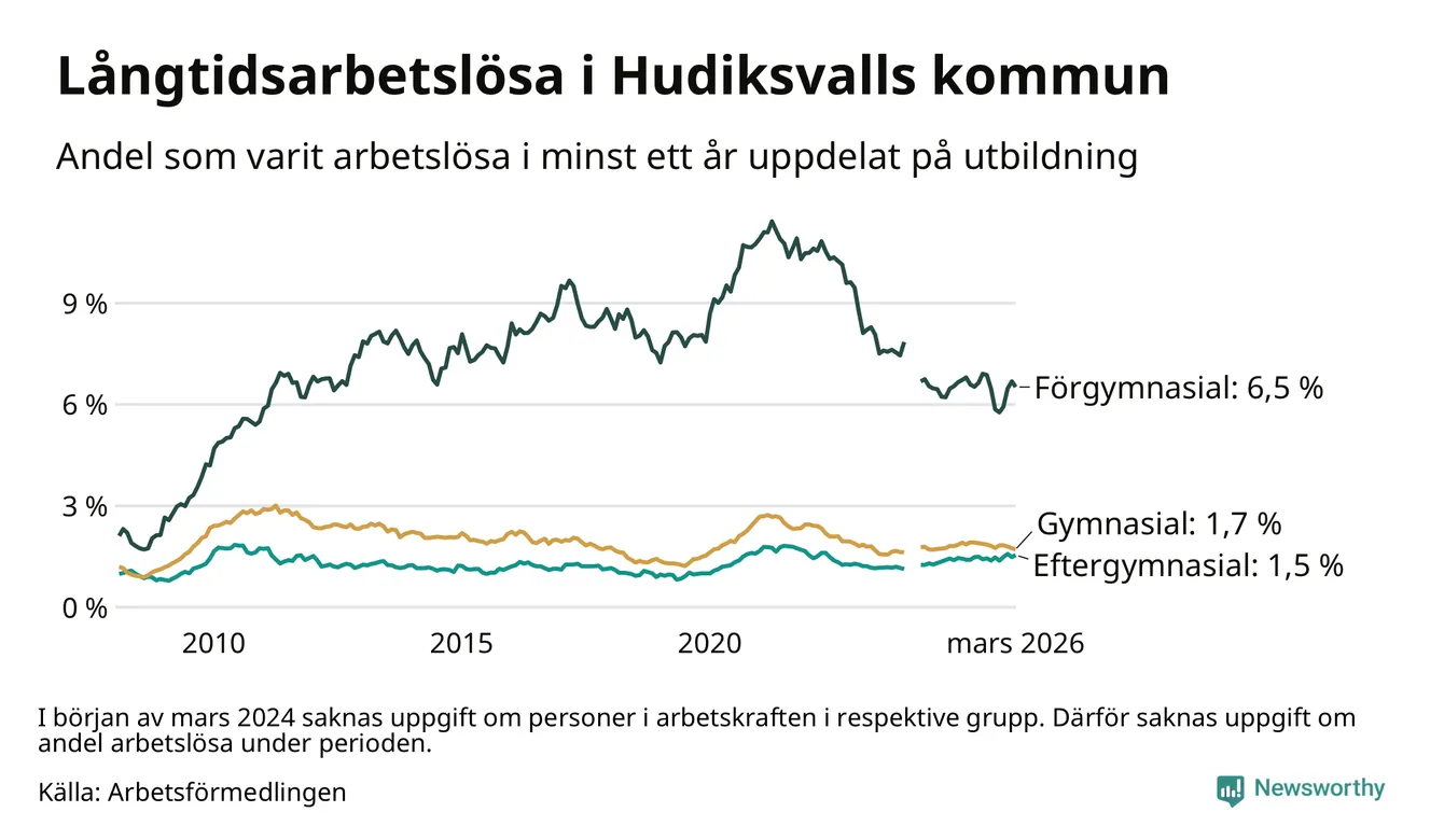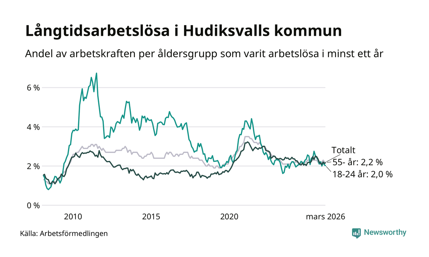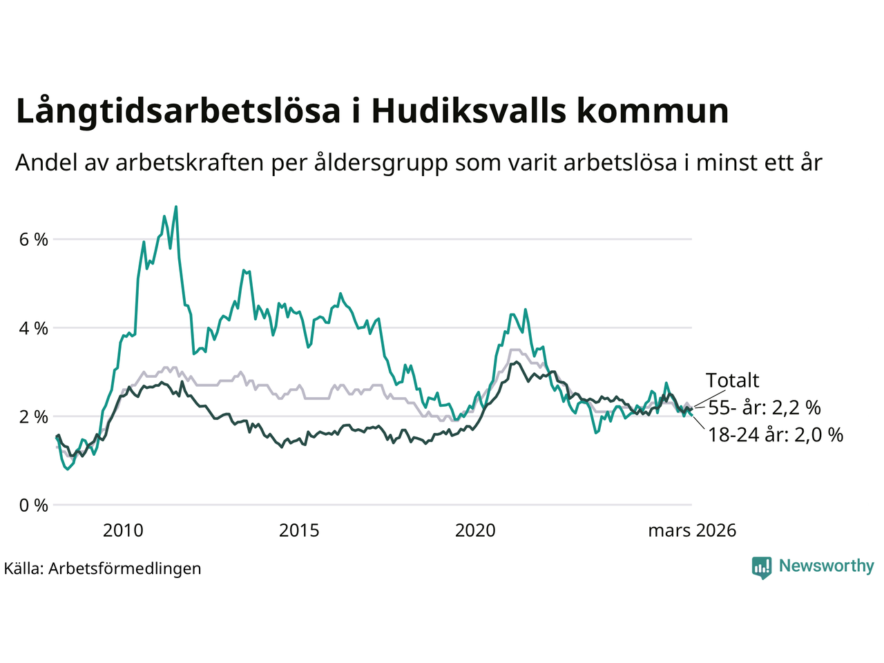 I mars hade 394 Hudiksvallsbor varit arbetslösa i minst ett år, vilket är tre färre än månaden innan. 394 personer motsvarar 2,2 procent av arbetskraften i kommunen – andelen långtidsarbetslösa är ungefär på samma nivå som för ett år sedan.