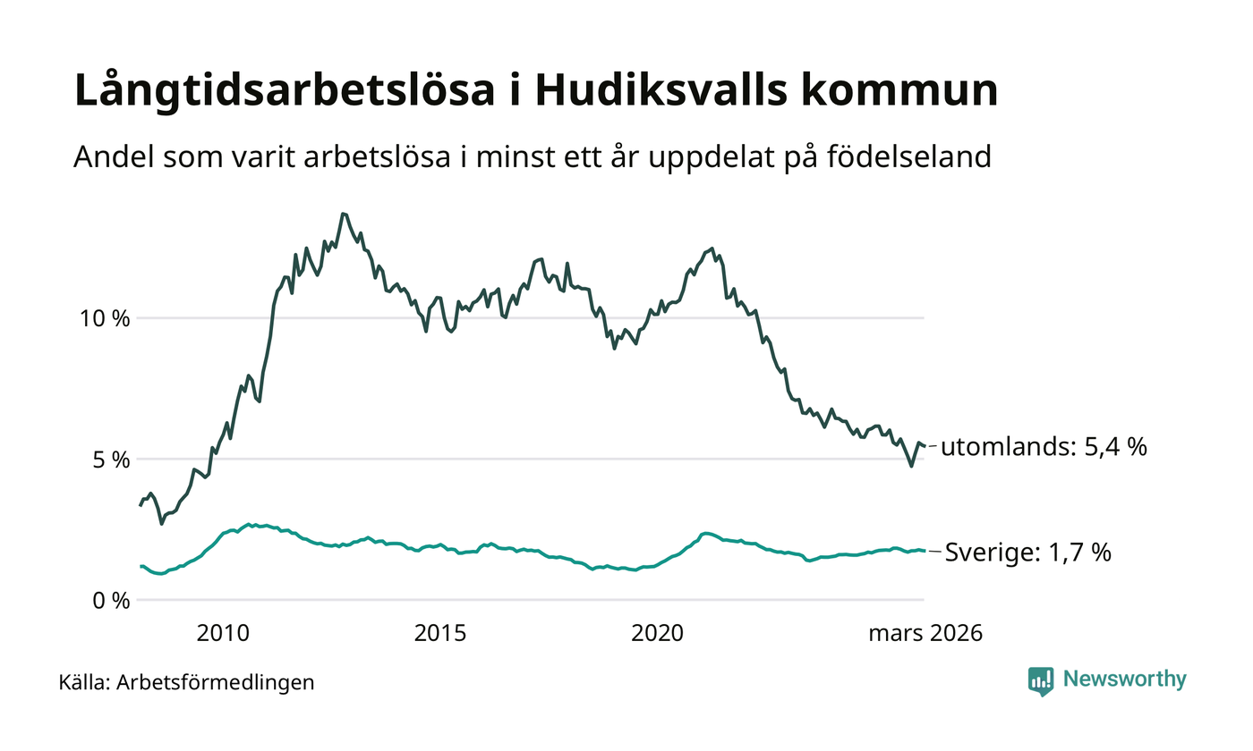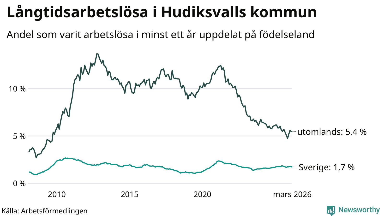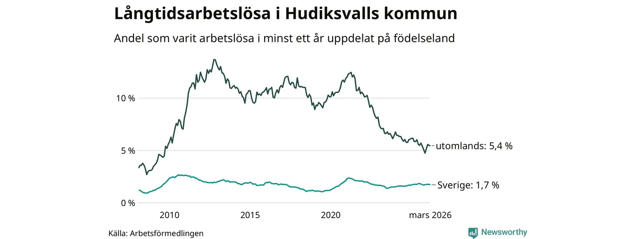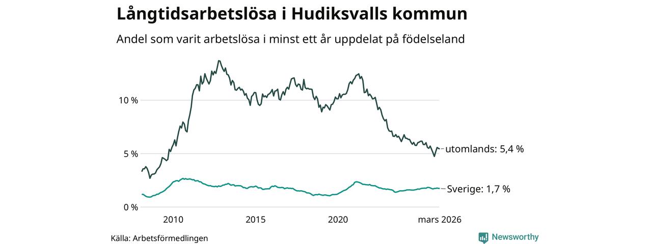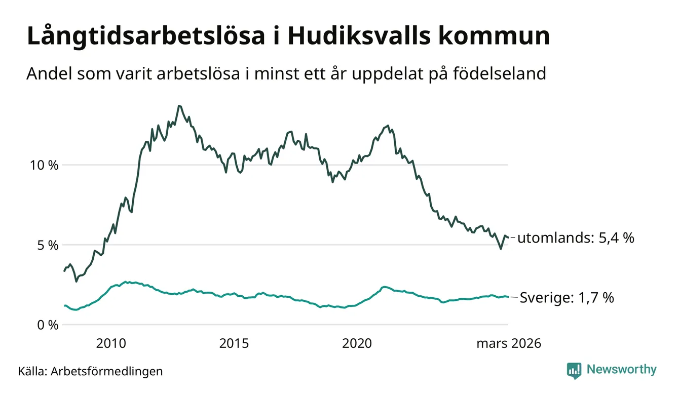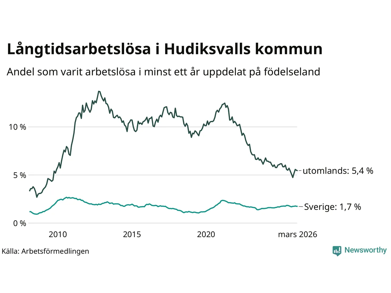 268 av de långtidsarbetslösa i Hudiksvall är födda i Sverige, medan 126 är födda utomlands. Det innebär att långtidsarbetslösheten bland Sverigefödda är 1,7 procent, medan den är tre gånger så hög – 5,4 procent – bland födda utomlands. Även i riket som helhet är arbetslösheten högre bland utrikesfödda.