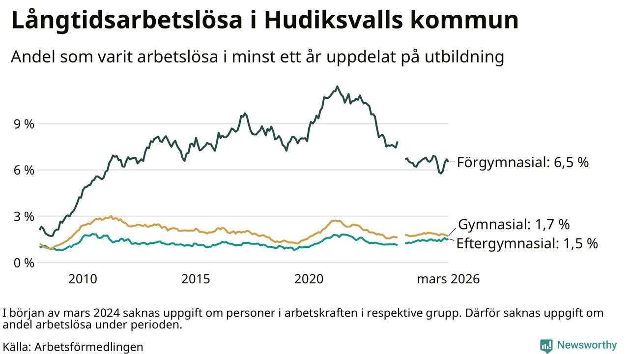 Andelen som varit utan arbete i minst ett år i Hudiksvall var ungefär lika stor i mars jämfört med samma månad för ett år sedan. Det visar Arbetsfömedlingens senaste månadsstatistik.