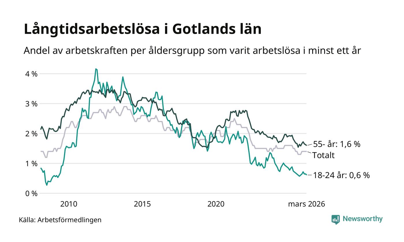Av de 389 personerna som varit arbetslösa i mer än ett år i Gotlands län är 117 personer mellan 55 och 661 år och 17 är mellan 18 och 24 år. För den äldre gruppen är andelen arbetslösa 1,6 procent medan den i den yngre gruppen är 0,6 procent. Även i riket som helhet är långtidsarbetslösheten högre i gruppen äldre.