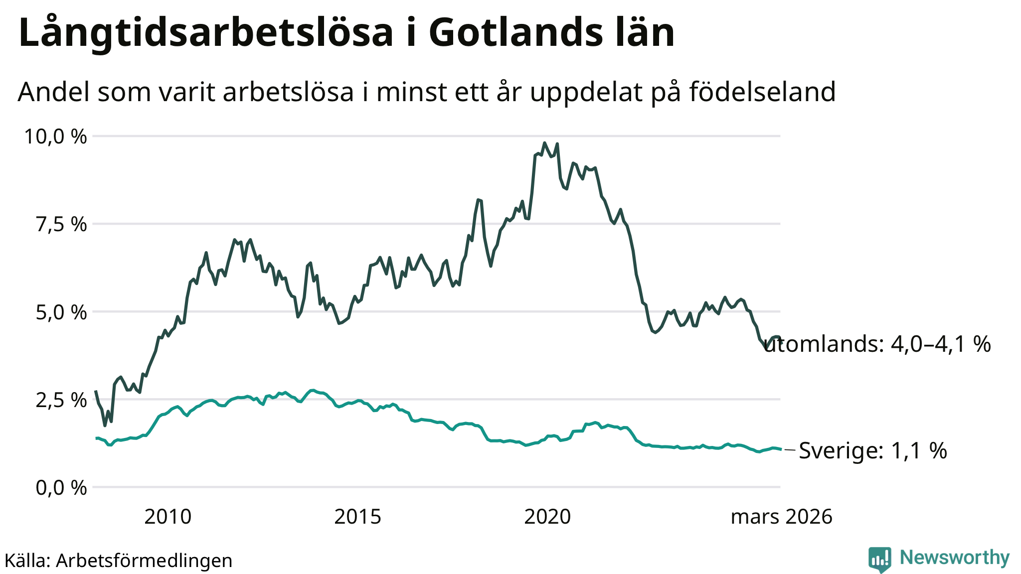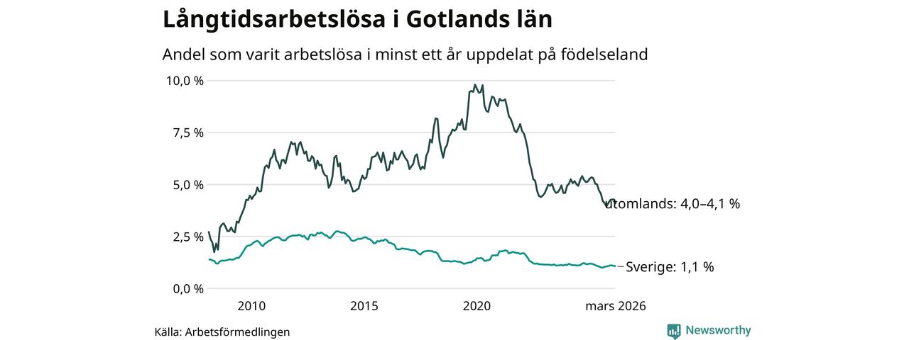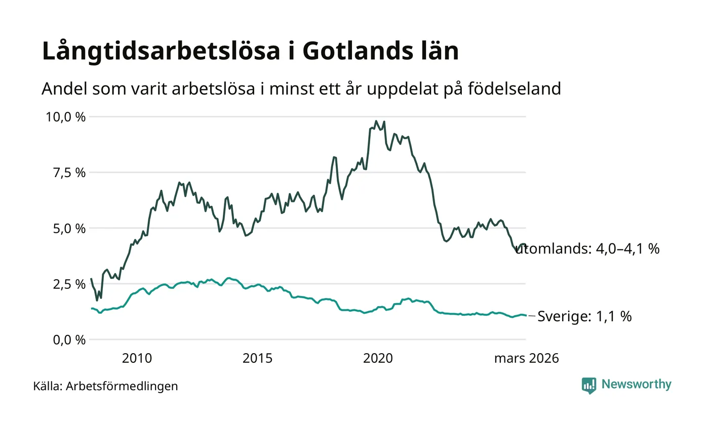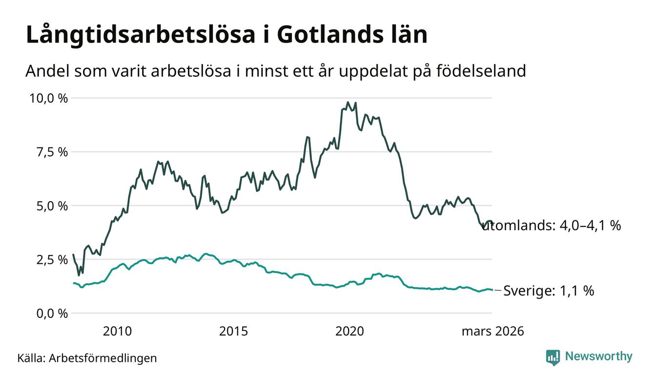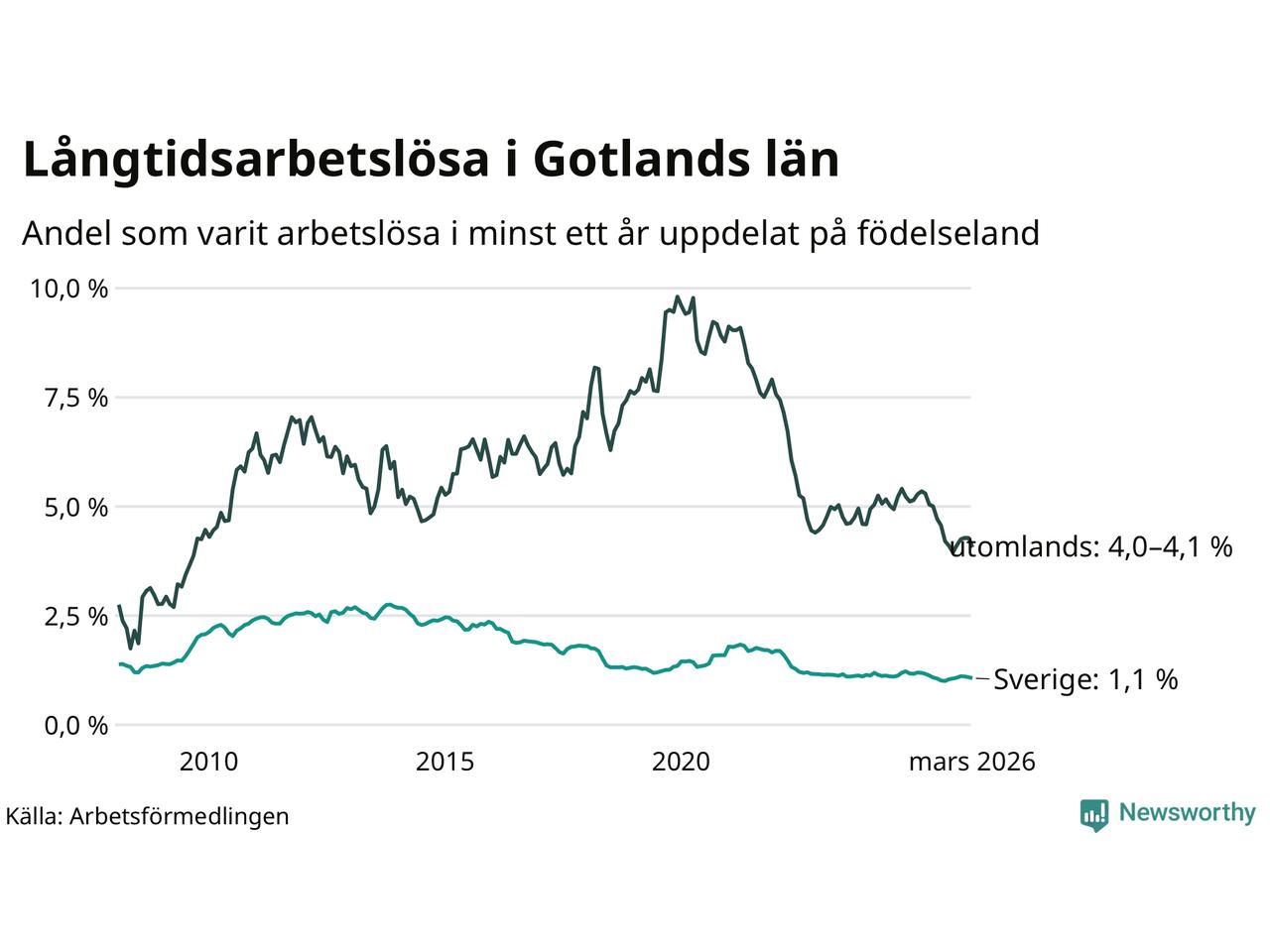 274 av de långtidsarbetslösa på Gotland är födda i Sverige och mellan 116 och 119 är födda utomlands. Det innebär att långtidsarbetslösheten bland Sverigefödda är 1,1 procent, medan den ligger mellan 4,0 och 4,1 procent för utlandsfödda.