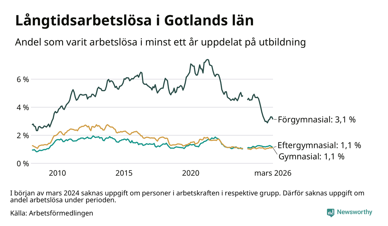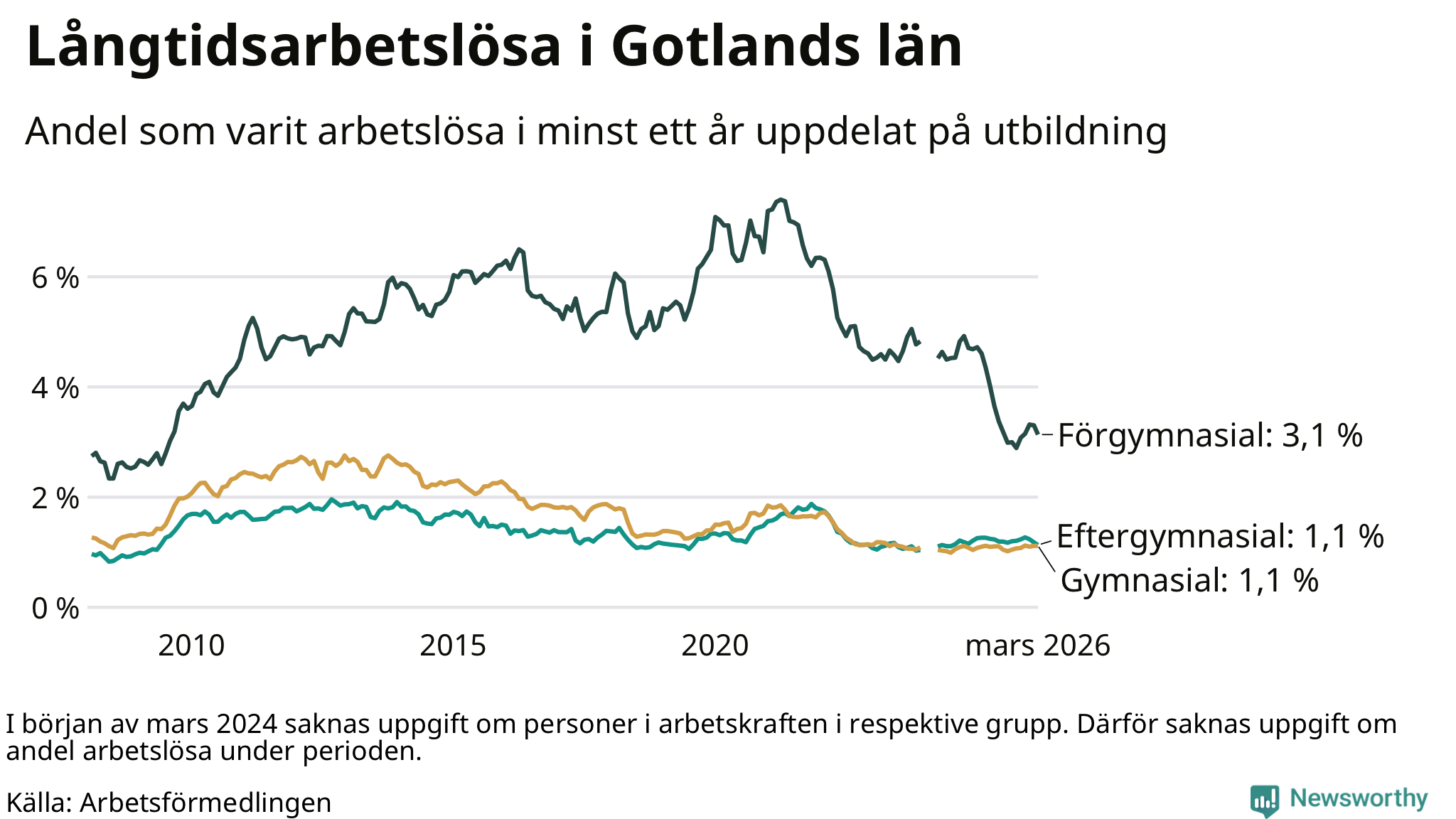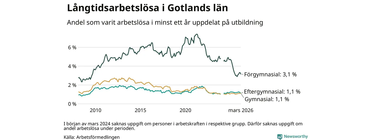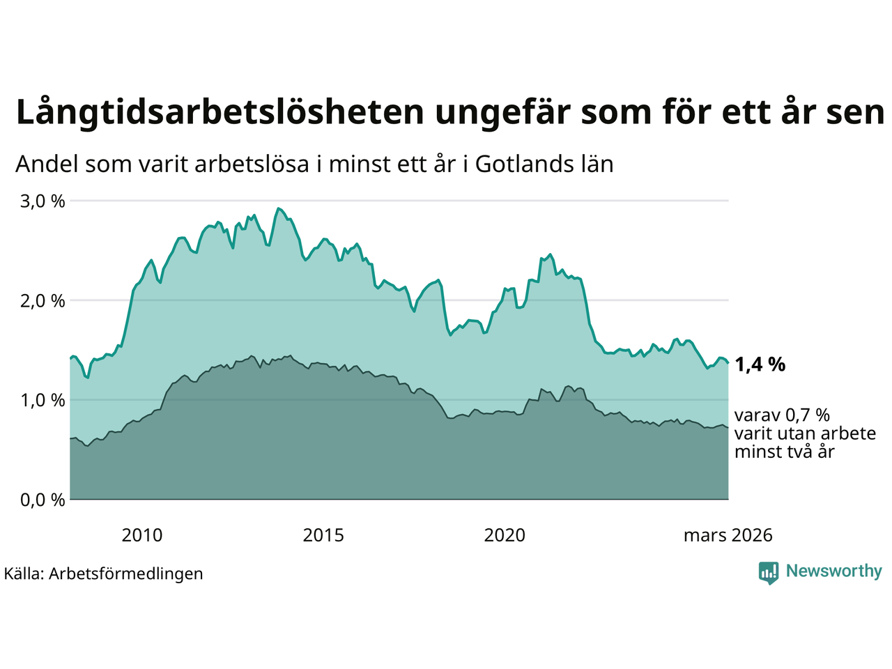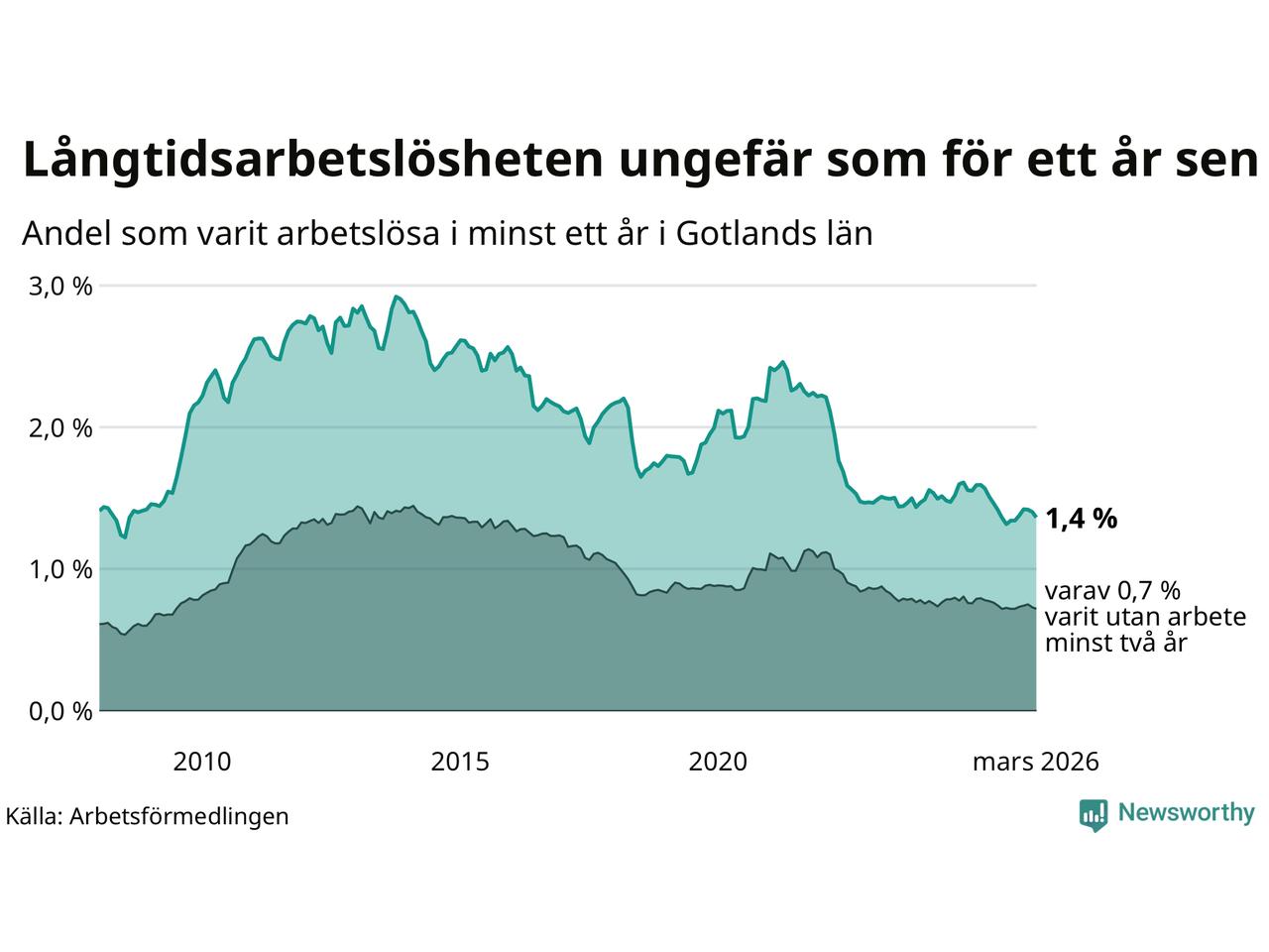 Andelen som varit utan arbete i minst ett år på Gotland var ungefär lika stor i mars jämfört med samma månad för ett år sedan. Det visar Arbetsfömedlingens senaste månadsstatistik.