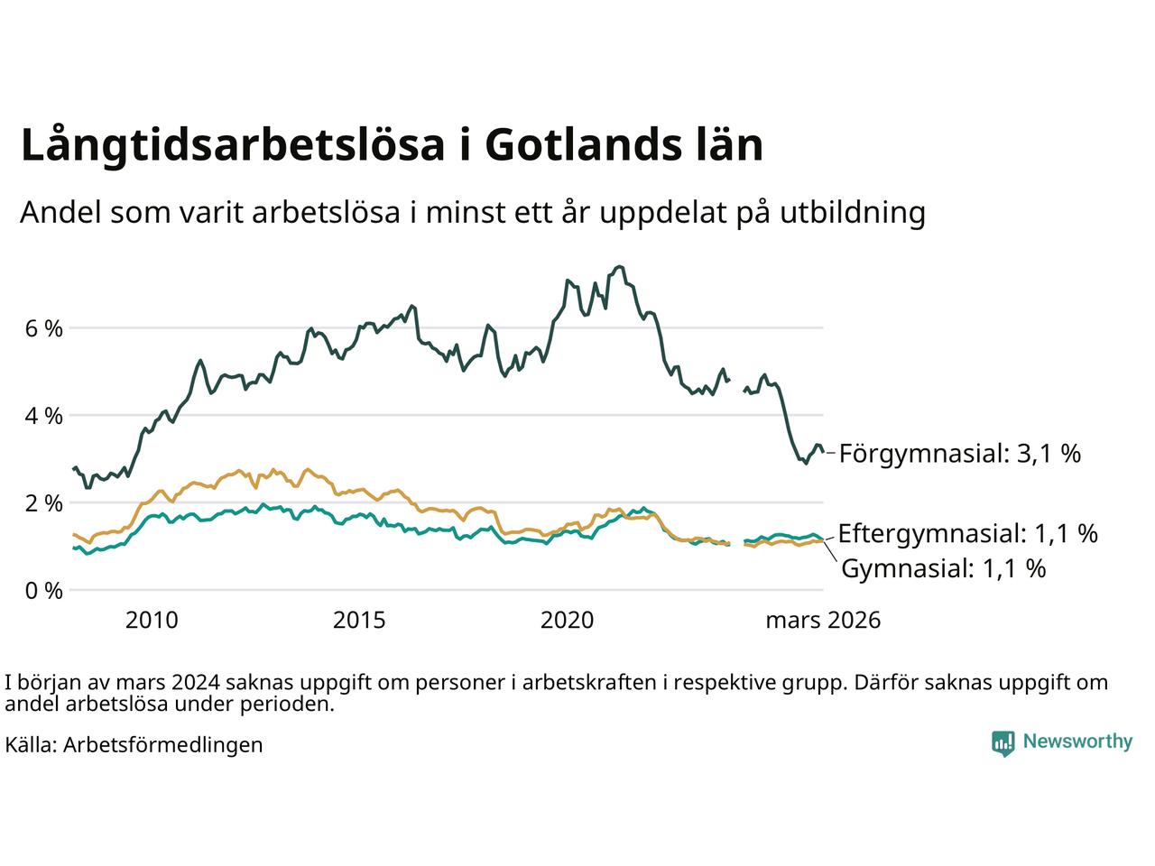 I mars hade 389 Gotlandsbor varit arbetslösa i minst ett år, vilket är elva färre än månaden innan. 389 personer motsvarar 1,4 procent av arbetskraften i länet – andelen långtidsarbetslösa är ungefär på samma nivå som för ett år sedan. Gotlands län hade näst lägst andel långtidsarbetslösa i landet i mars.