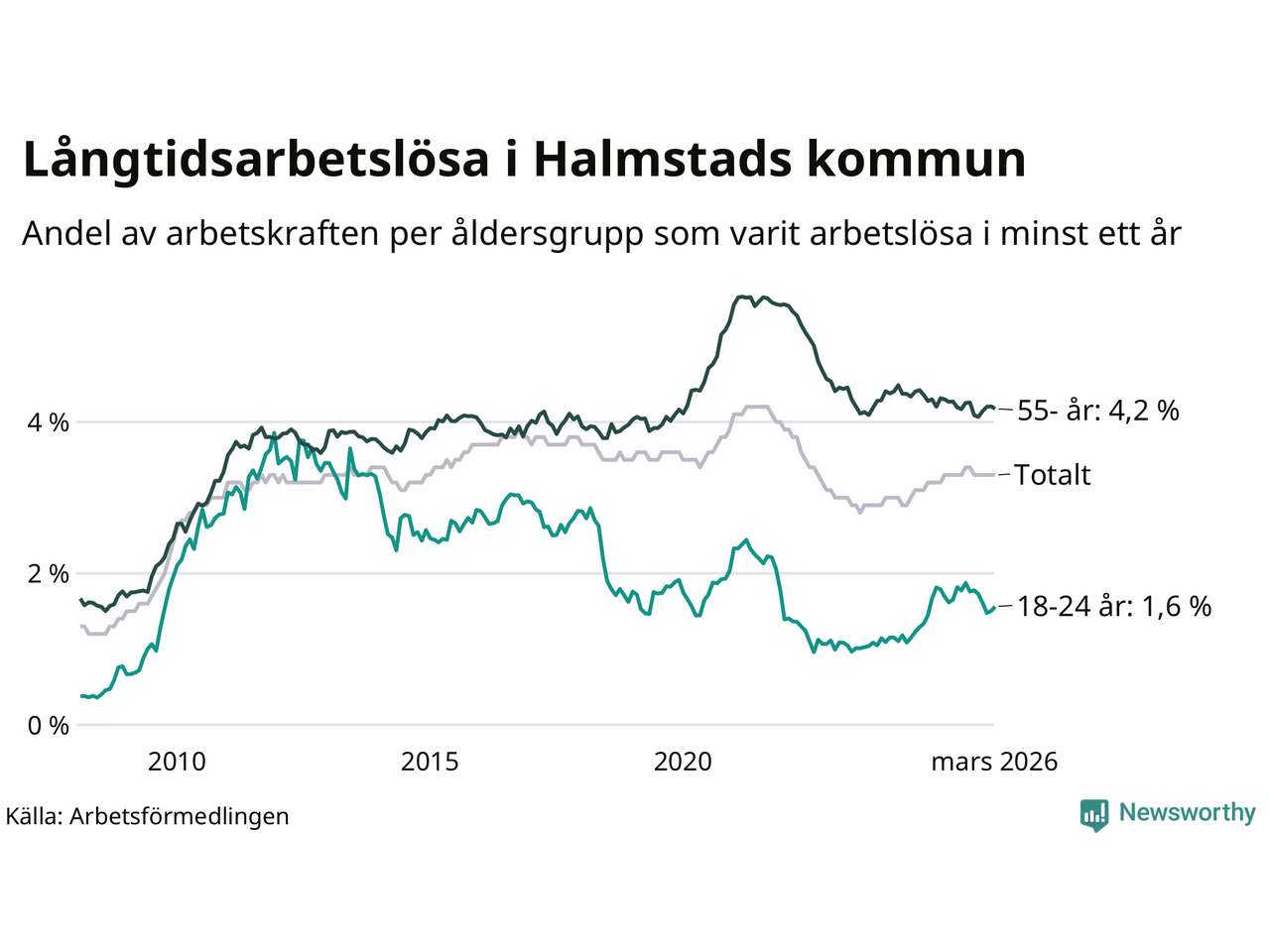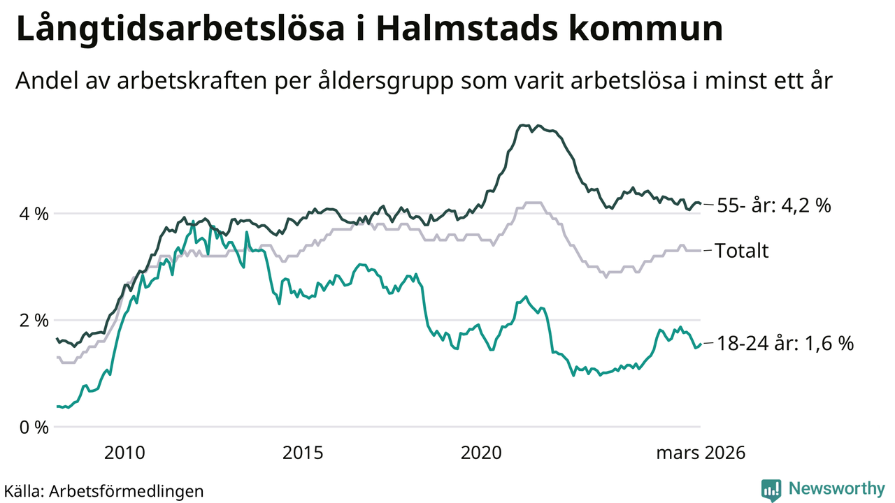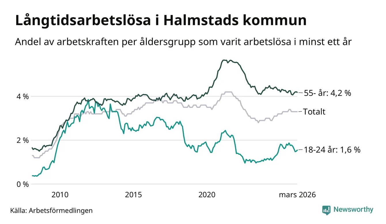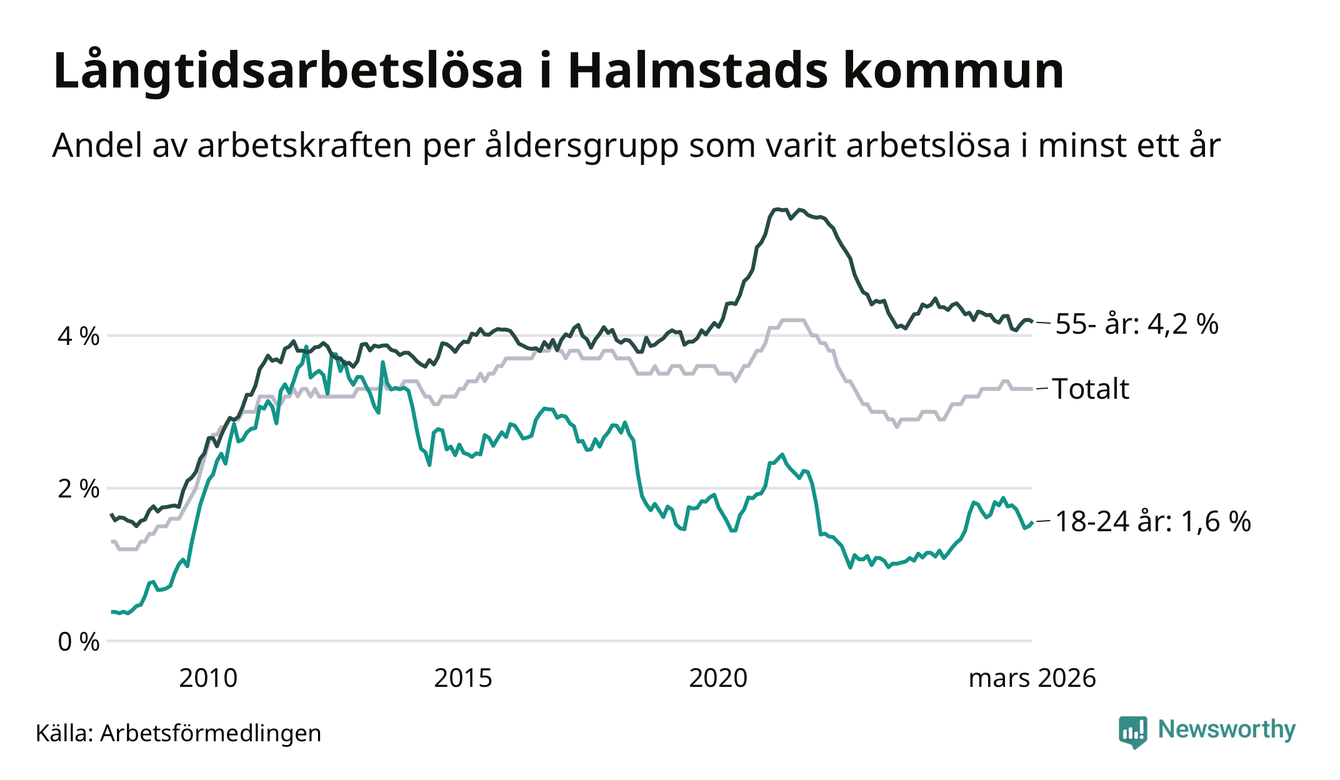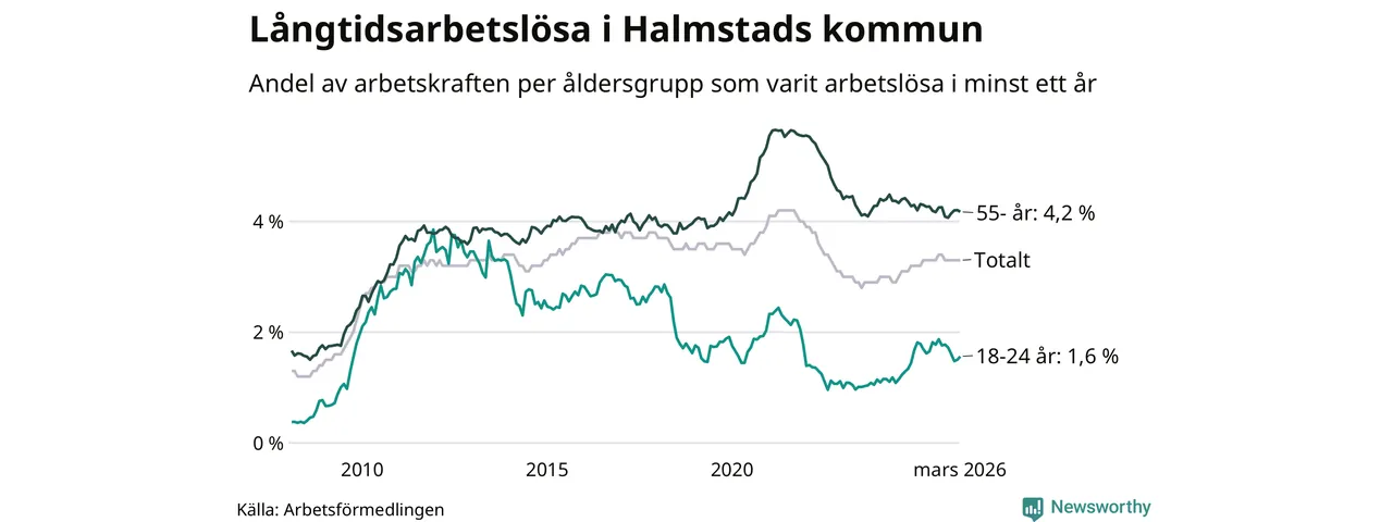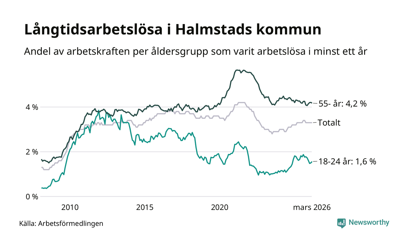 Av de 1 744 personerna som varit arbetslösa i mer än ett år i Halmstads kommun är 468 personer mellan 55 och 661 år och 98 är mellan 18 och 24 år. För den äldre gruppen är andelen arbetslösa 4,2 procent medan den i den yngre gruppen är 1,6 procent. Även i riket som helhet är långtidsarbetslösheten högre i gruppen äldre.