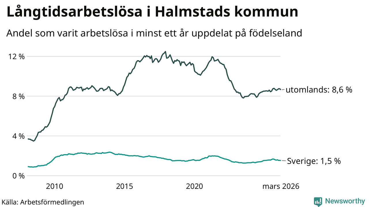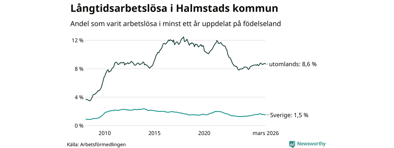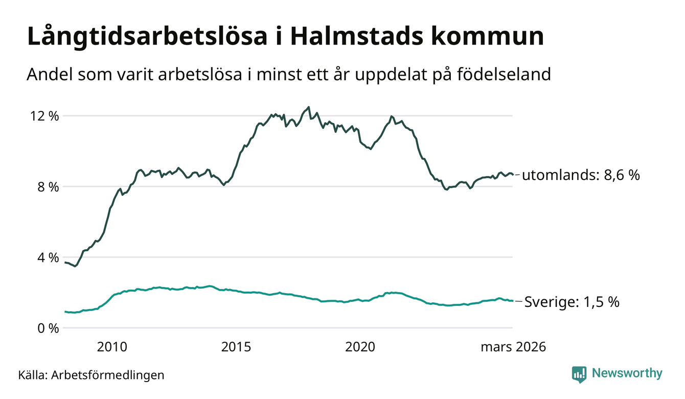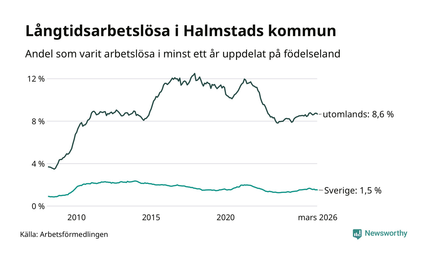 608 av de långtidsarbetslösa i Halmstad är födda i Sverige, medan 1 136 är födda utomlands. Det innebär att långtidsarbetslösheten bland Sverigefödda är 1,5 procent, medan den är sex gånger så hög – 8,6 procent – bland födda utomlands. Även i riket som helhet är arbetslösheten högre bland utrikesfödda.