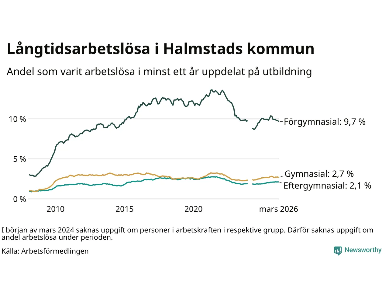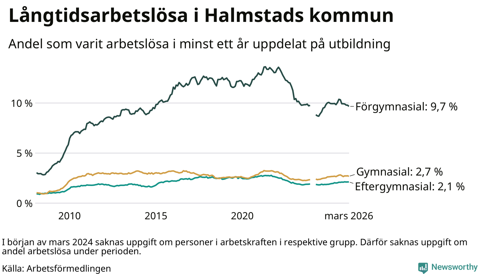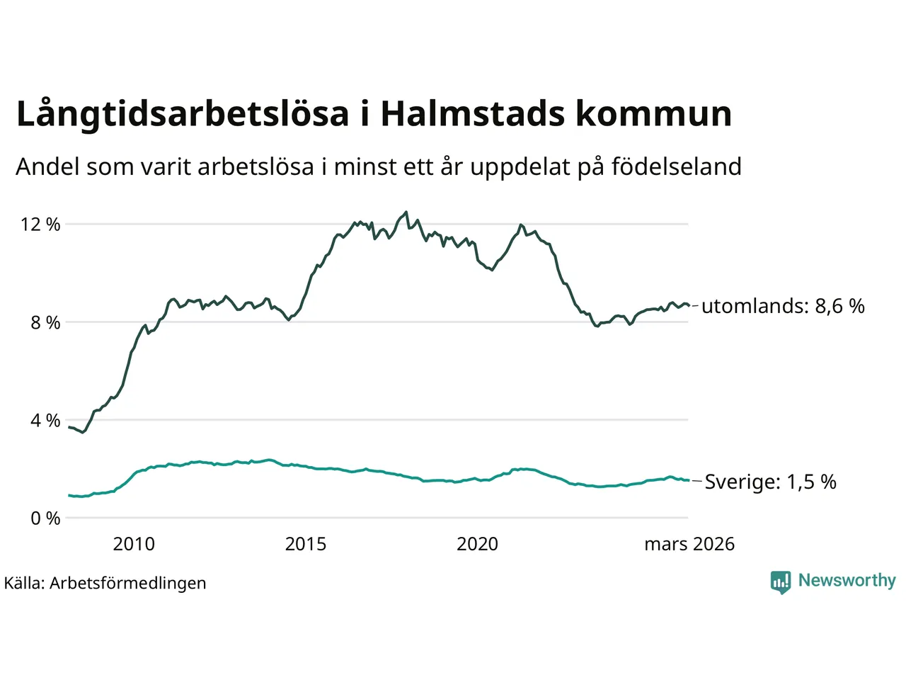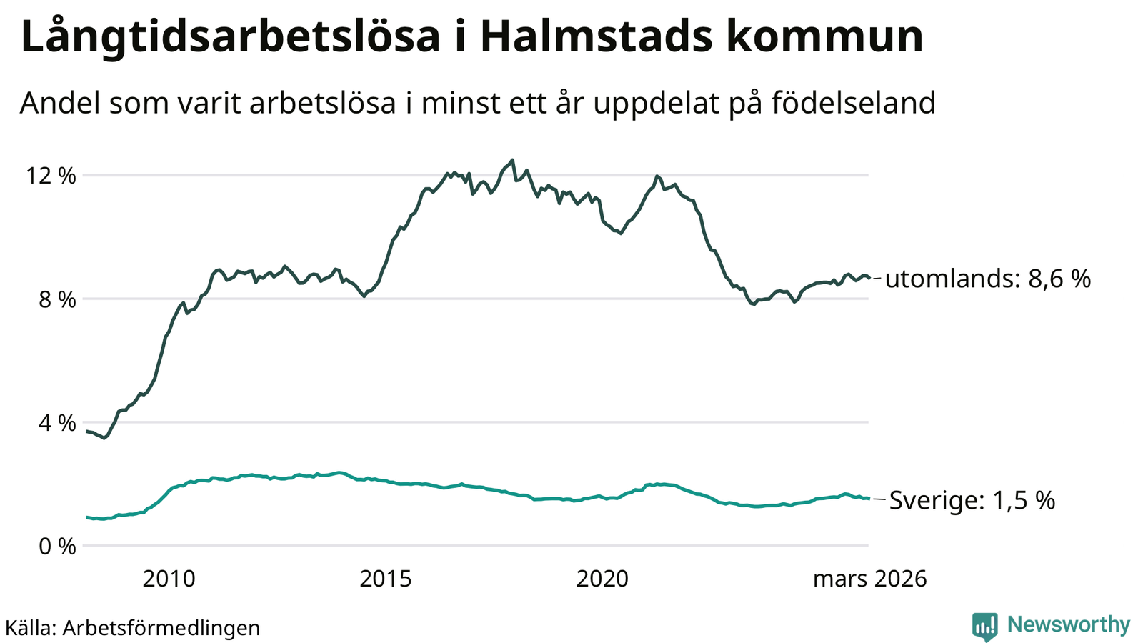 Graf: Andel arbetslösa i Halmstad som varit utan arbete i minst 12 månader