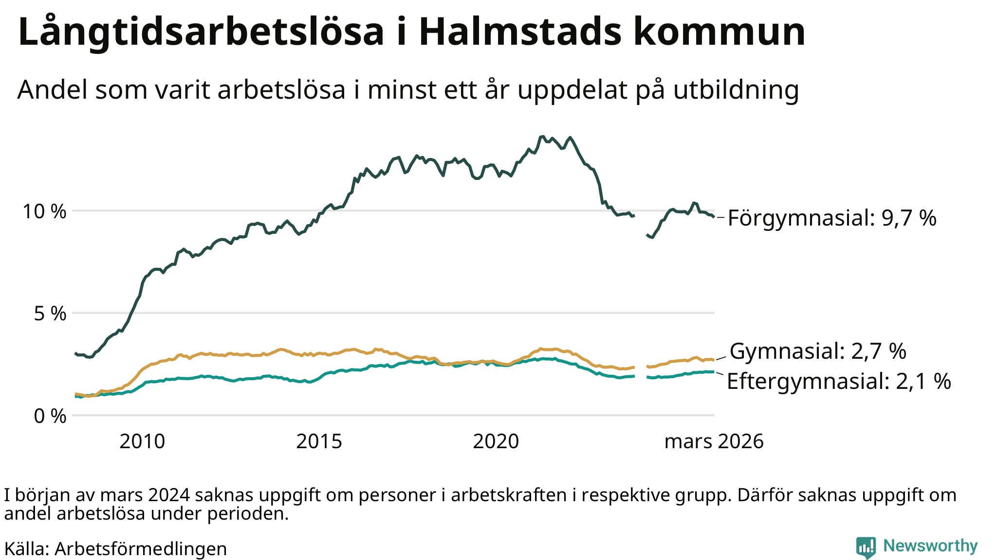 Graf över andel långtidsarbetslösa i Halmstad uppdelat på utbildningsnivå