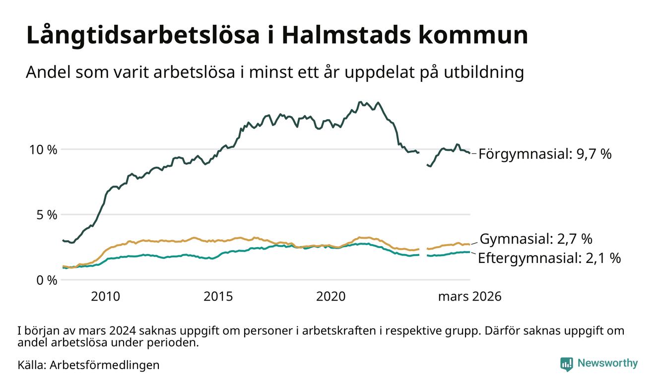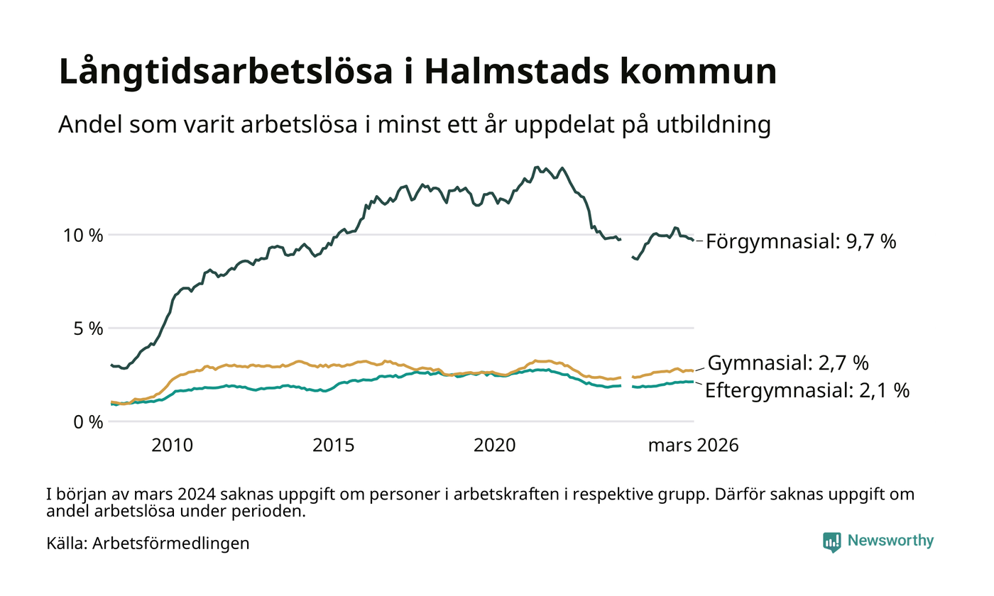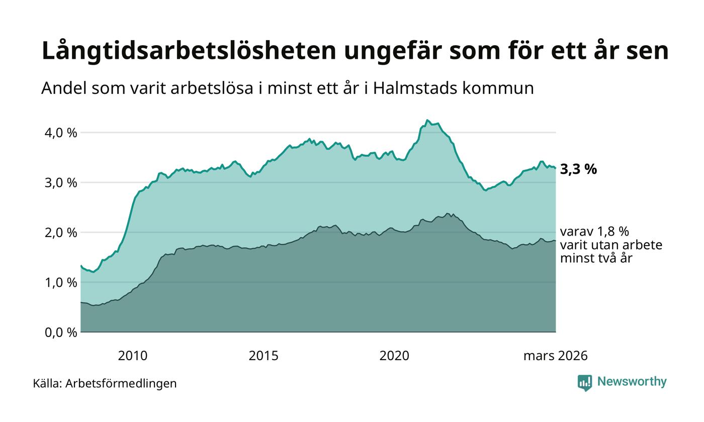 I mars hade 1 744 Halmstadsbor varit arbetslösa i minst ett år, vilket är 21 färre än månaden innan. 1 744 personer motsvarar 3,3 procent av arbetskraften i kommunen – andelen långtidsarbetslösa är ungefär på samma nivå som för ett år sedan.