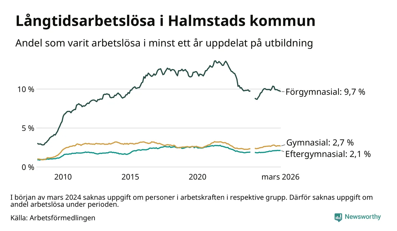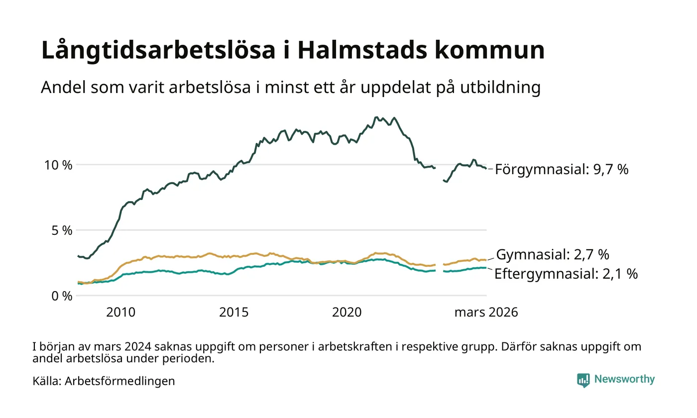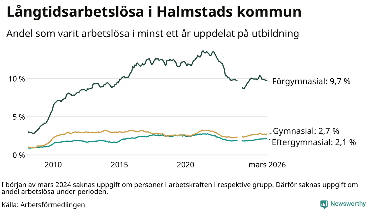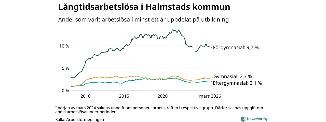 Andelen som varit utan arbete i minst ett år i Halmstad var ungefär lika stor i mars jämfört med samma månad för ett år sedan. Det visar Arbetsfömedlingens senaste månadsstatistik.