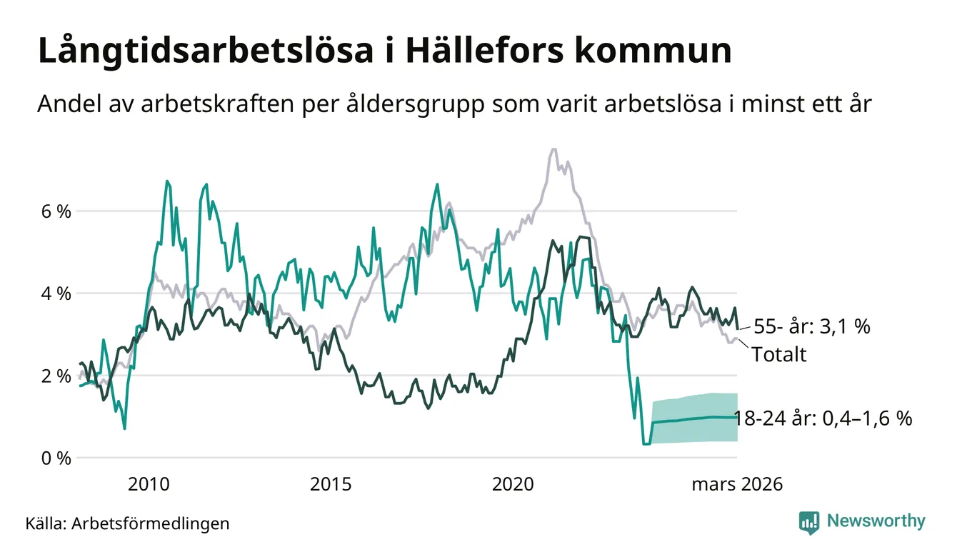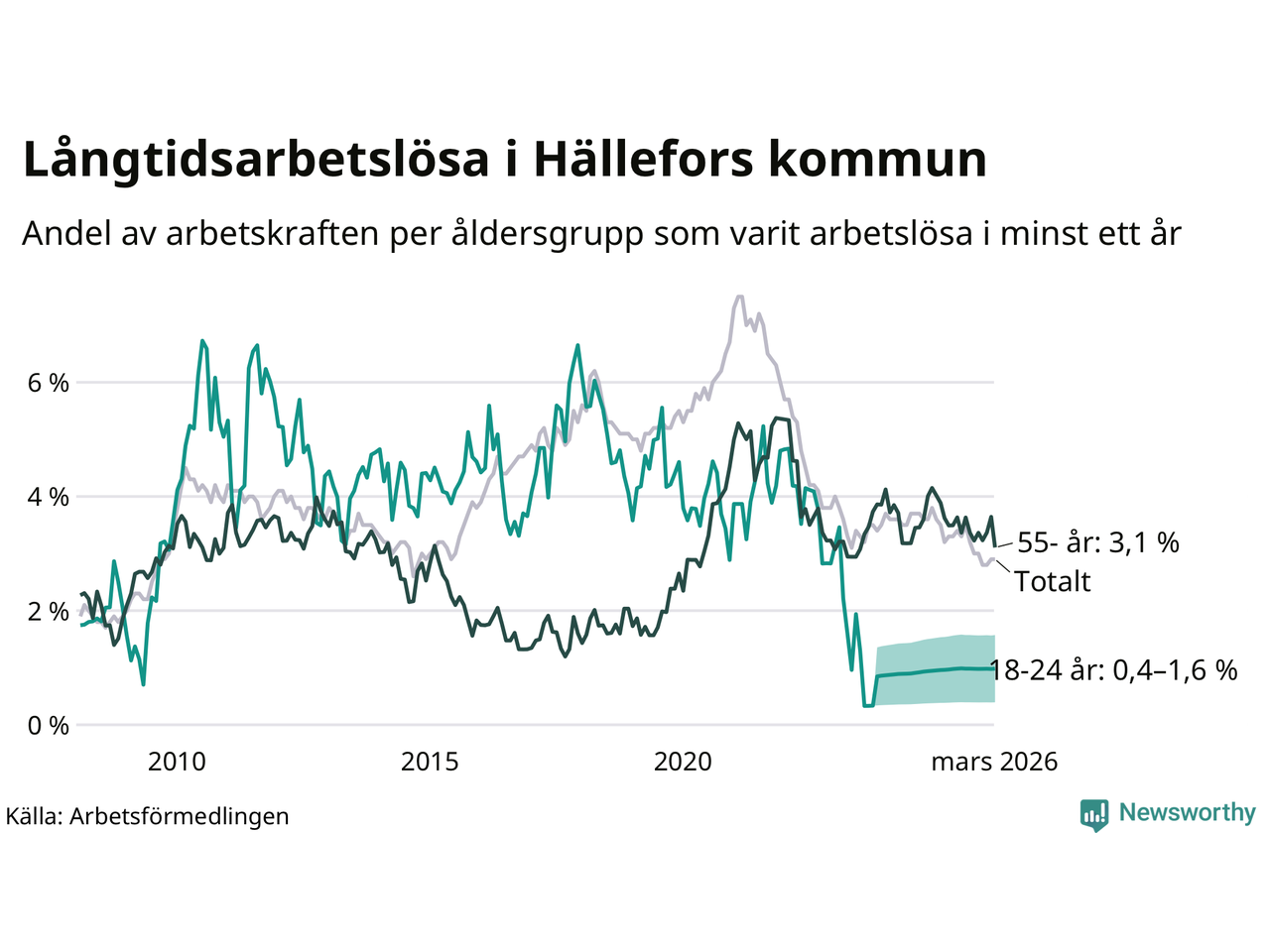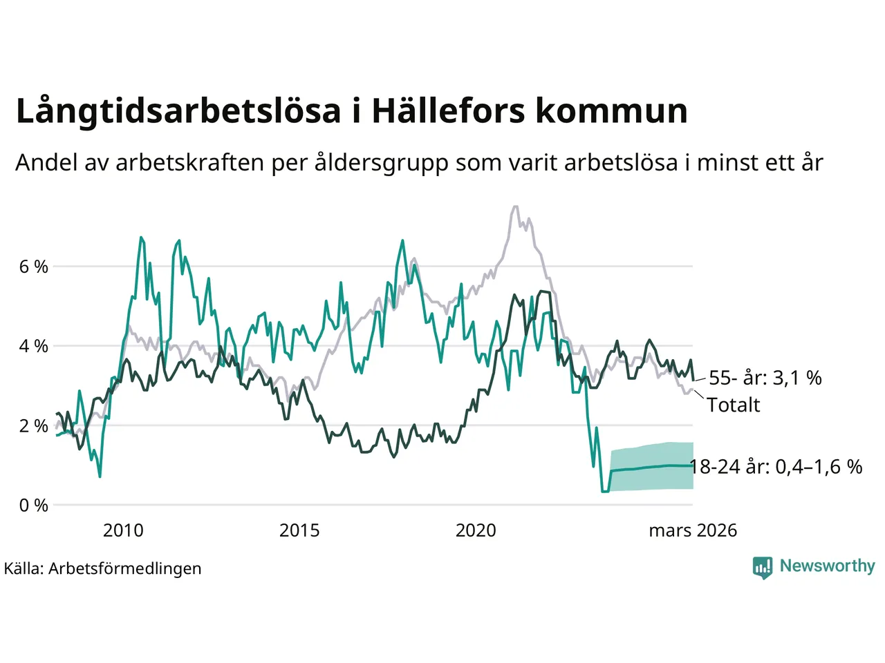 Av de 75 personerna som varit arbetslösa i mer än ett år i Hällefors kommun är 23 personer mellan 55 och 661 år och mellan en och fyra är mellan 18 och 24 år. För den äldre gruppen är andelen arbetslösa 3,1 procent medan den i den yngre gruppen är mellan 0,4 och 1,6 procent. Även i riket som helhet är långtidsarbetslösheten högre i gruppen äldre.