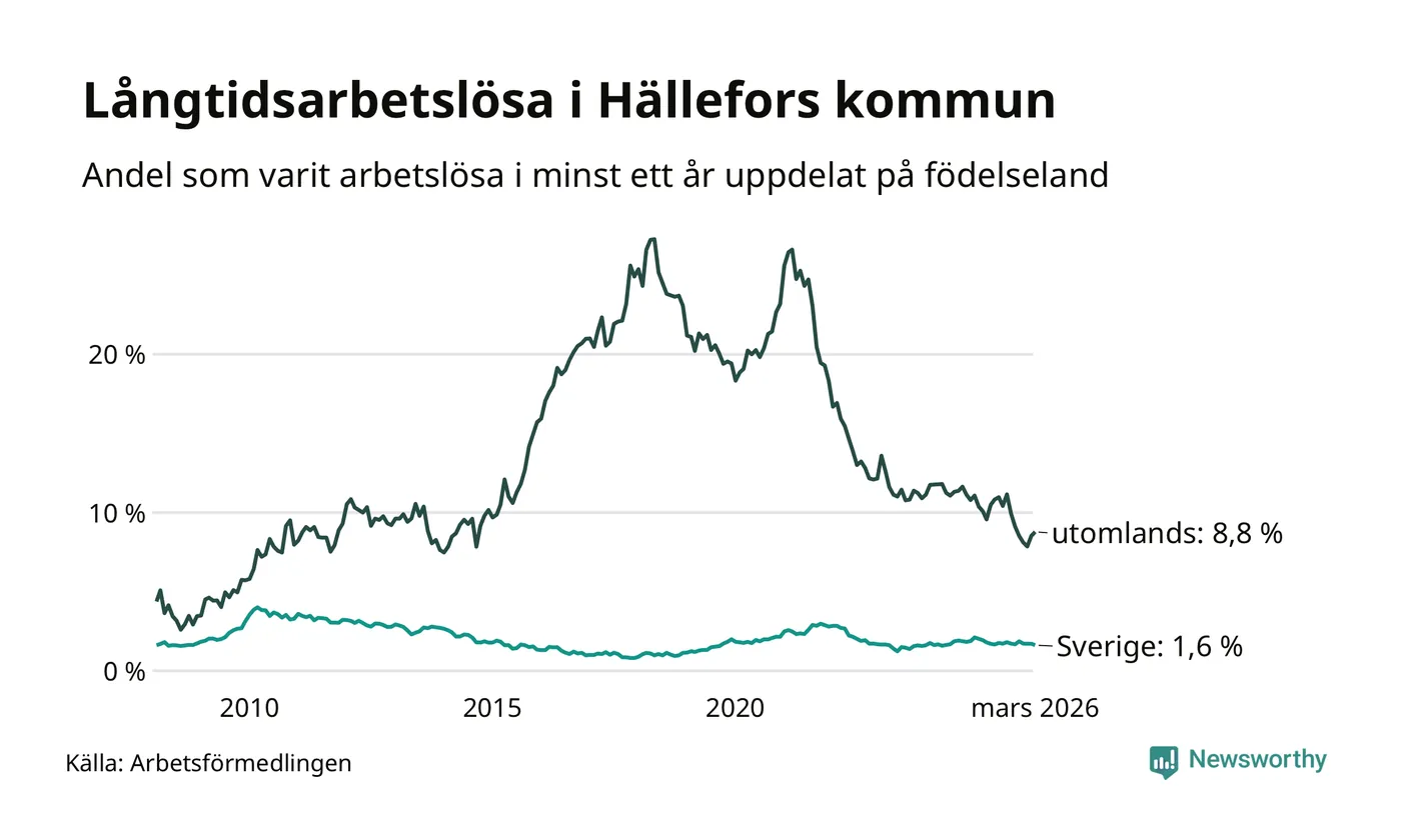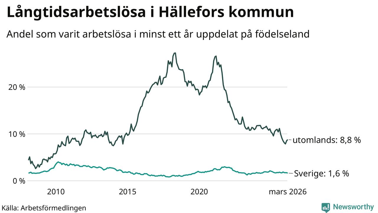 35 av de långtidsarbetslösa i Hällefors är födda i Sverige, medan 40 är födda utomlands. Det innebär att långtidsarbetslösheten bland Sverigefödda är 1,6 procent, medan den är sex gånger så hög – 8,8 procent – bland födda utomlands. Även i riket som helhet är arbetslösheten högre bland utrikesfödda.
