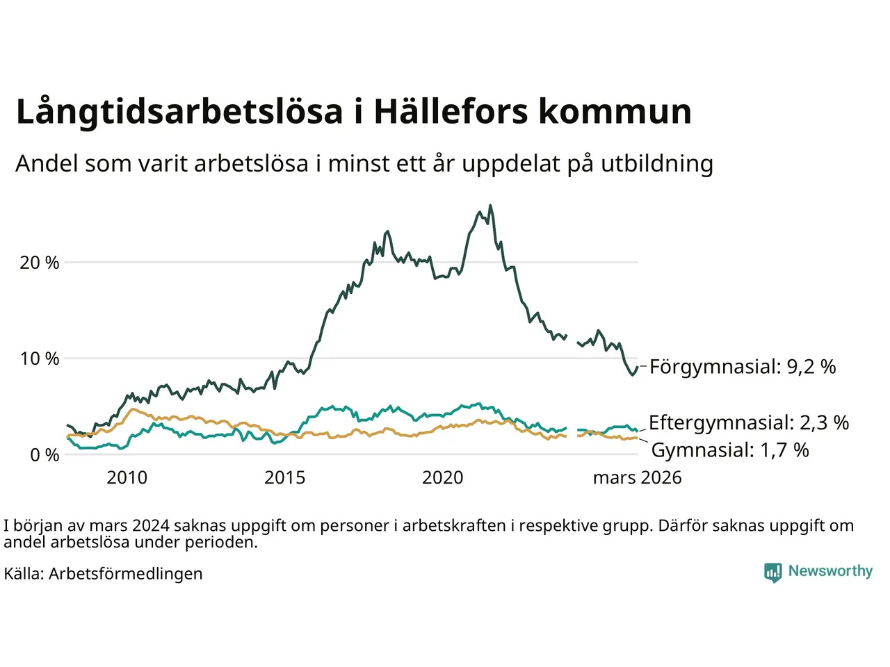 I mars hade 75 Hälleforsbor varit arbetslösa i minst ett år, vilket är en färre än månaden innan. 75 personer motsvarar 2,9 procent av arbetskraften i kommunen – andelen långtidsarbetslösa är 0,3 procentenheter lägre än samma månad för ett år sedan.