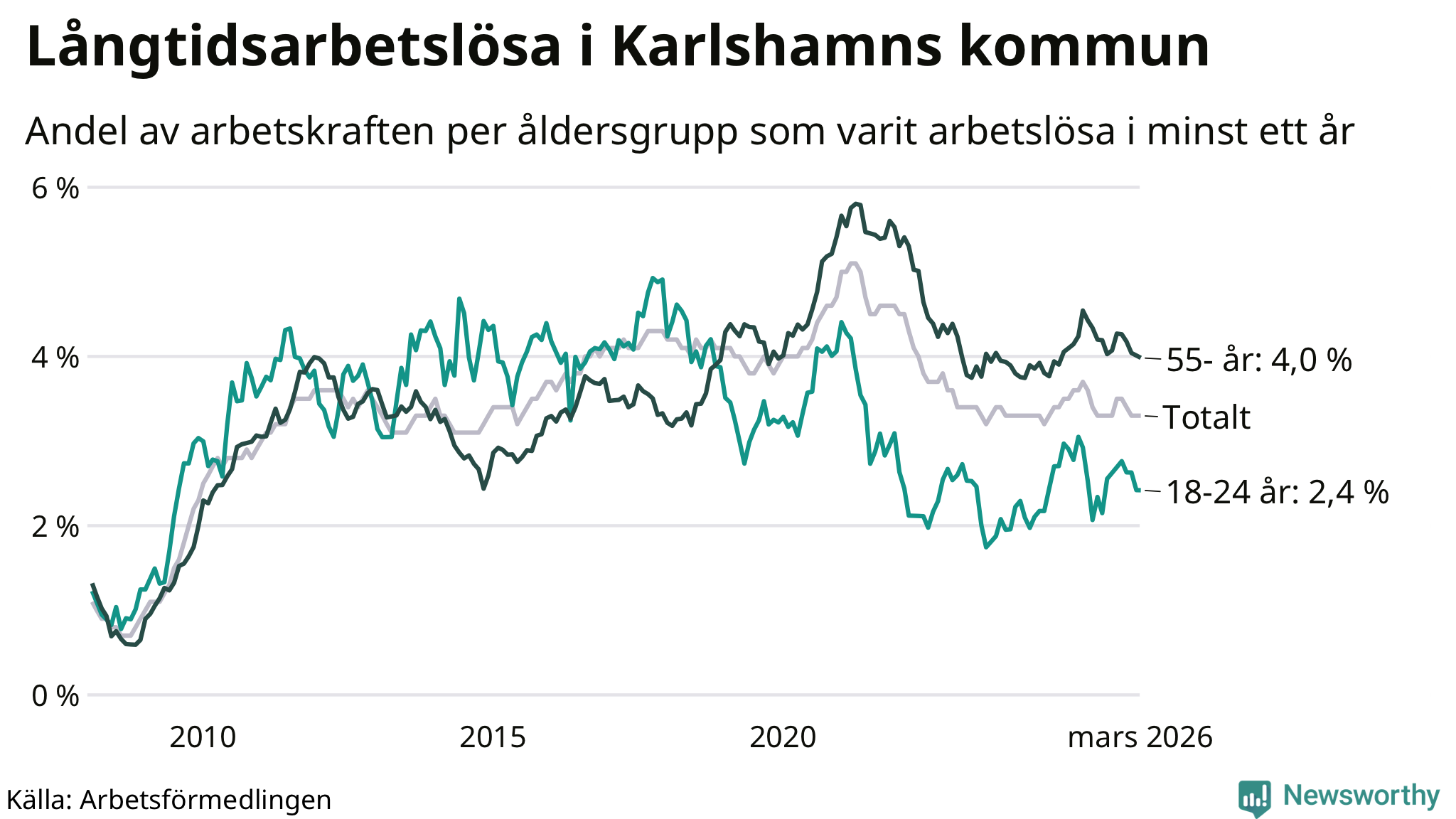 Graf: Andel arbetslösa uppdelat i åldersgrupper i Karlshamn