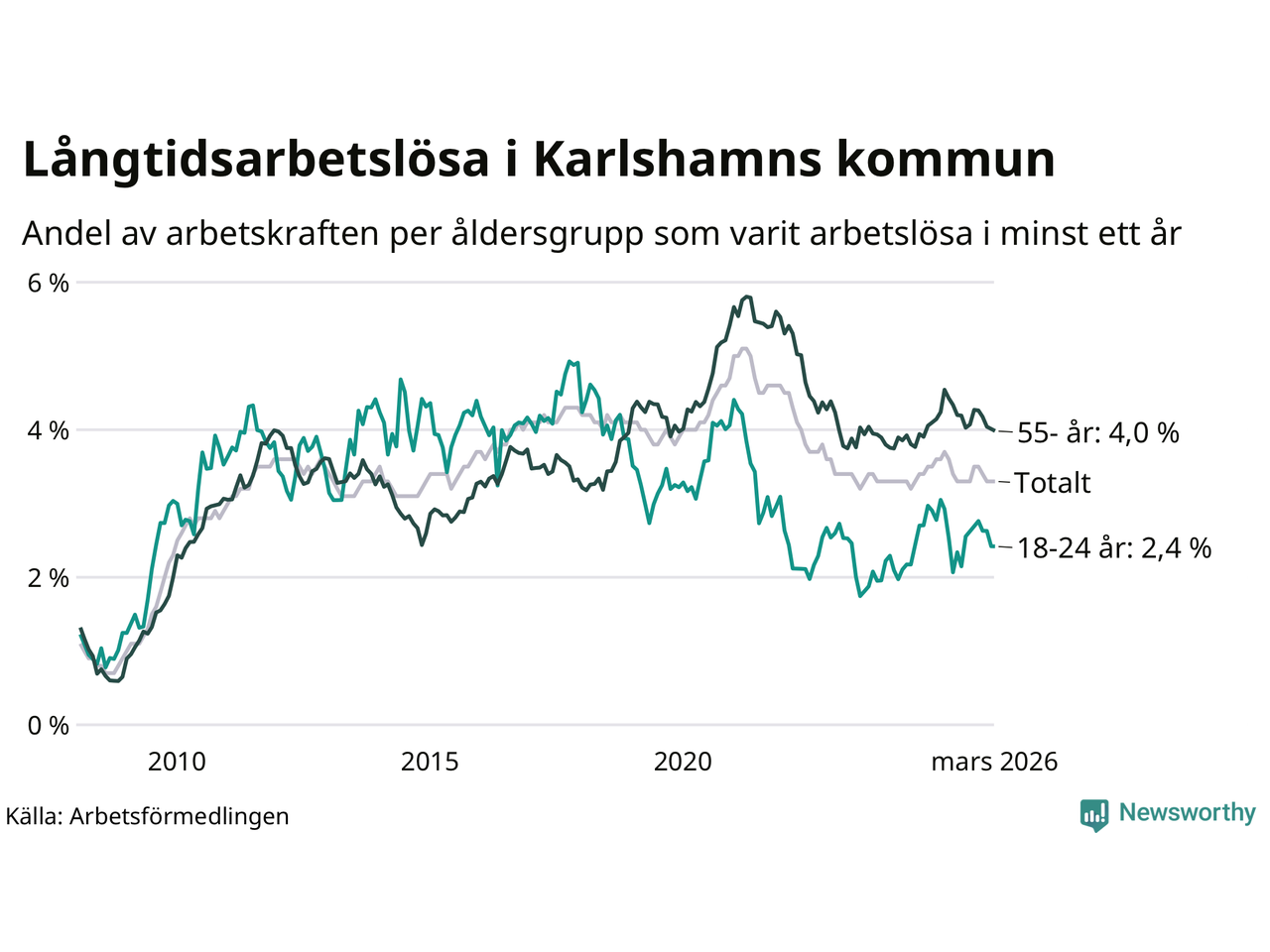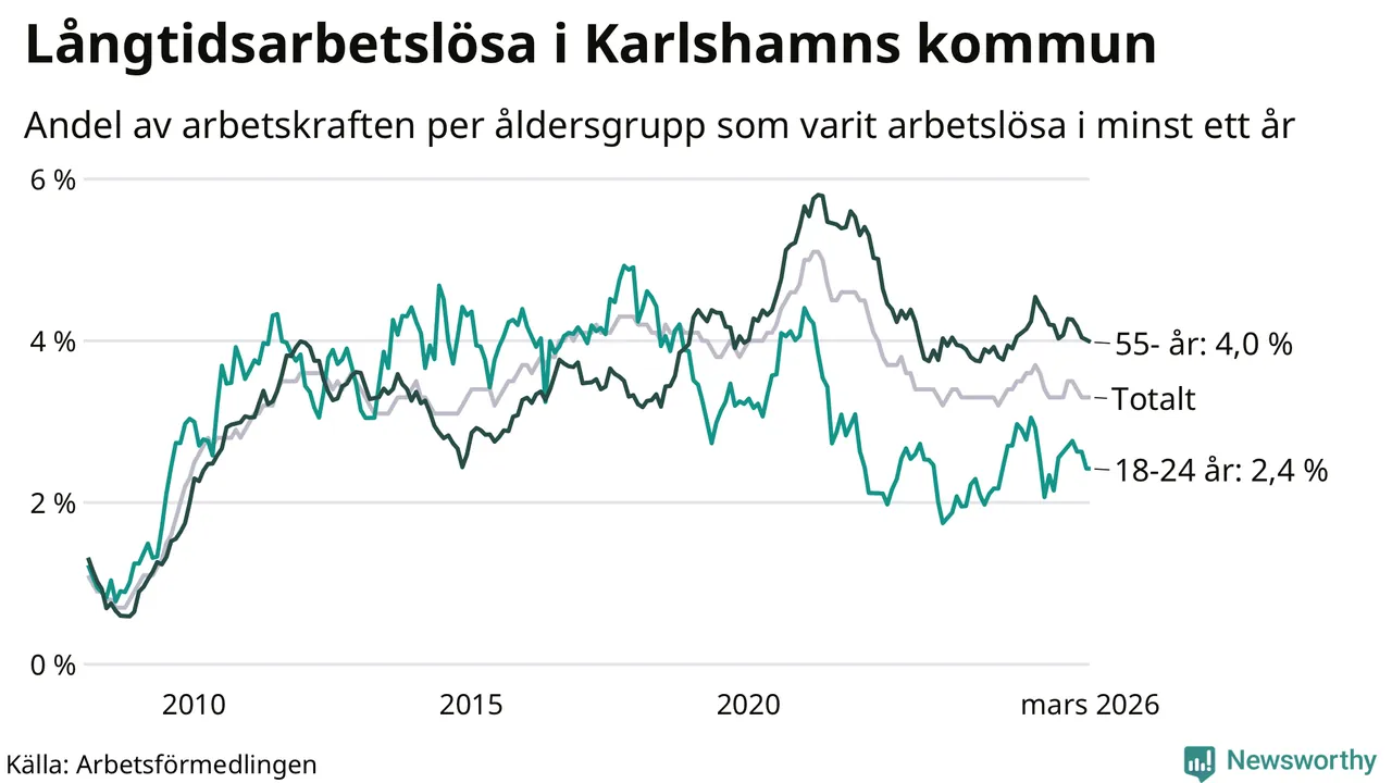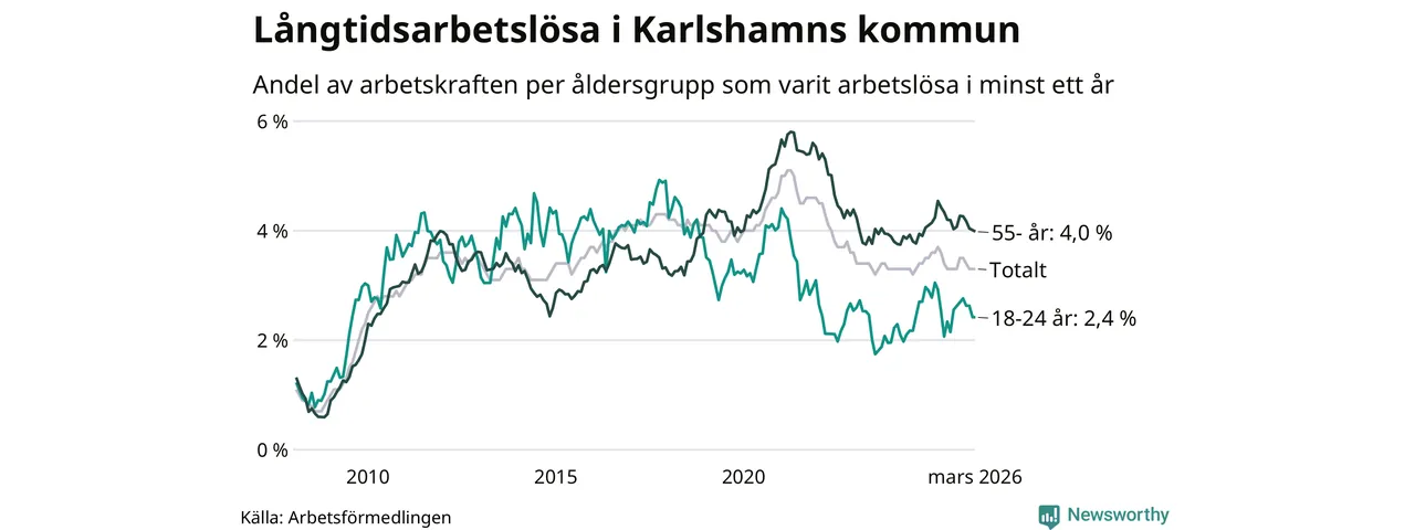 Av de 507 personerna som varit arbetslösa i mer än ett år i Karlshamns kommun är 155 personer mellan 55 och 661 år och 36 är mellan 18 och 24 år. För den äldre gruppen är andelen arbetslösa 4,0 procent medan den i den yngre gruppen är 2,4 procent. Även i riket som helhet är långtidsarbetslösheten högre i gruppen äldre.