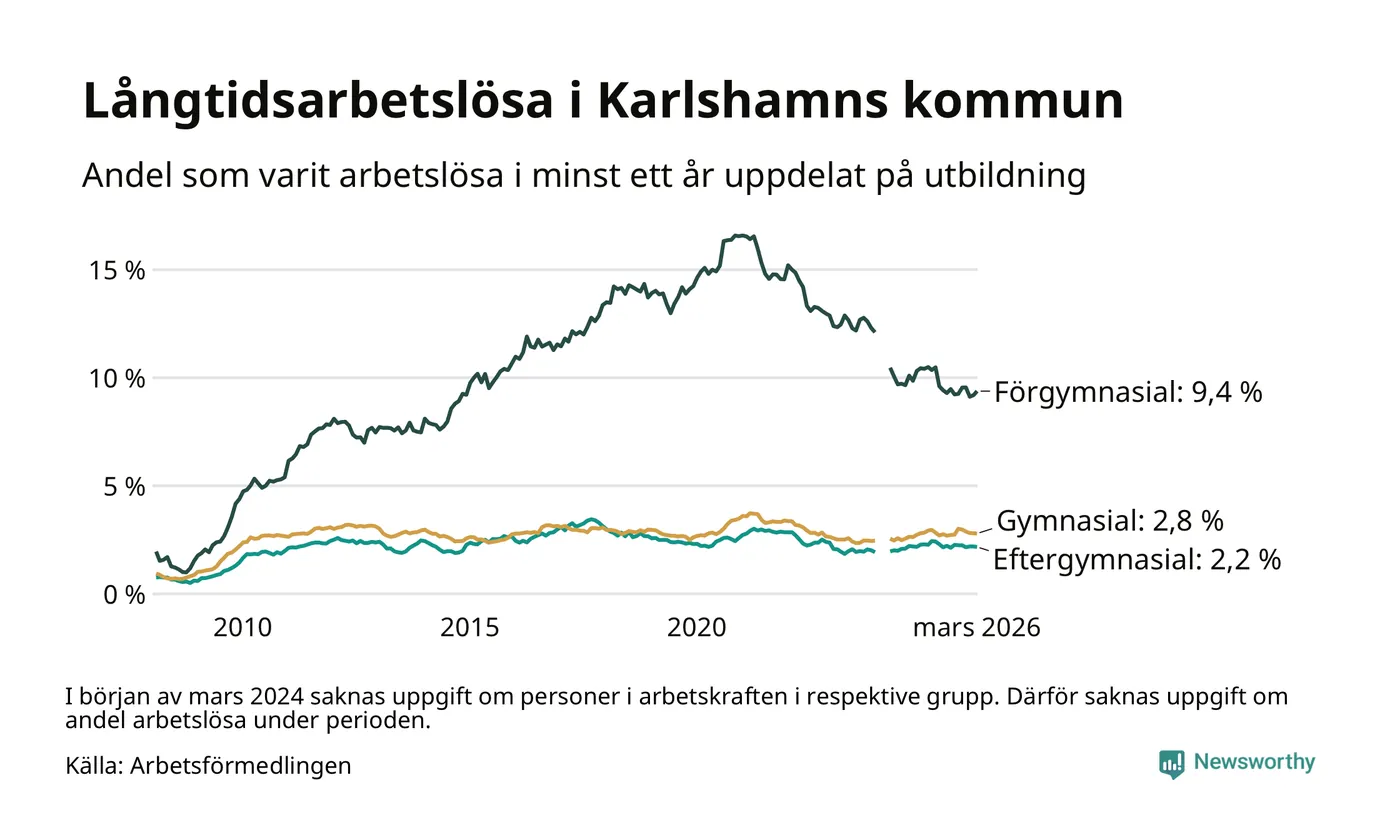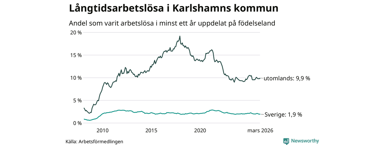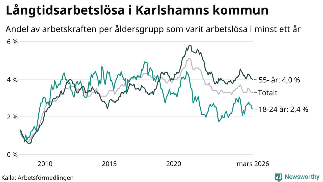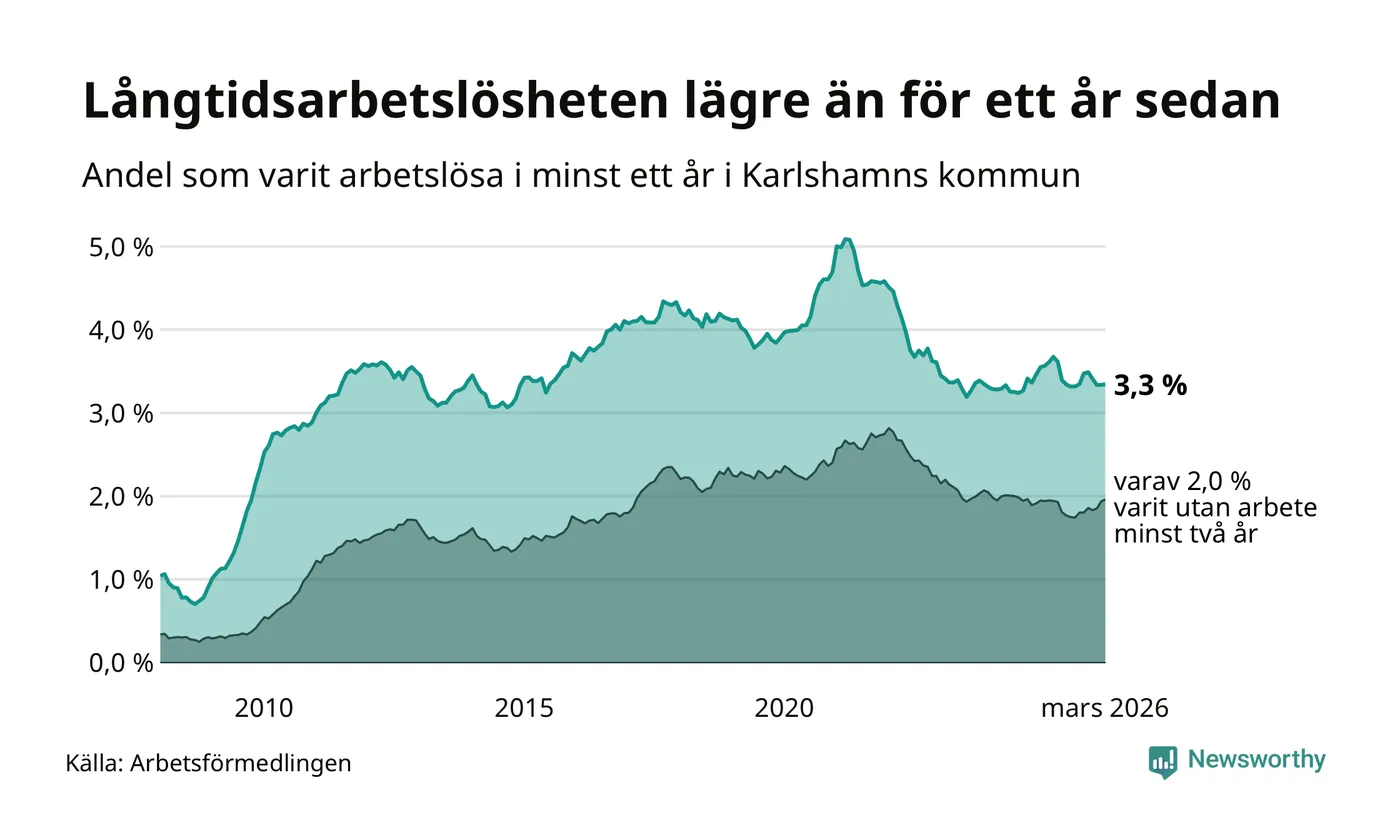 I mars hade 507 Karlshamnsbor varit arbetslösa i minst ett år, vilket är en fler än månaden innan. 507 personer motsvarar 3,3 procent av arbetskraften i kommunen – andelen långtidsarbetslösa är 0,4 procentenheter lägre än samma månad för ett år sedan.