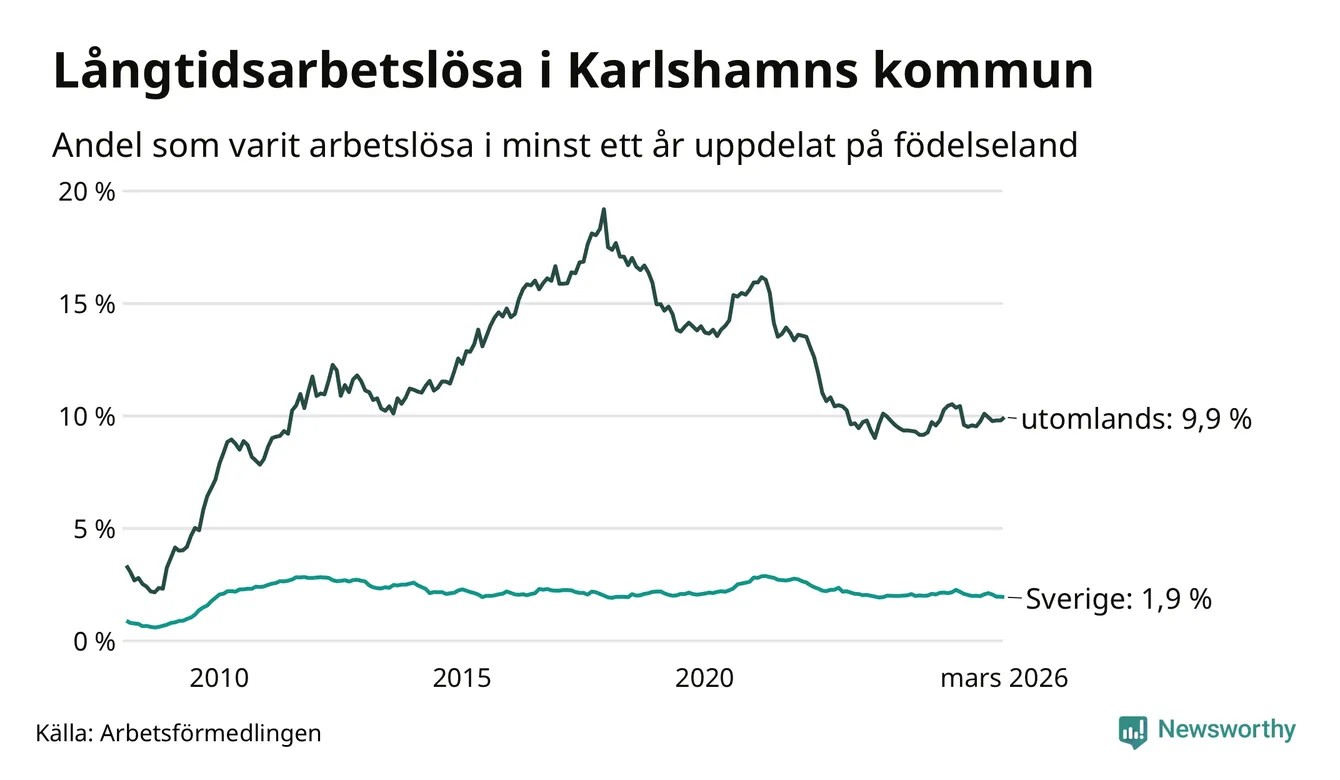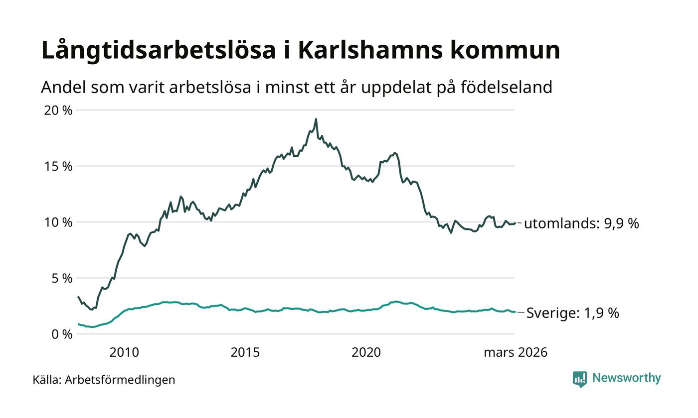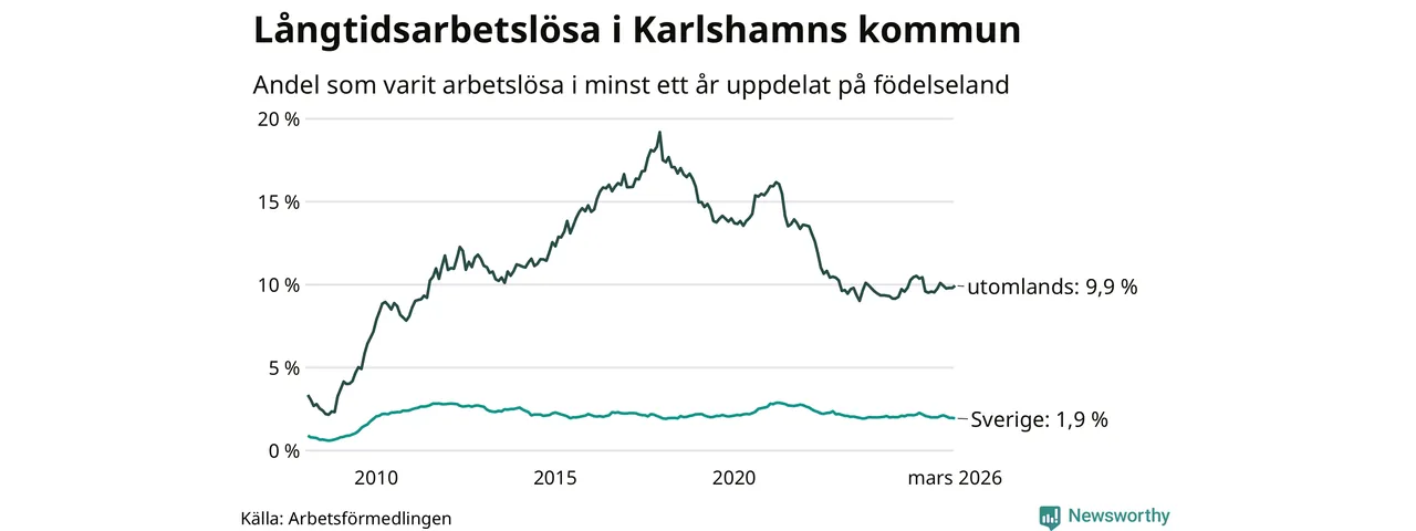 243 av de långtidsarbetslösa i Karlshamn är födda i Sverige, medan 264 är födda utomlands. Det innebär att långtidsarbetslösheten bland Sverigefödda är 1,9 procent, medan den är fem gånger så hög – 9,9 procent – bland födda utomlands. Även i riket som helhet är arbetslösheten högre bland utrikesfödda.