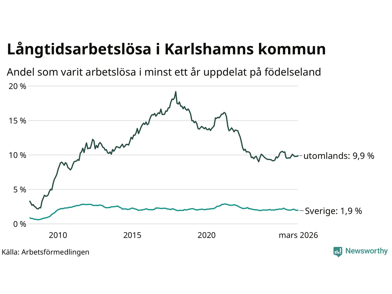 Graf: Andel arbetslösa uppdelat på födelseland i Karlshamn