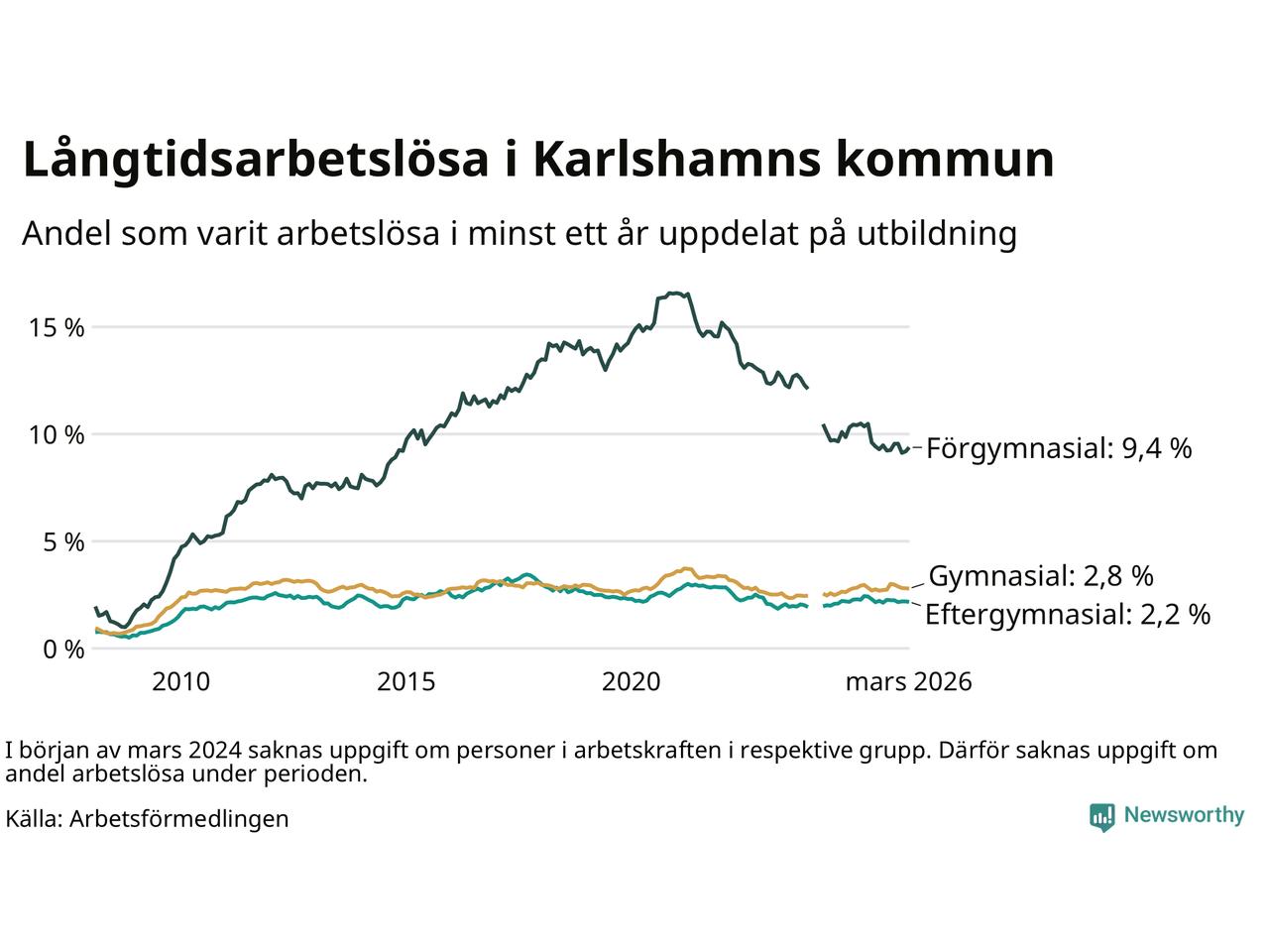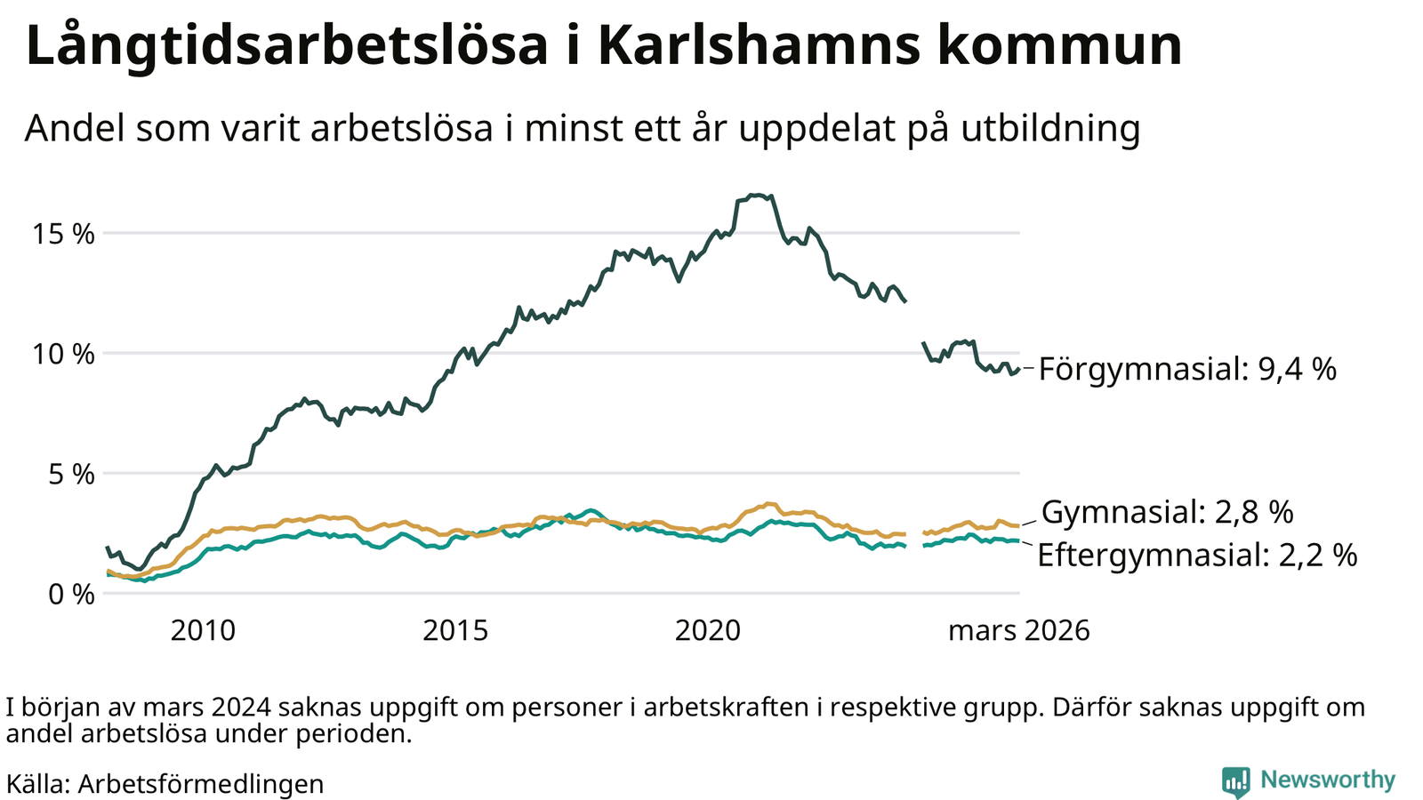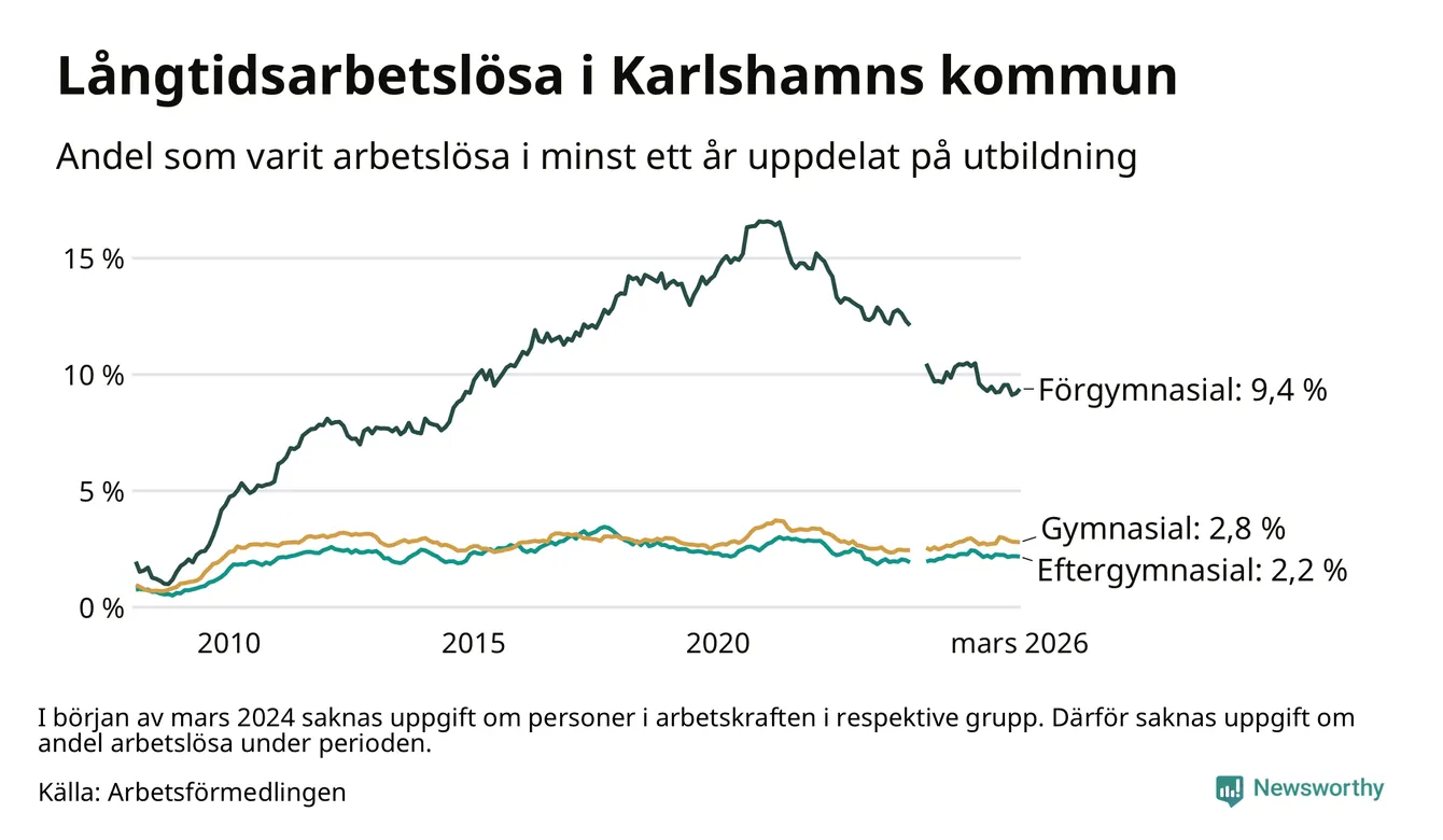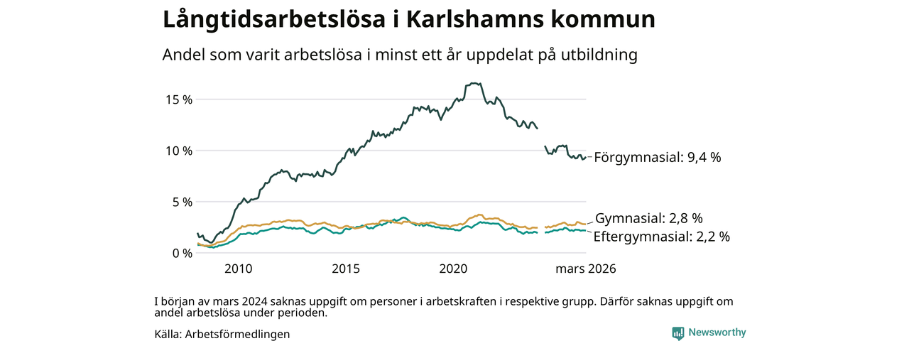 Graf: Andel arbetslösa i Karlshamn som varit utan arbete i minst 12 månader