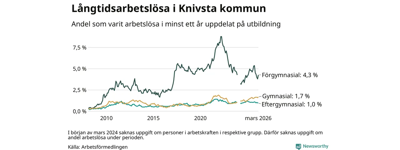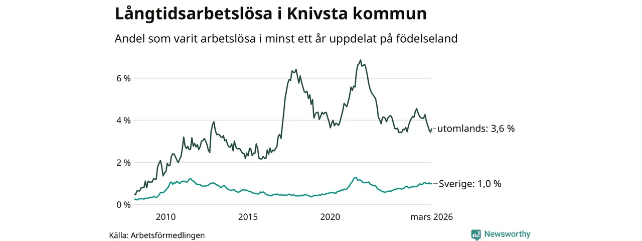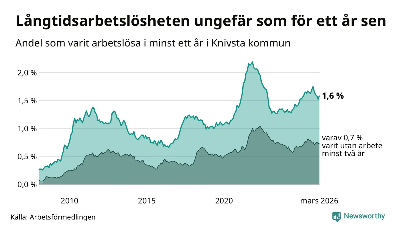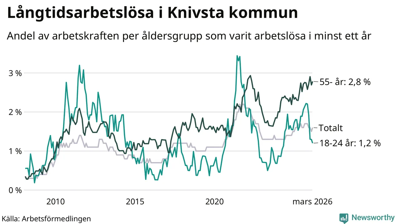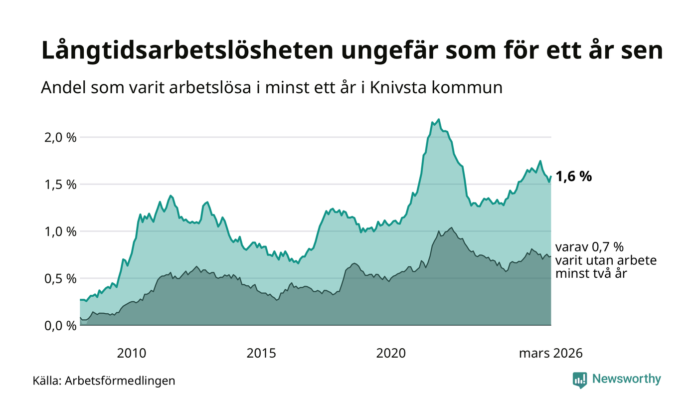 I mars hade 182 Knivstabor varit arbetslösa i minst ett år, vilket är åtta fler än månaden innan. Det är den första månaden sedan oktober 2025 som antalet arbetslösa ökar. 182 personer motsvarar 1,6 procent av arbetskraften i kommunen – andelen långtidsarbetslösa är ungefär på samma nivå som för ett år sedan.