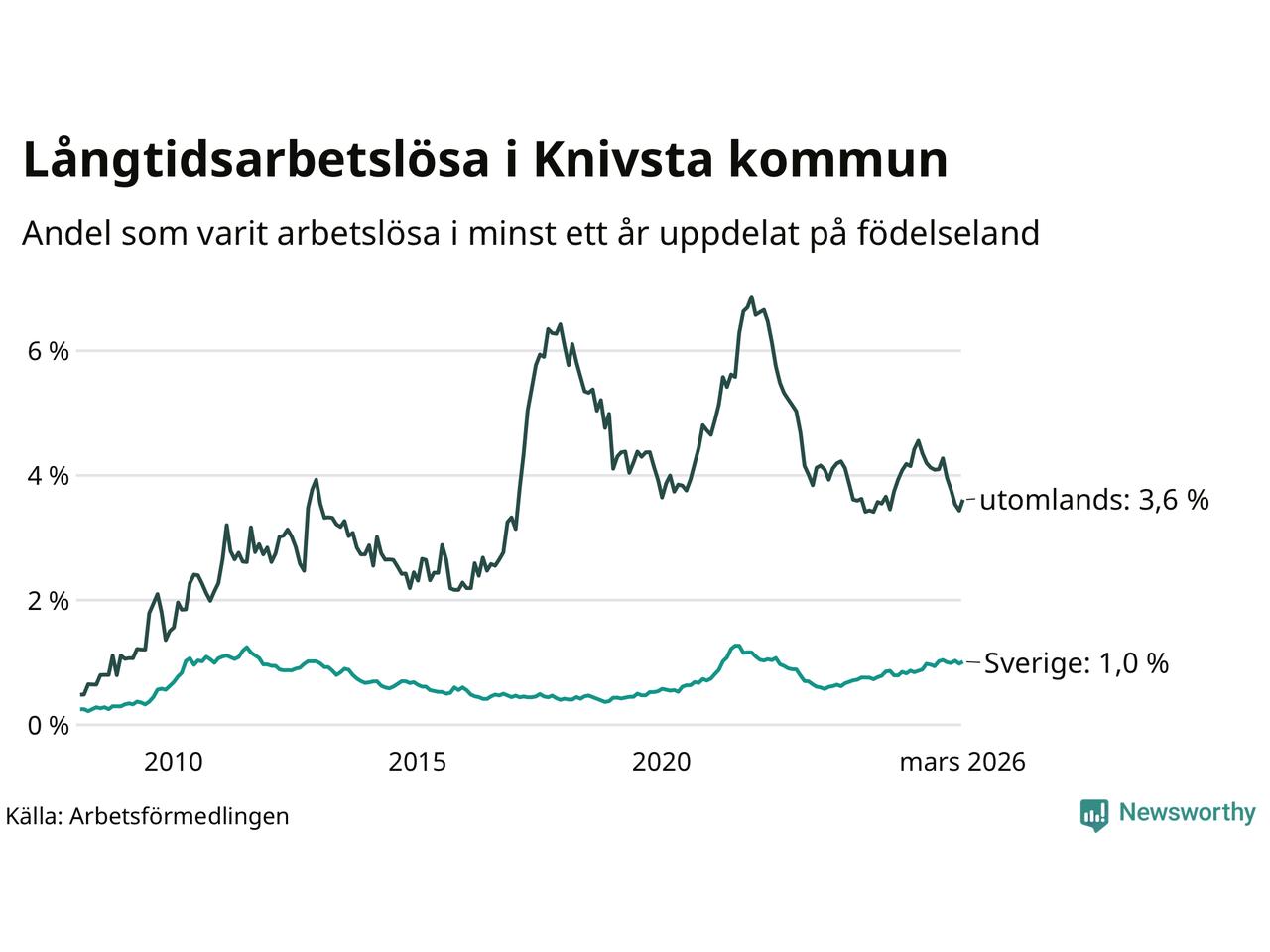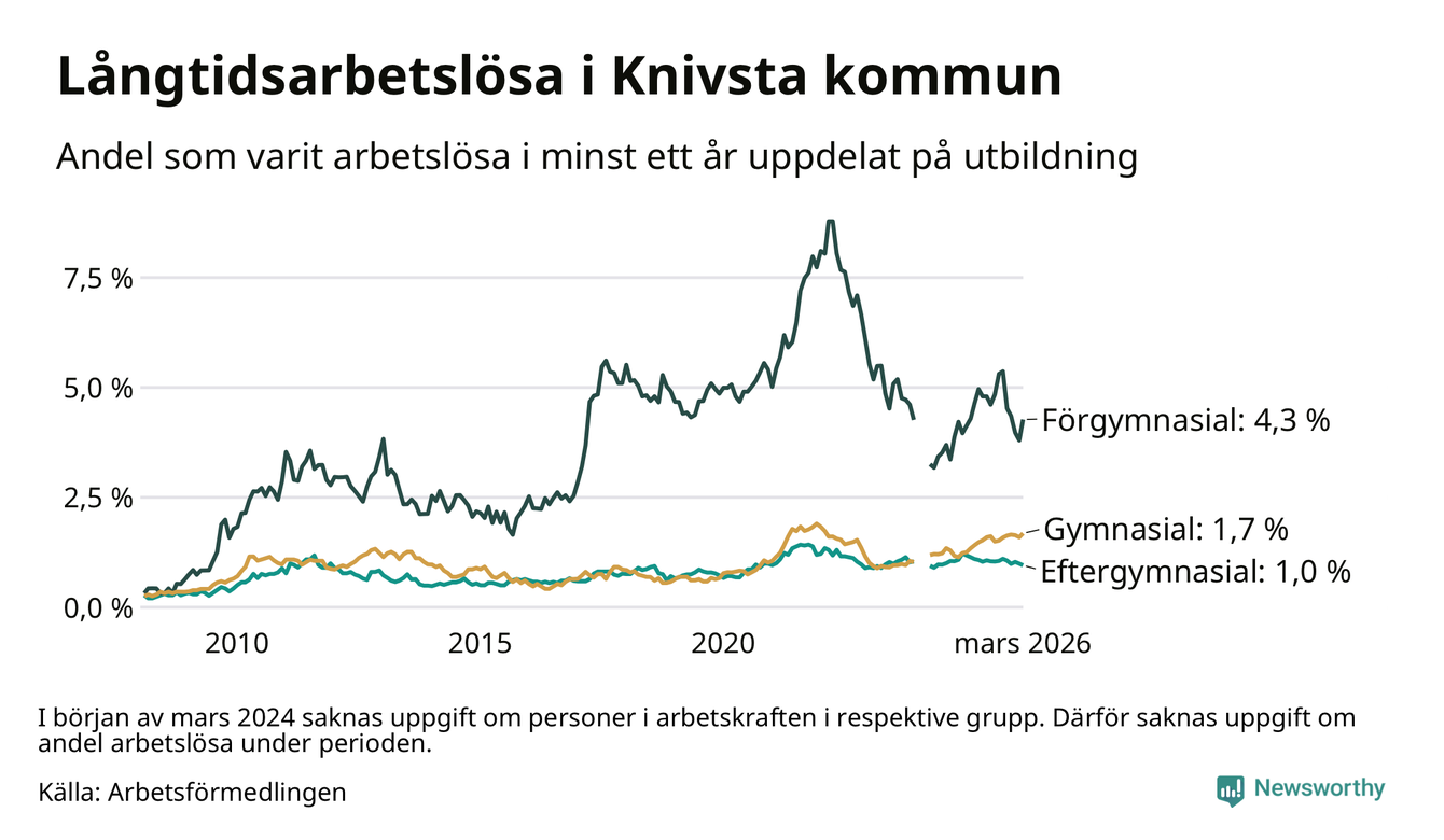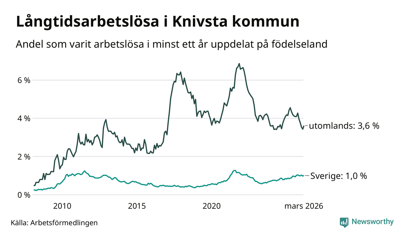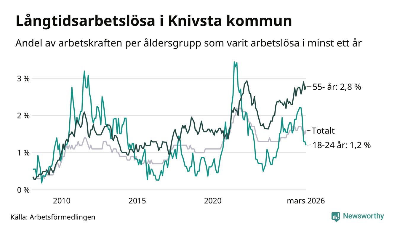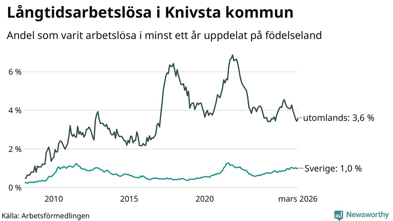 I mars hade 182 Knivstabor varit arbetslösa i minst ett år, vilket är åtta fler än månaden innan. Det är den första månaden sedan oktober 2025 som antalet arbetslösa ökar. 182 personer motsvarar 1,6 procent av arbetskraften i kommunen – andelen långtidsarbetslösa är ungefär på samma nivå som för ett år sedan.