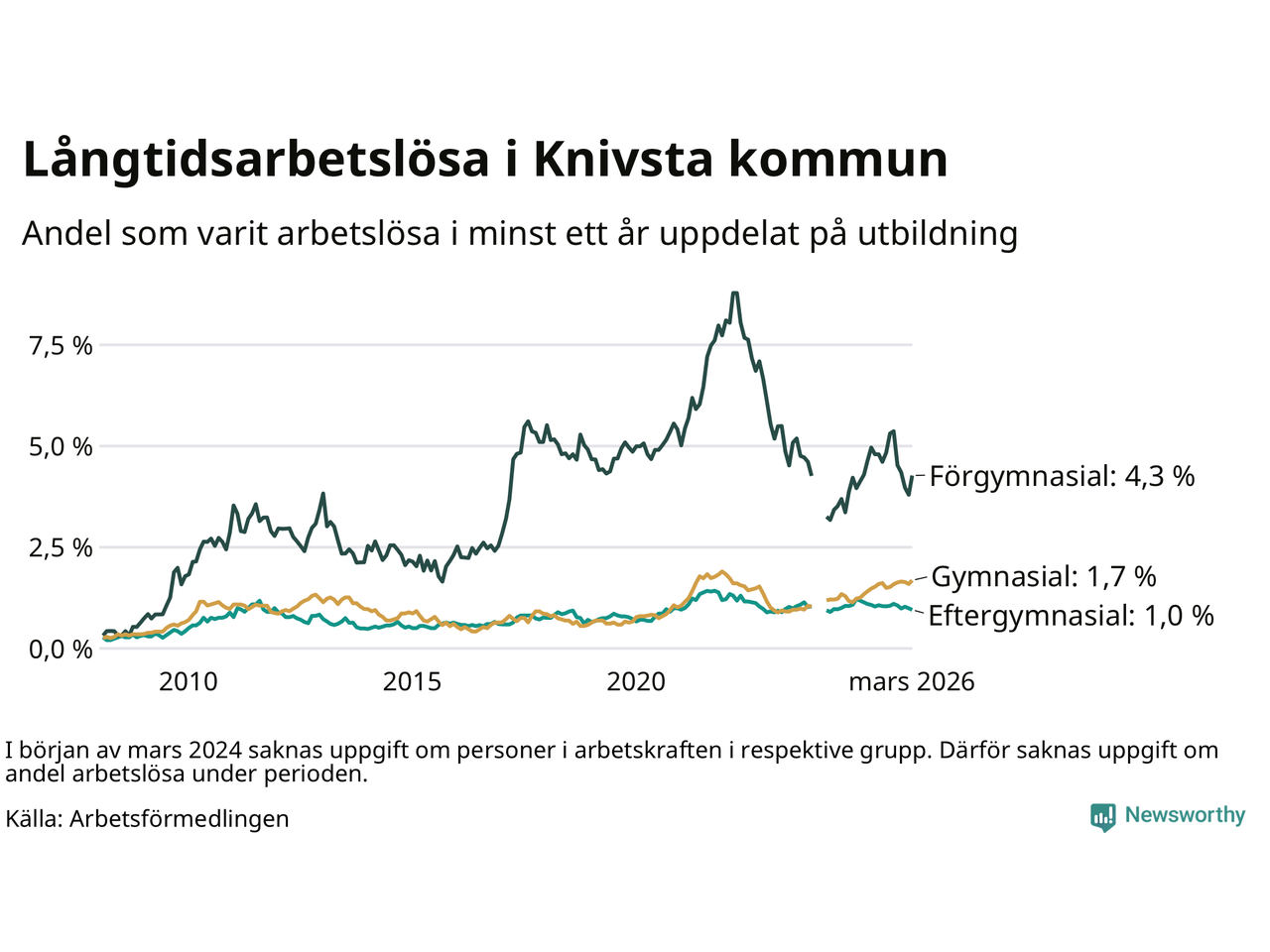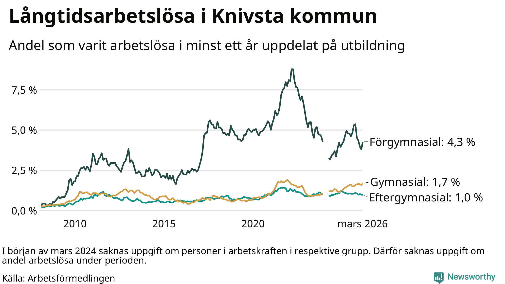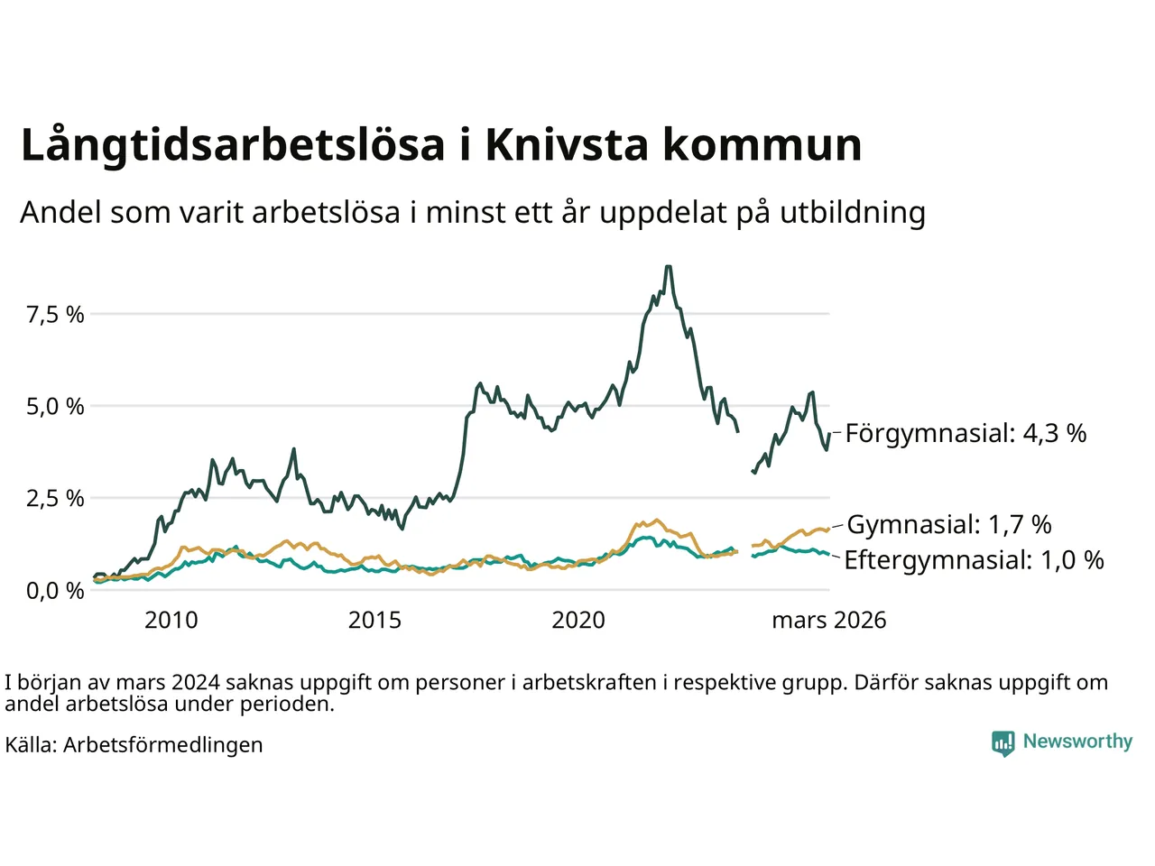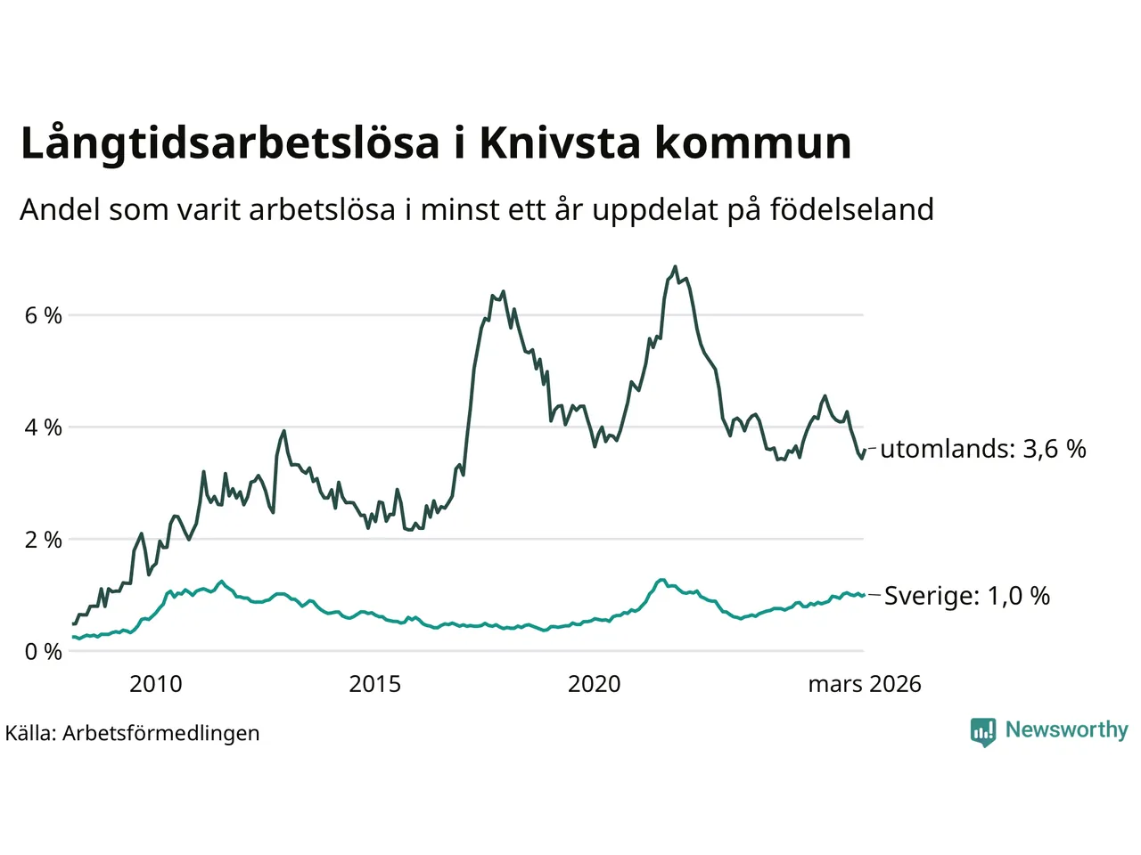 I mars hade 182 Knivstabor varit arbetslösa i minst ett år, vilket är åtta fler än månaden innan. Det är den första månaden sedan oktober 2025 som antalet arbetslösa ökar. 182 personer motsvarar 1,6 procent av arbetskraften i kommunen – andelen långtidsarbetslösa är ungefär på samma nivå som för ett år sedan.