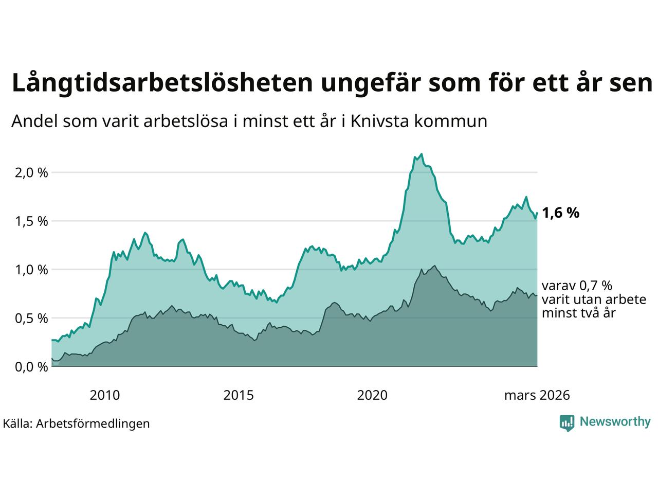 | Andel arbetslösa i minst två år | 0,7 % | 1,3 % | 1,6 % |