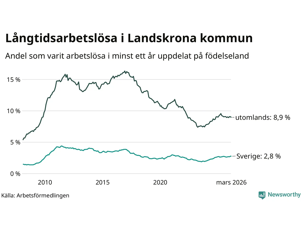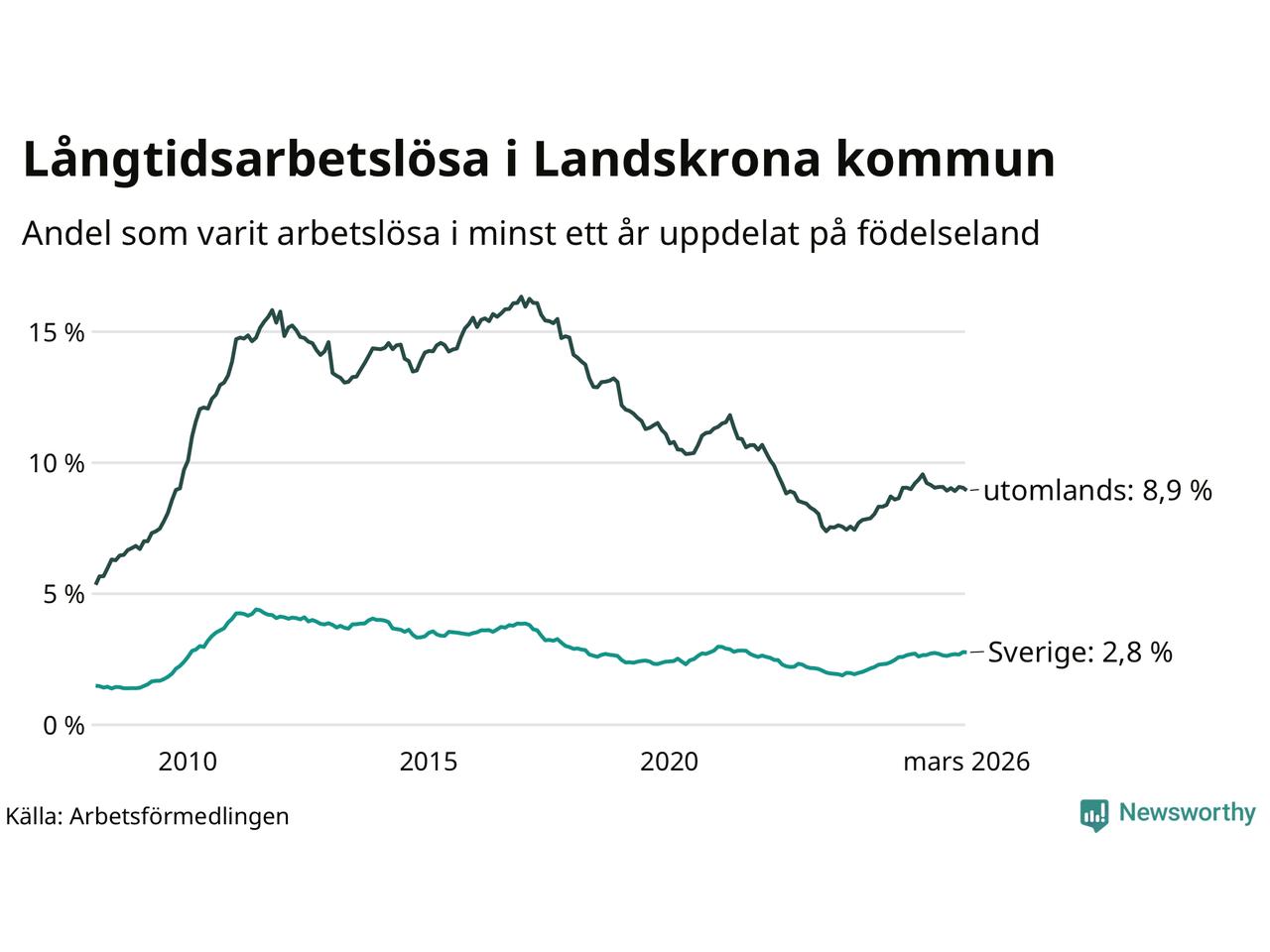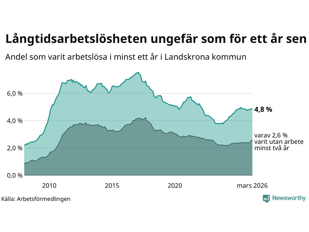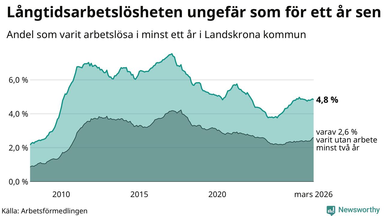 I mars hade 1 103 Landskronabor varit arbetslösa i minst ett år, vilket är tio färre än månaden innan. 1 103 personer motsvarar 4,8 procent av arbetskraften i kommunen – andelen långtidsarbetslösa är ungefär på samma nivå som för ett år sedan. Landskrona tillhör de kommuner som har högst andel långtidsarbetslösa i hela landet just nu.