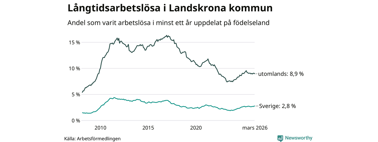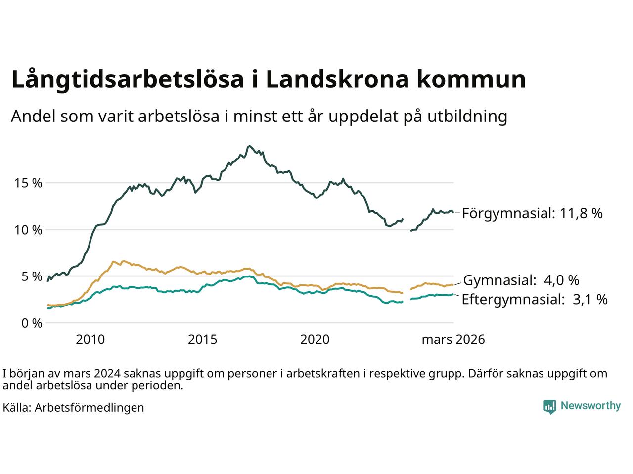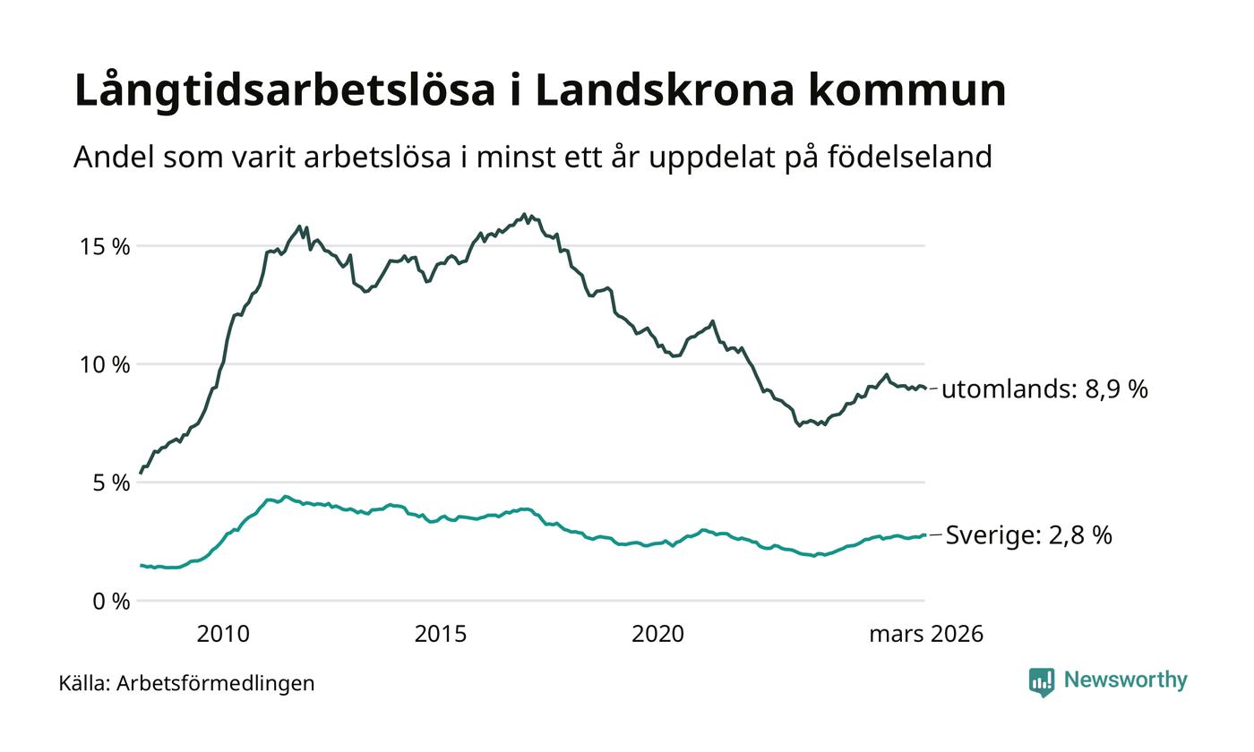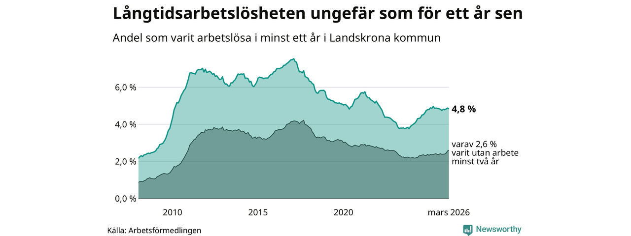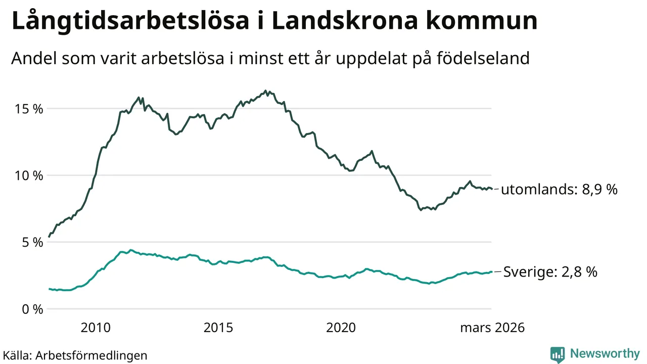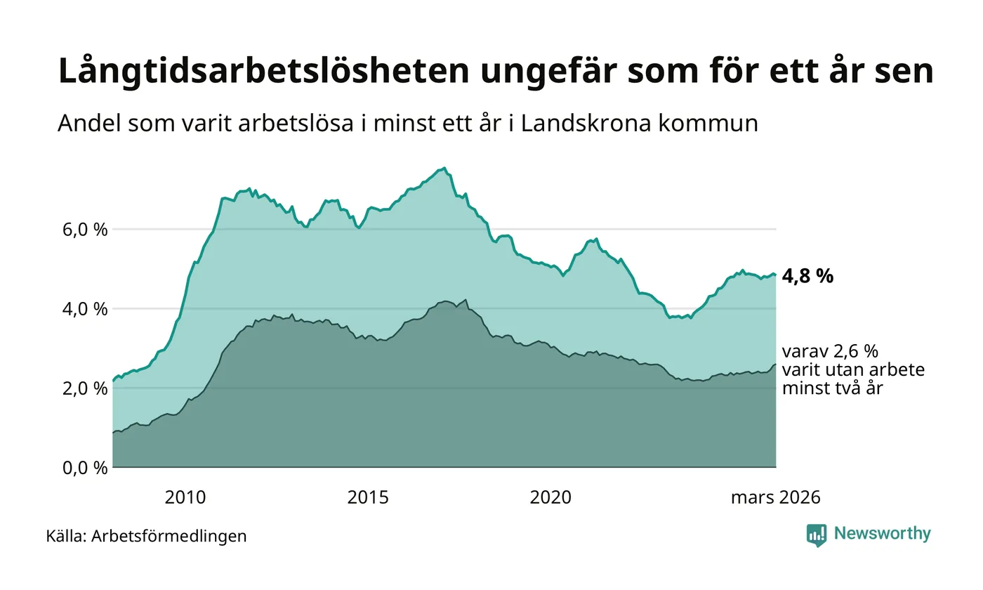 I mars hade 1 103 Landskronabor varit arbetslösa i minst ett år, vilket är tio färre än månaden innan. 1 103 personer motsvarar 4,8 procent av arbetskraften i kommunen – andelen långtidsarbetslösa är ungefär på samma nivå som för ett år sedan. Landskrona tillhör de kommuner som har högst andel långtidsarbetslösa i hela landet just nu.