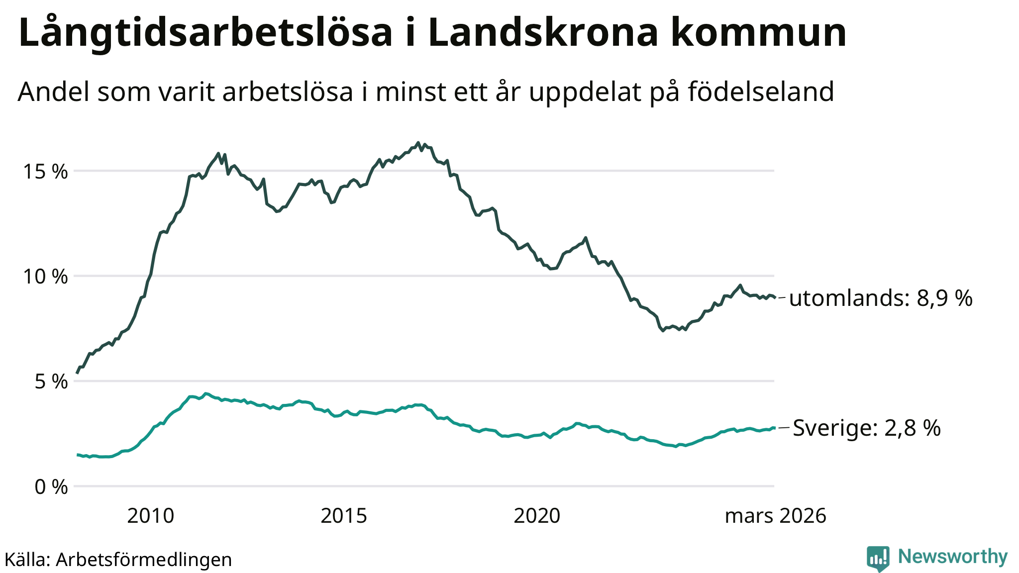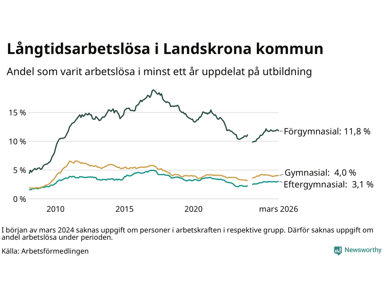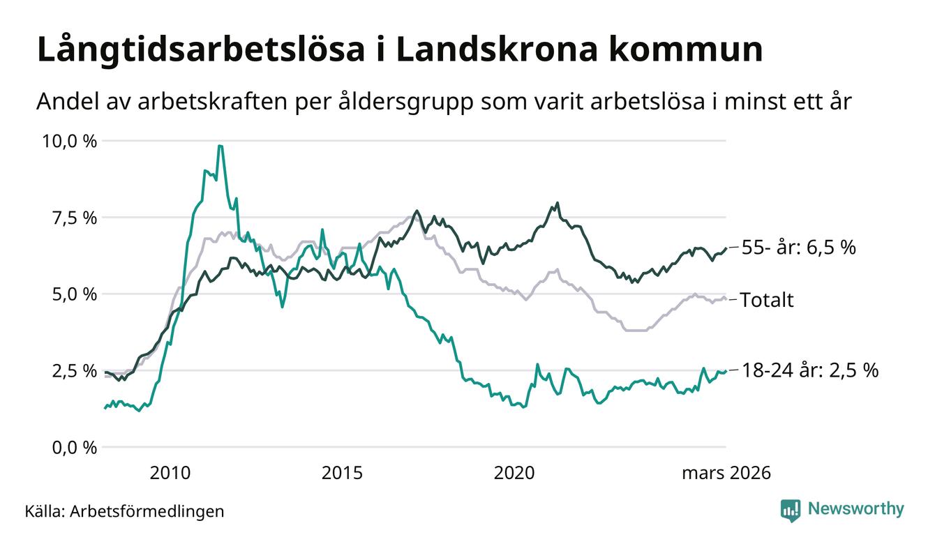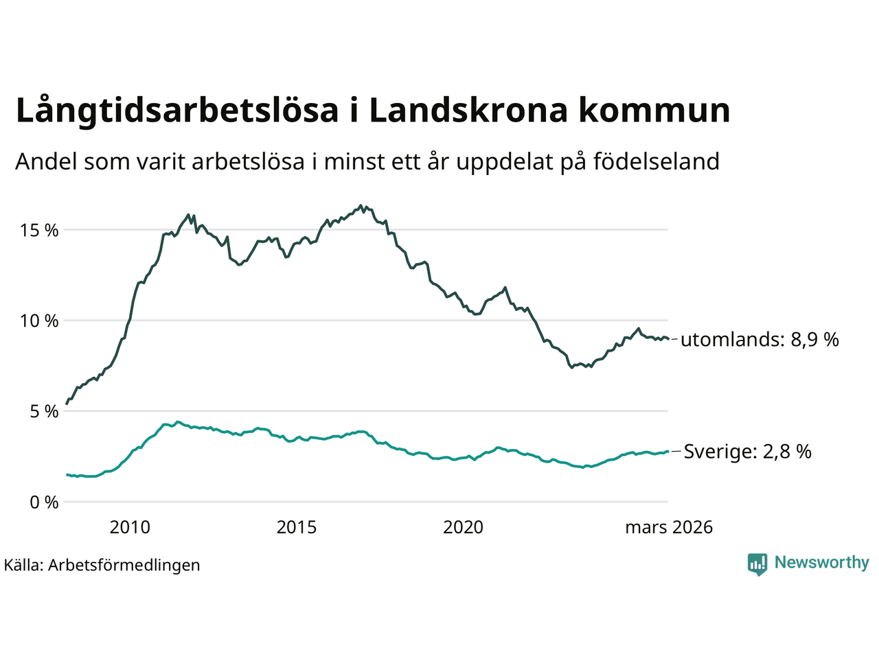 I mars hade 1 103 Landskronabor varit arbetslösa i minst ett år, vilket är tio färre än månaden innan. 1 103 personer motsvarar 4,8 procent av arbetskraften i kommunen – andelen långtidsarbetslösa är ungefär på samma nivå som för ett år sedan. Landskrona tillhör de kommuner som har högst andel långtidsarbetslösa i hela landet just nu.
