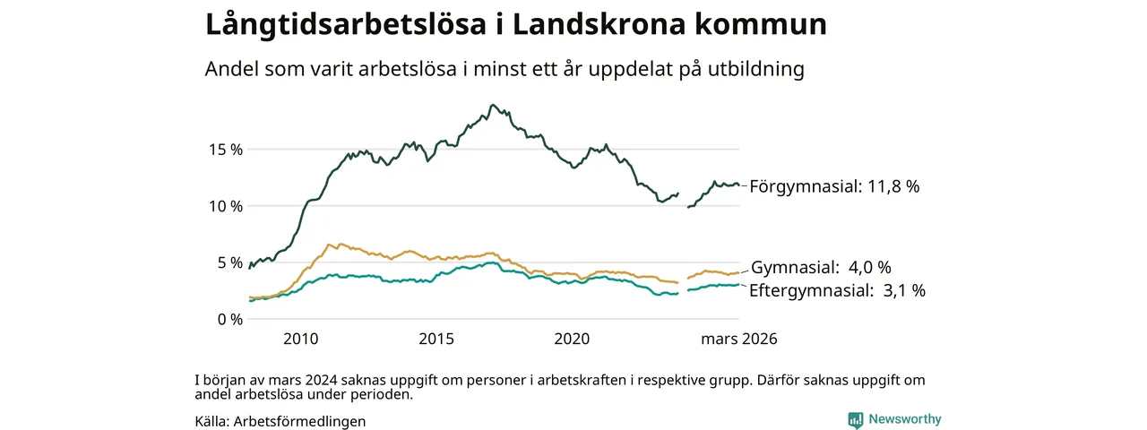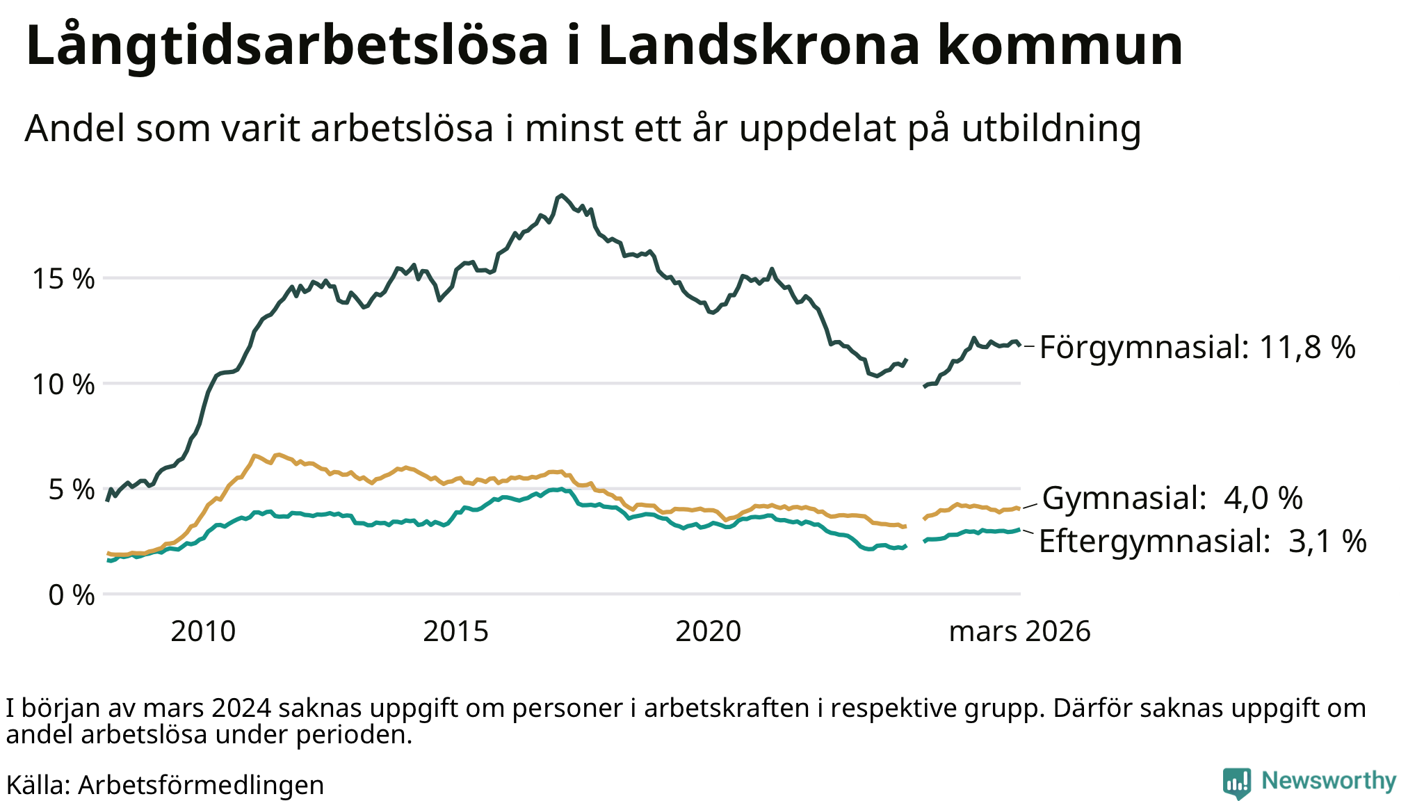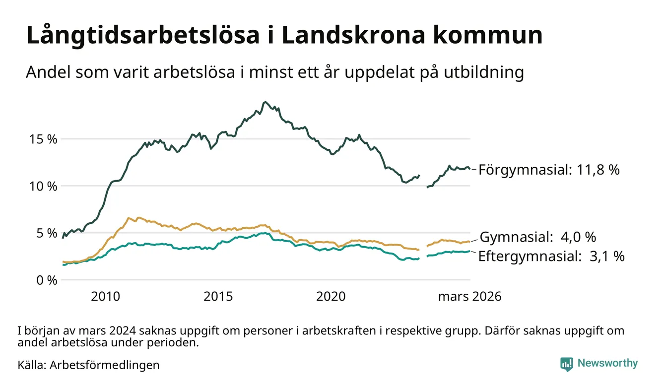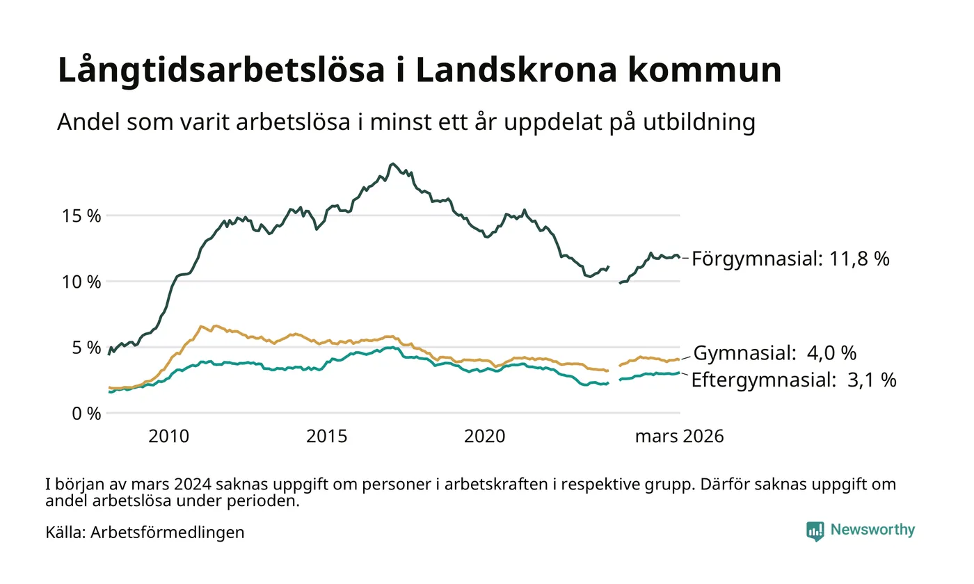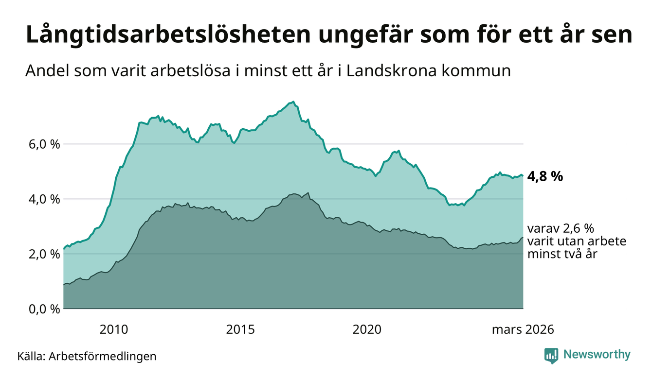 I mars hade 1 103 Landskronabor varit arbetslösa i minst ett år, vilket är tio färre än månaden innan. 1 103 personer motsvarar 4,8 procent av arbetskraften i kommunen – andelen långtidsarbetslösa är ungefär på samma nivå som för ett år sedan. Landskrona tillhör de kommuner som har högst andel långtidsarbetslösa i hela landet just nu.