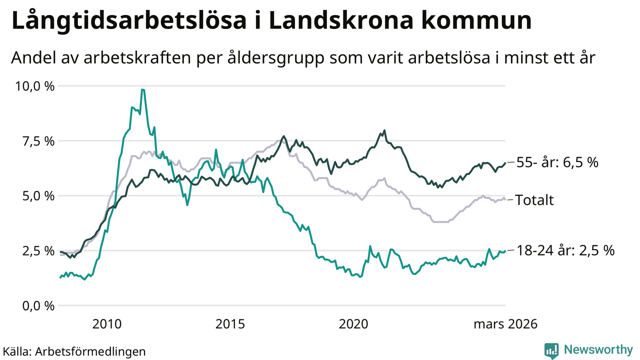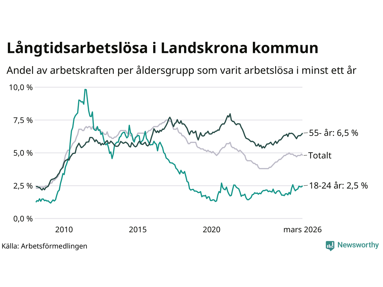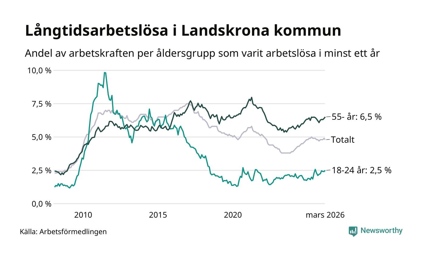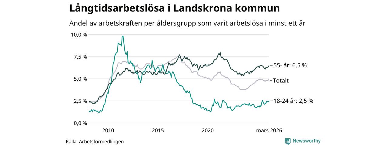 Av de 1 103 personerna som varit arbetslösa i mer än ett år i Landskrona kommun är 325 personer mellan 55 och 661 år och 56 är mellan 18 och 24 år. För den äldre gruppen är andelen arbetslösa 6,5 procent medan den i den yngre gruppen är 2,5 procent. Även i riket som helhet är långtidsarbetslösheten högre i gruppen äldre.