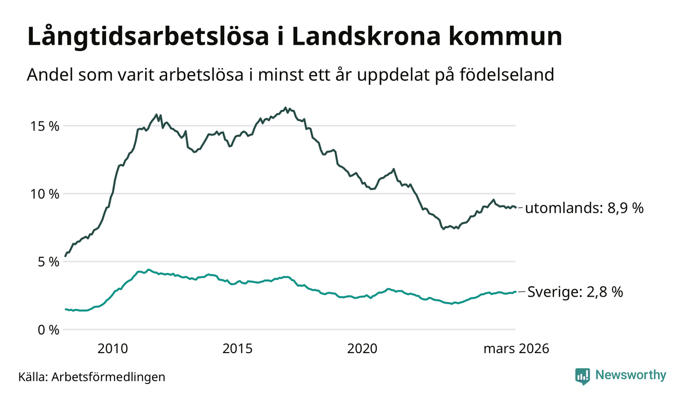 419 av de långtidsarbetslösa i Landskrona är födda i Sverige, medan 684 är födda utomlands. Det innebär att långtidsarbetslösheten bland Sverigefödda är 2,8 procent, medan den är tre gånger så hög – 8,9 procent – bland födda utomlands. Även i riket som helhet är arbetslösheten högre bland utrikesfödda.
