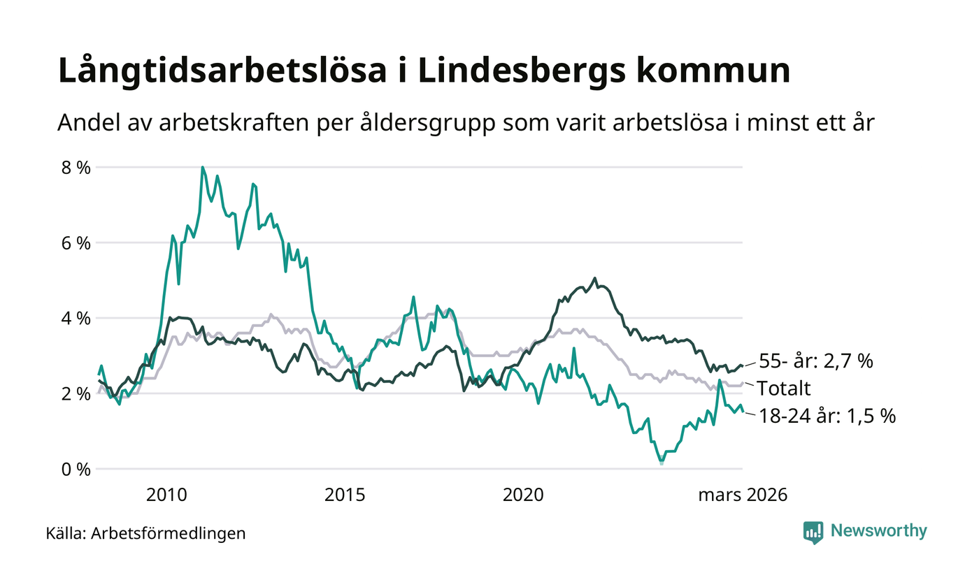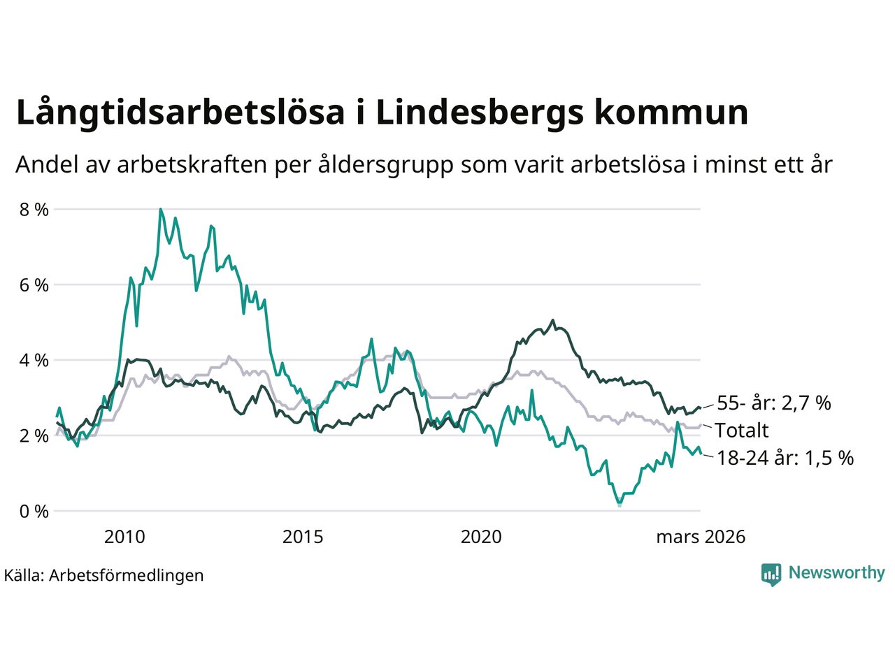 Av de 246 personerna som varit arbetslösa i mer än ett år i Lindesbergs kommun är 72 personer mellan 55 och 661 år och 15 är mellan 18 och 24 år. För den äldre gruppen är andelen arbetslösa 2,7 procent medan den i den yngre gruppen är 1,5 procent. Även i riket som helhet är långtidsarbetslösheten högre i gruppen äldre.