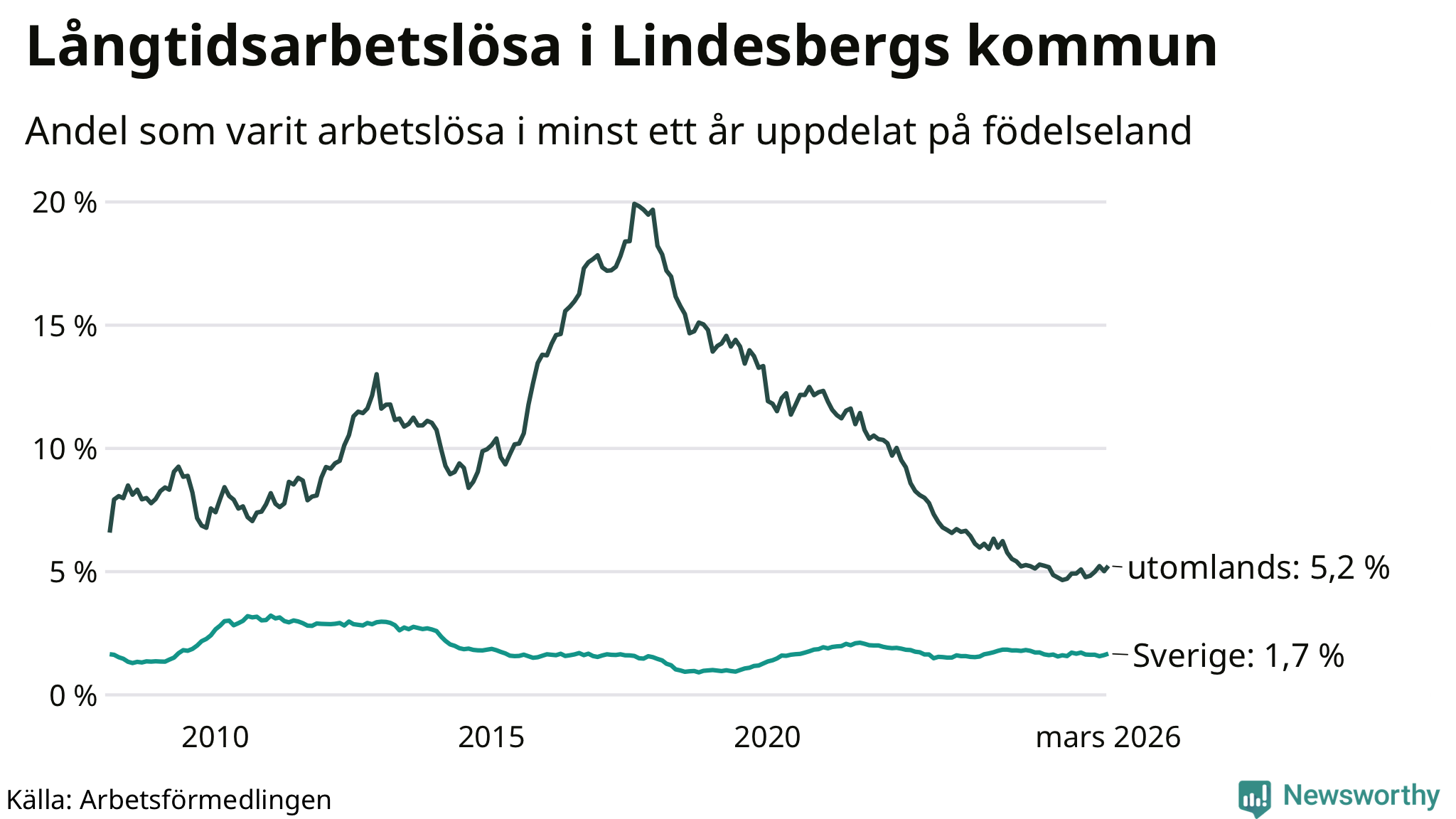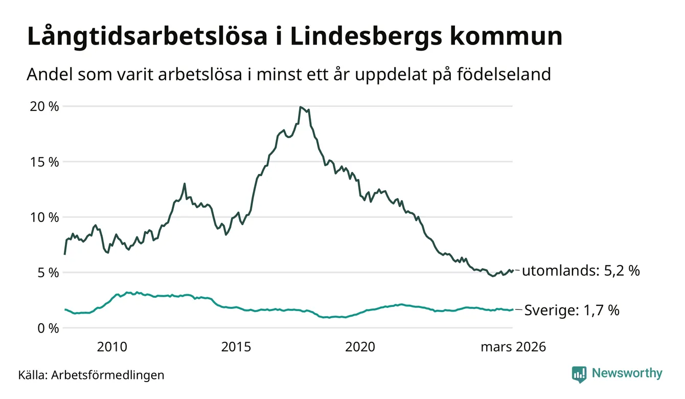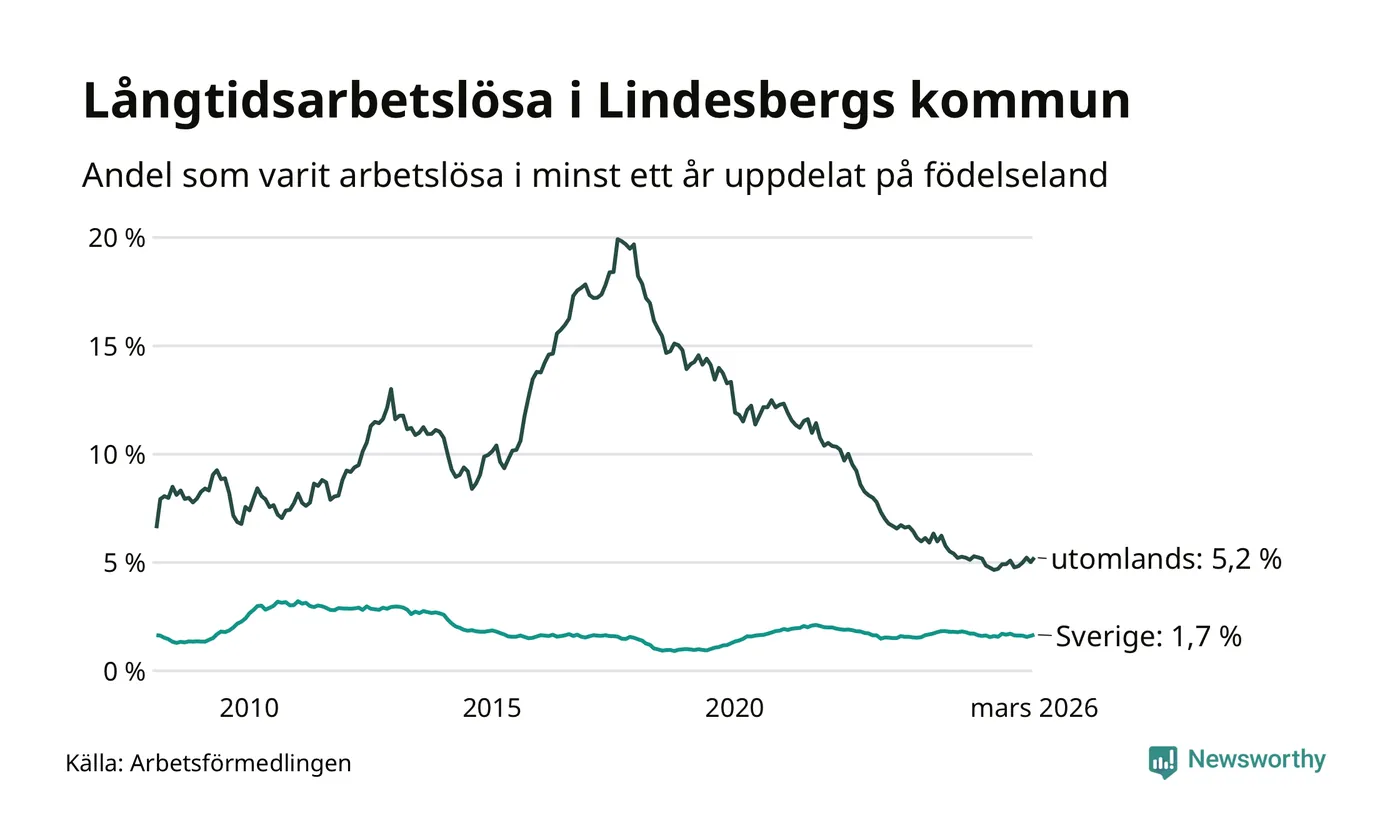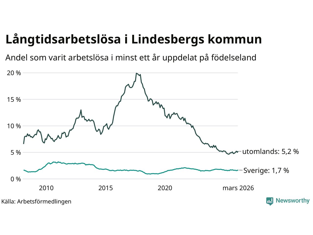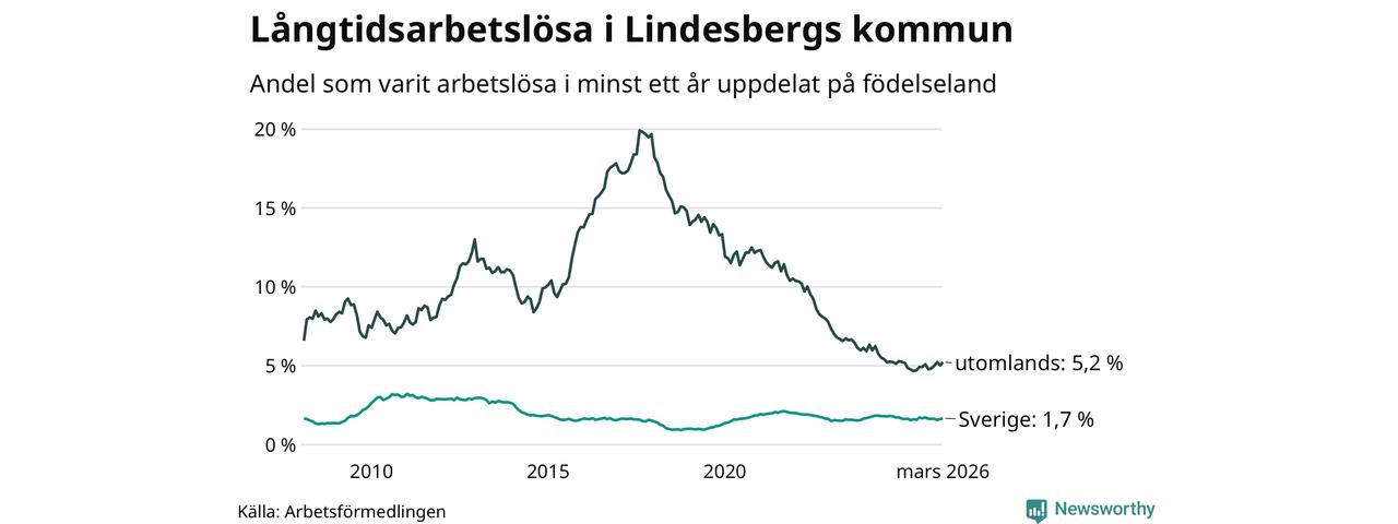 146 av de långtidsarbetslösa i Lindesberg är födda i Sverige, medan 100 är födda utomlands. Det innebär att långtidsarbetslösheten bland Sverigefödda är 1,7 procent, medan den är tre gånger så hög – 5,2 procent – bland födda utomlands. Även i riket som helhet är arbetslösheten högre bland utrikesfödda.