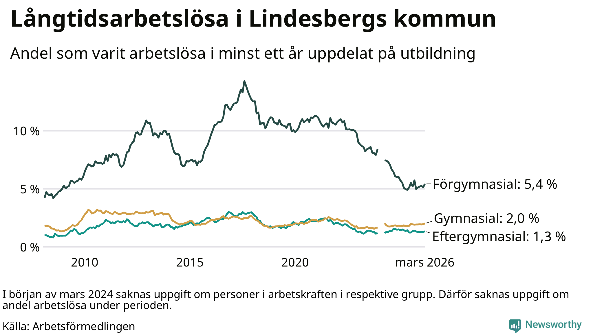 Graf över andel långtidsarbetslösa i Lindesberg uppdelat på utbildningsnivå