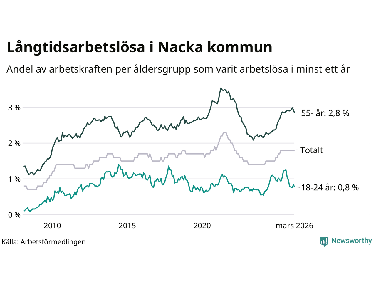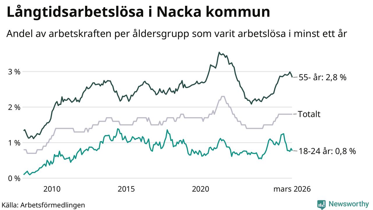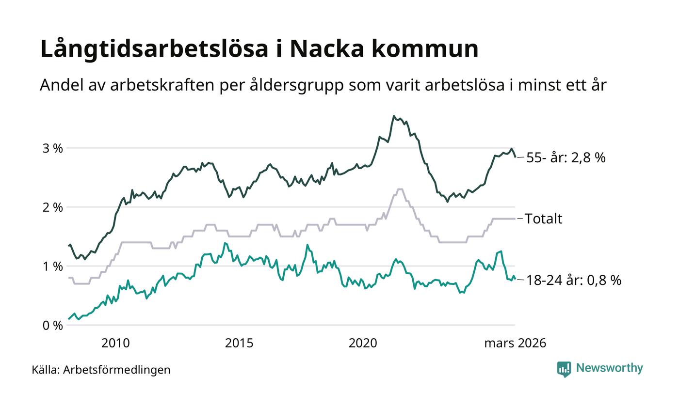 Av de 1 033 personerna som varit arbetslösa i mer än ett år i Nacka kommun är 343 personer mellan 55 och 661 år och 39 är mellan 18 och 24 år. För den äldre gruppen är andelen arbetslösa 2,8 procent medan den i den yngre gruppen är 0,8 procent. Även i riket som helhet är långtidsarbetslösheten högre i gruppen äldre.