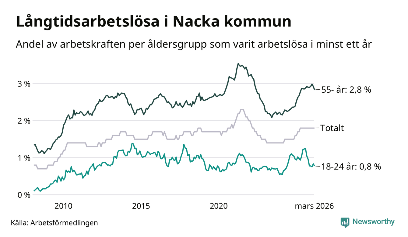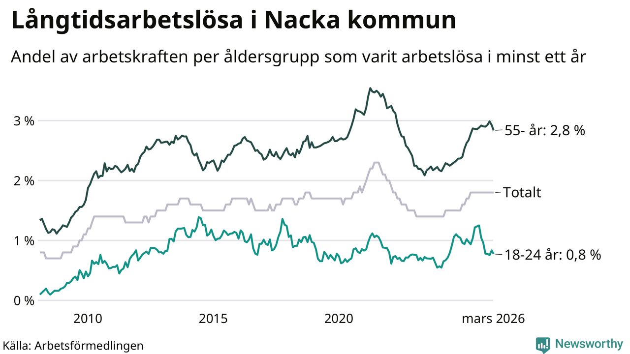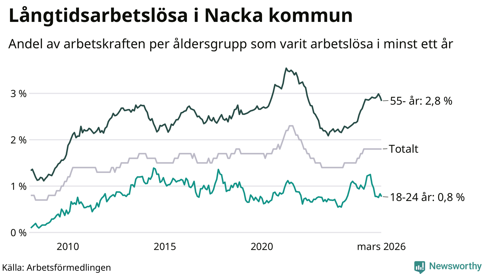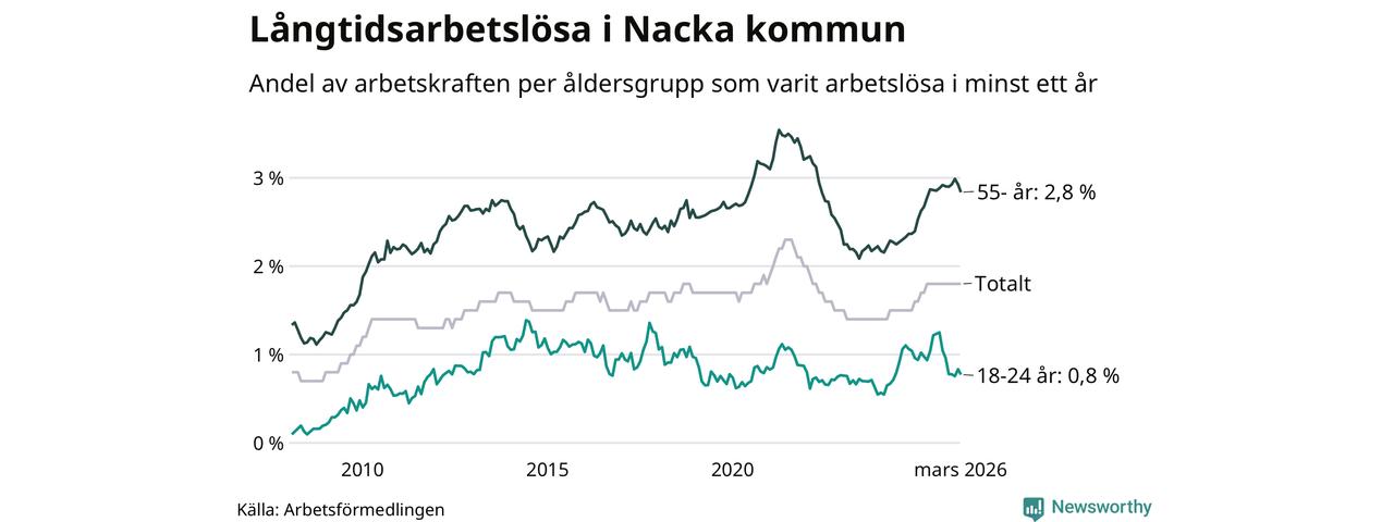 Av de 1 033 personerna som varit arbetslösa i mer än ett år i Nacka kommun är 343 personer mellan 55 och 661 år och 39 är mellan 18 och 24 år. För den äldre gruppen är andelen arbetslösa 2,8 procent medan den i den yngre gruppen är 0,8 procent. Även i riket som helhet är långtidsarbetslösheten högre i gruppen äldre.