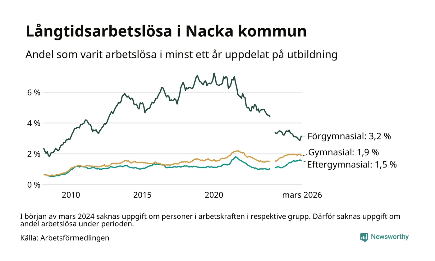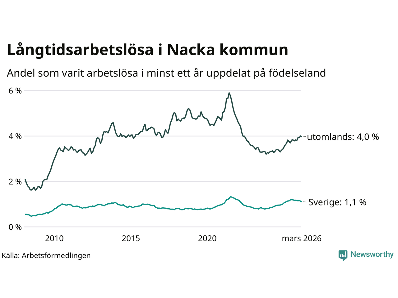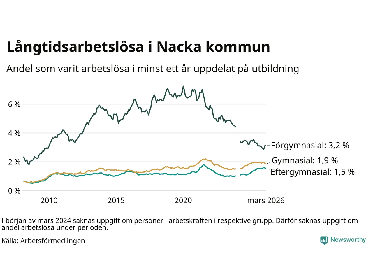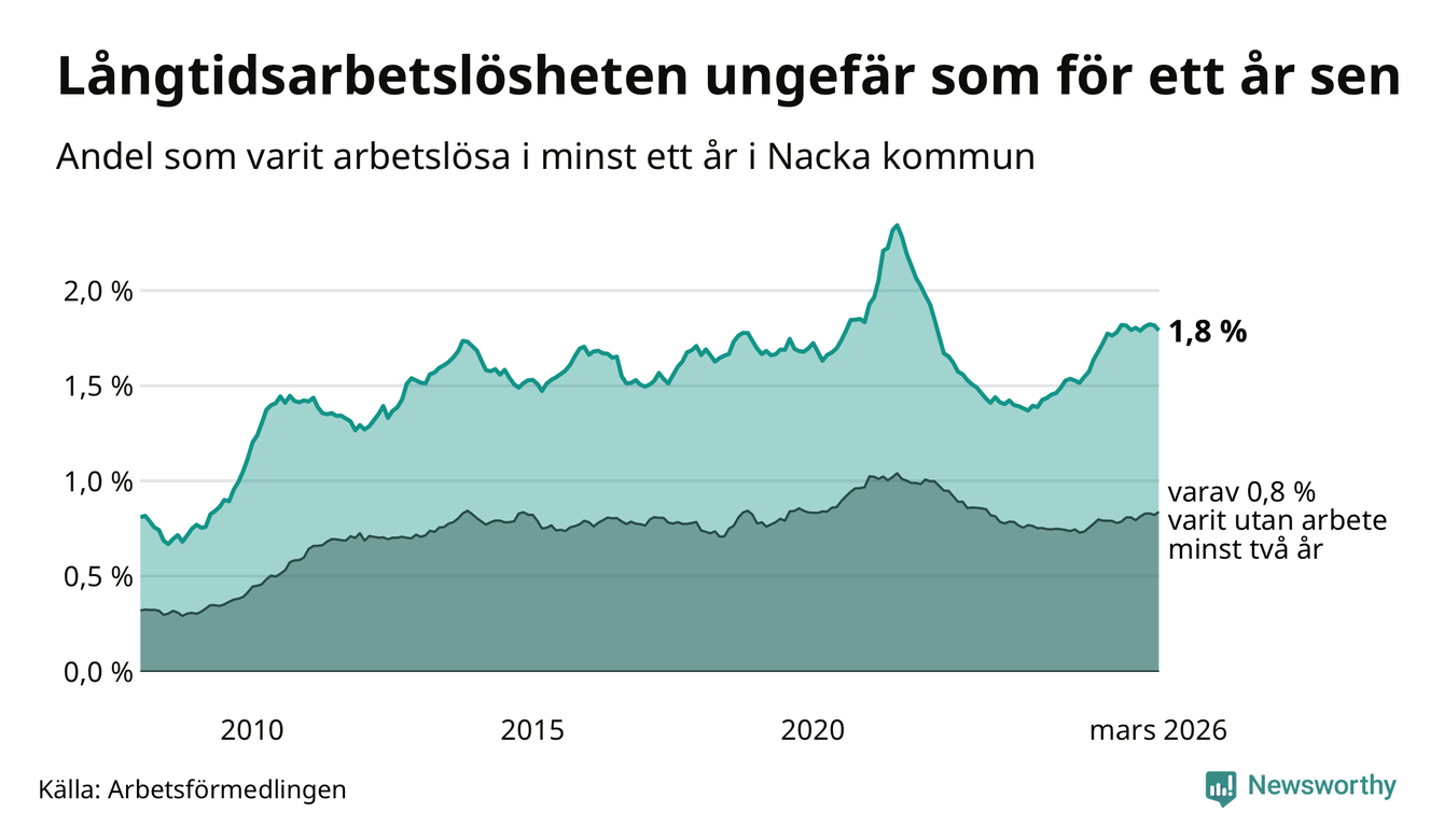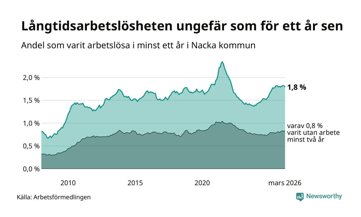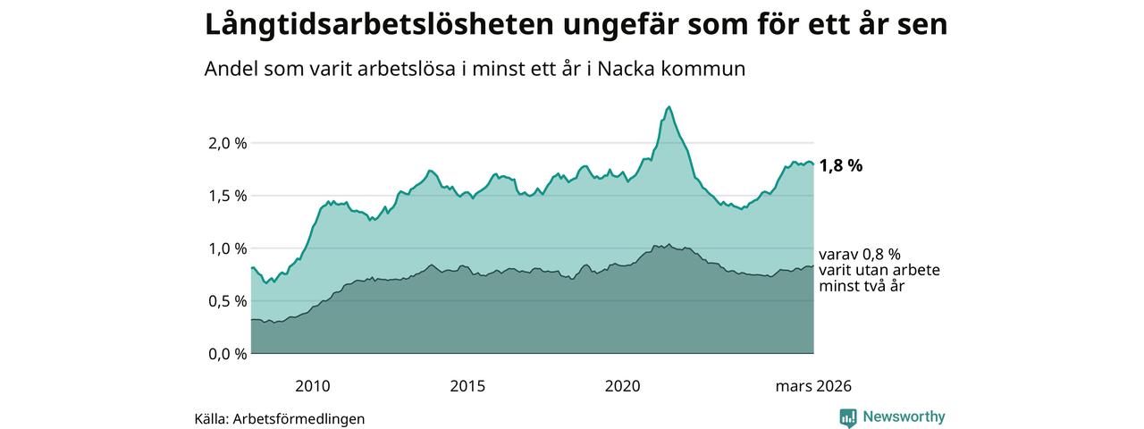 I mars hade 1 033 Nackabor varit arbetslösa i minst ett år, vilket är 14 färre än månaden innan. 1 033 personer motsvarar 1,8 procent av arbetskraften i kommunen – andelen långtidsarbetslösa är ungefär på samma nivå som för ett år sedan.