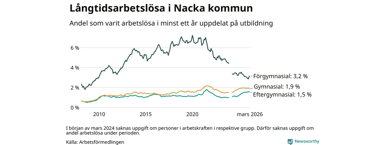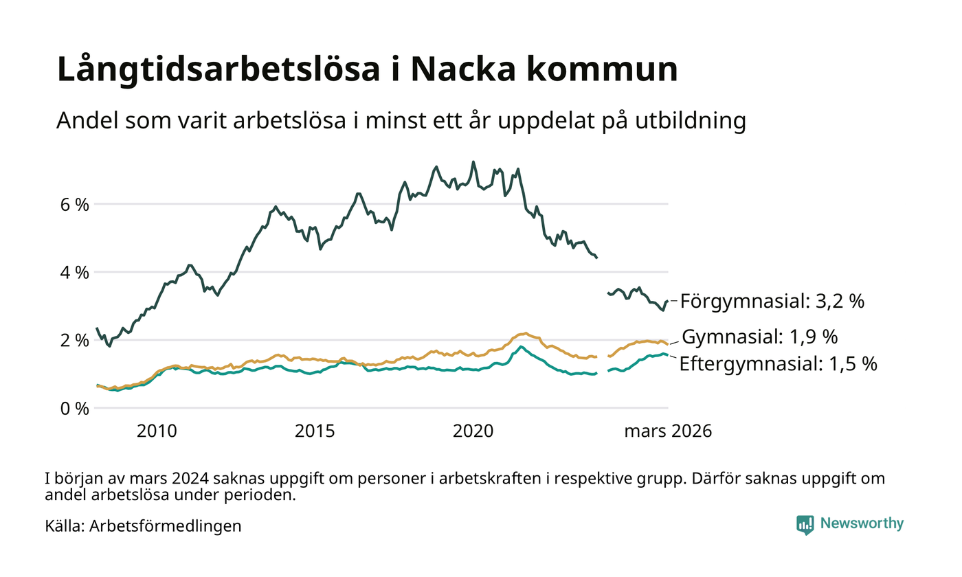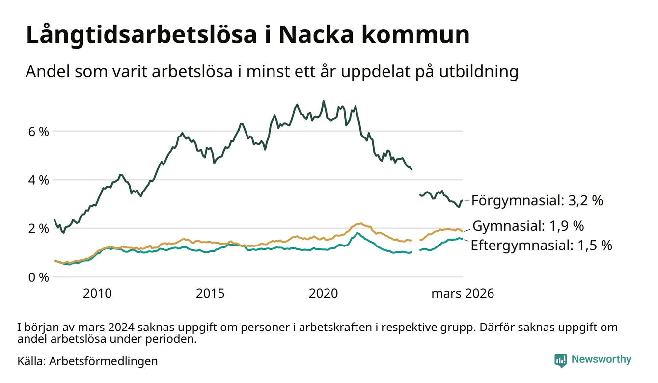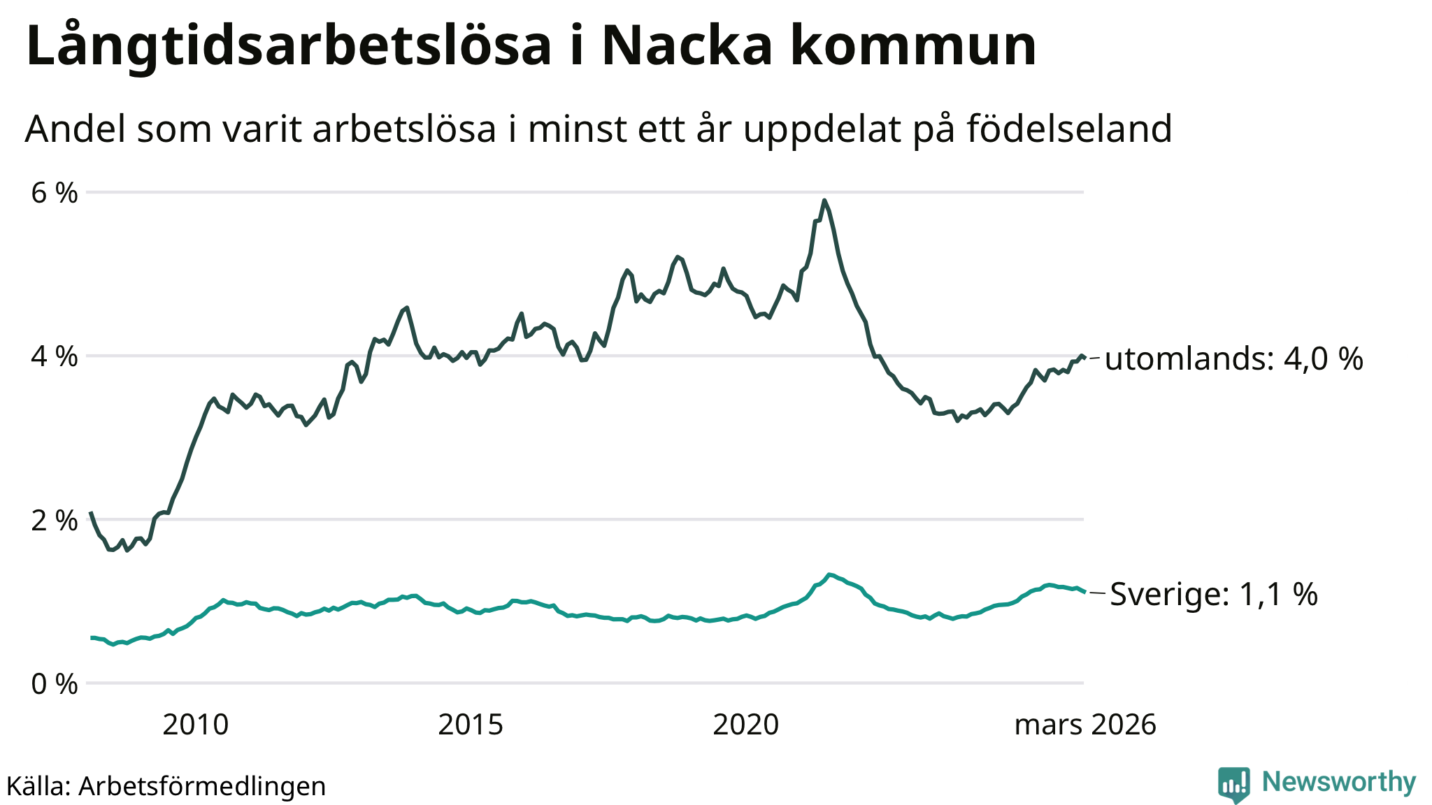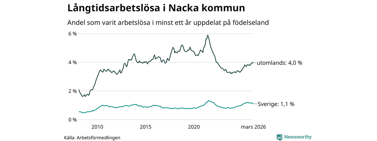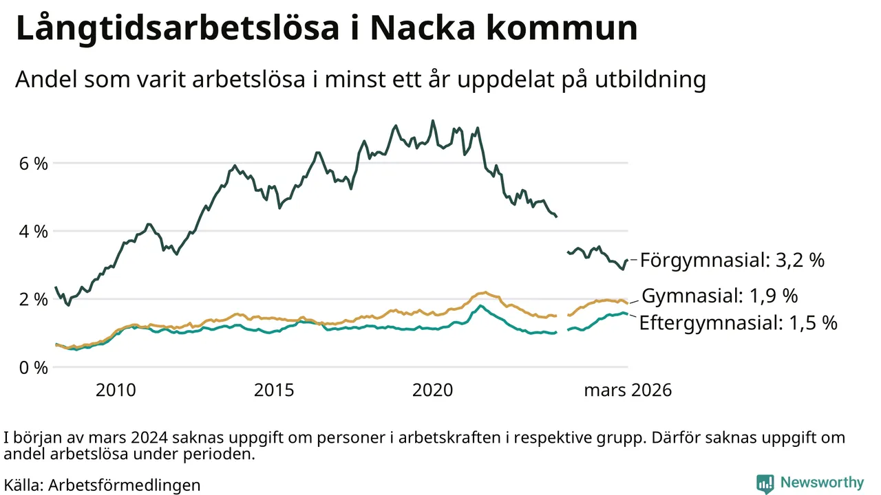 I mars hade 1 033 Nackabor varit arbetslösa i minst ett år, vilket är 14 färre än månaden innan. 1 033 personer motsvarar 1,8 procent av arbetskraften i kommunen – andelen långtidsarbetslösa är ungefär på samma nivå som för ett år sedan.