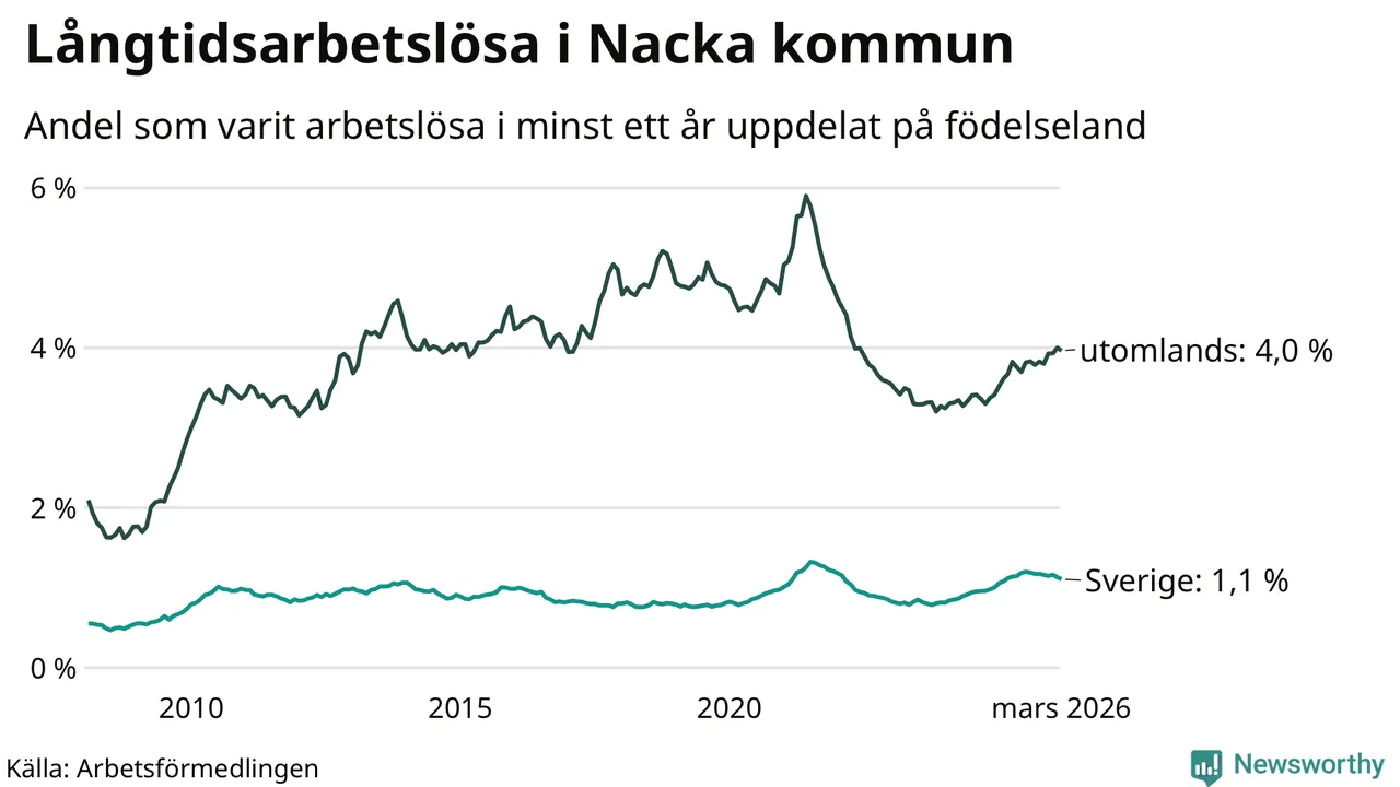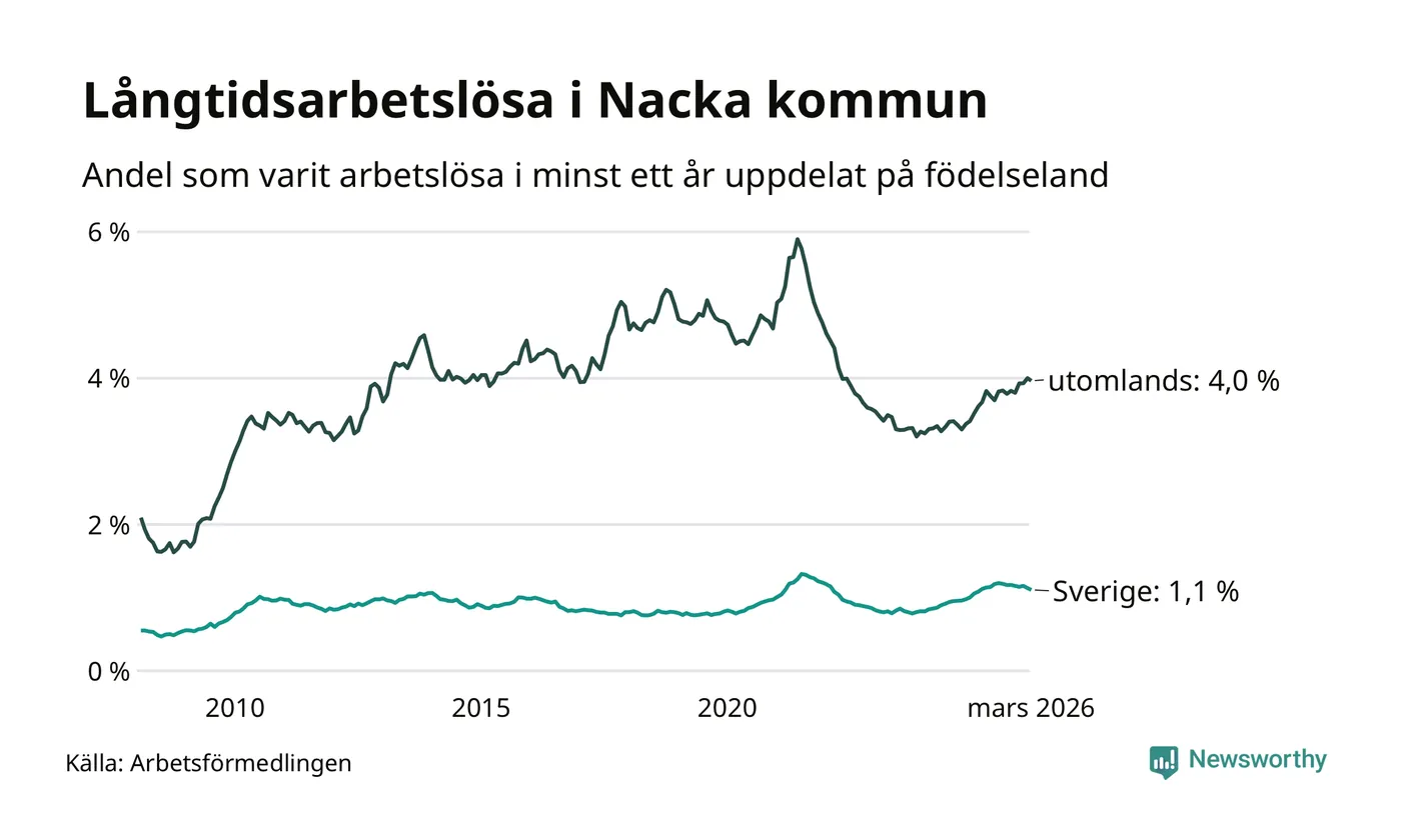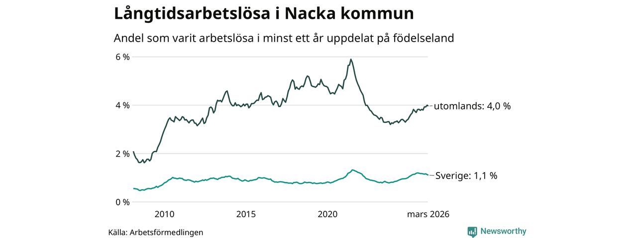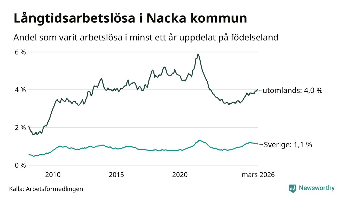 486 av de långtidsarbetslösa i Nacka är födda i Sverige, medan 547 är födda utomlands. Det innebär att långtidsarbetslösheten bland Sverigefödda är 1,1 procent, medan den är fyra gånger så hög – 4,0 procent – bland födda utomlands. Även i riket som helhet är arbetslösheten högre bland utrikesfödda.